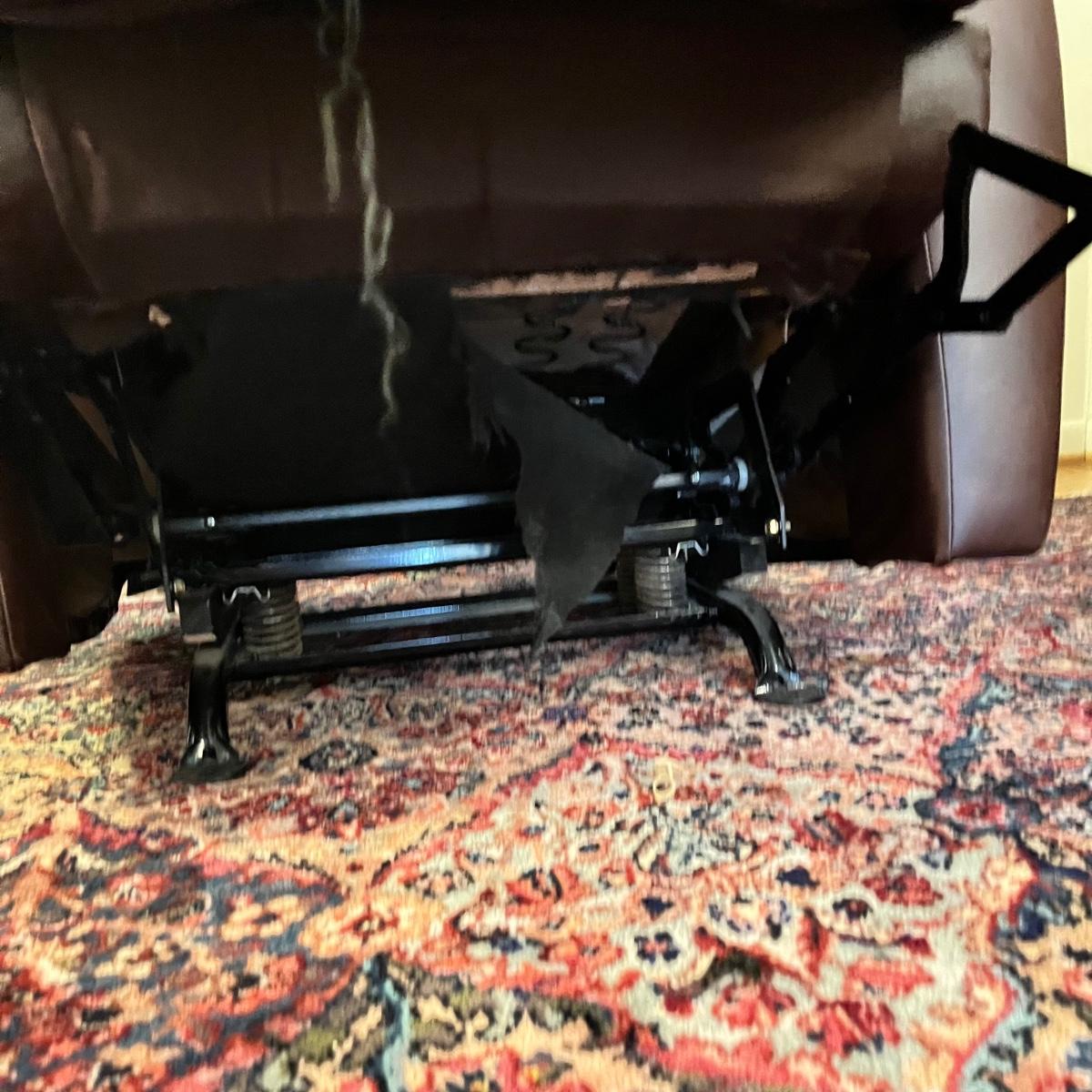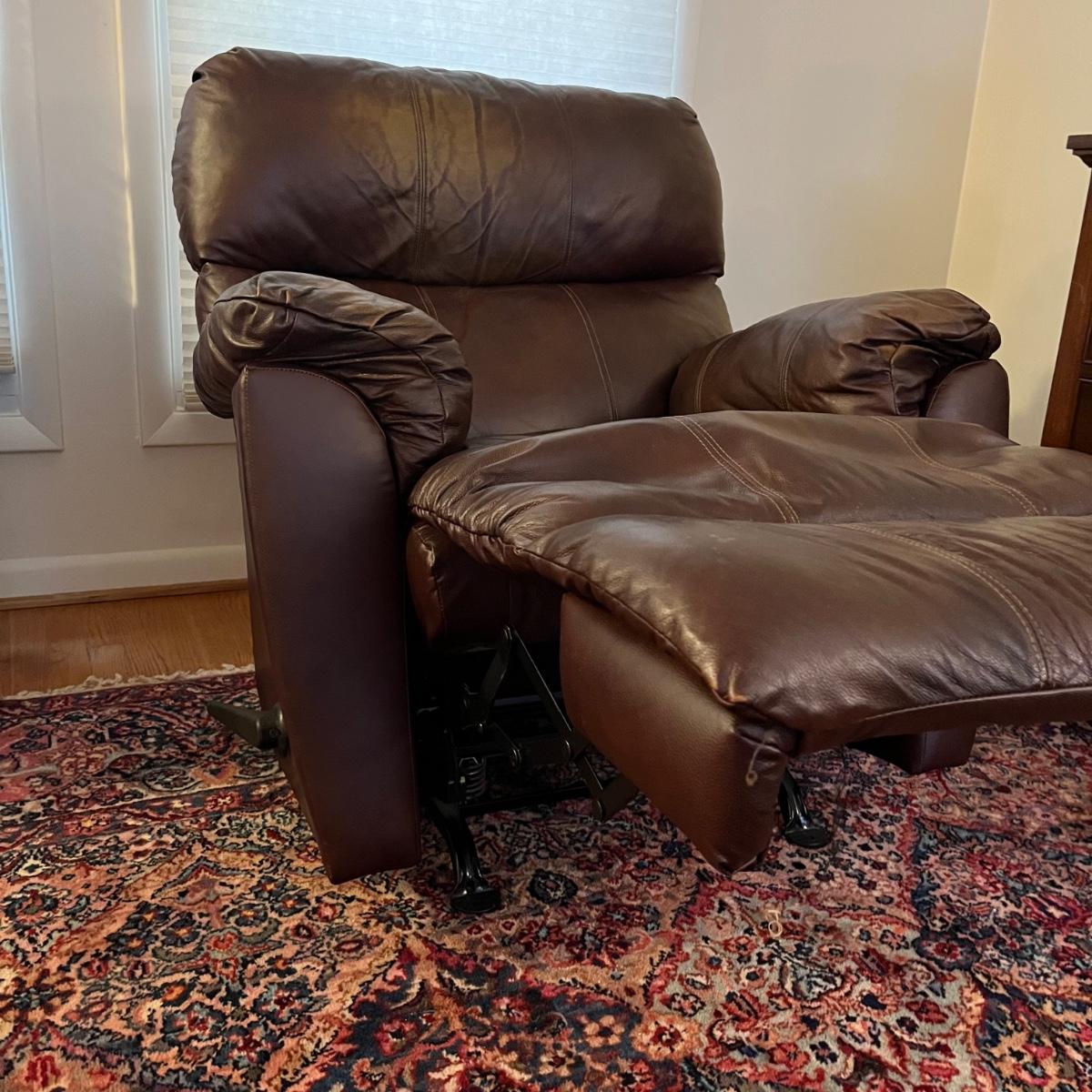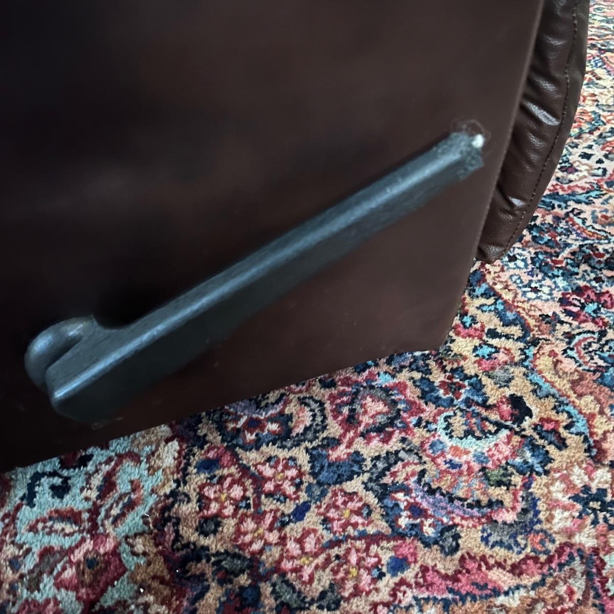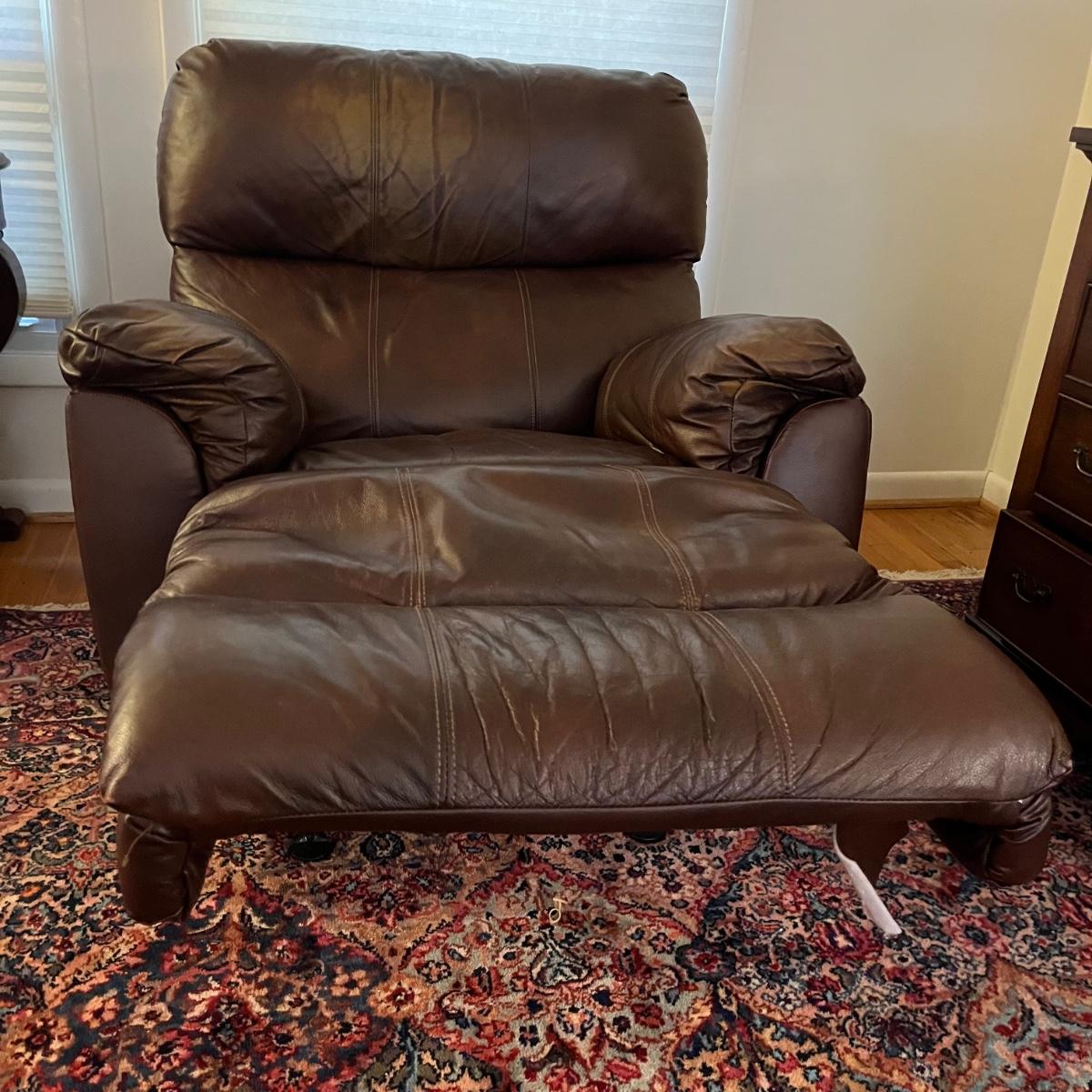 Lot includes a recliner by Lane industries that is leather and vinyl. Recliner measures 37” x 39” x 39” with a seat height of 18”. Recliner measures 66” long when open. Bring help item is substantial. Recliner has wear by the top where your head rest and handle has chew marks, see pictures.