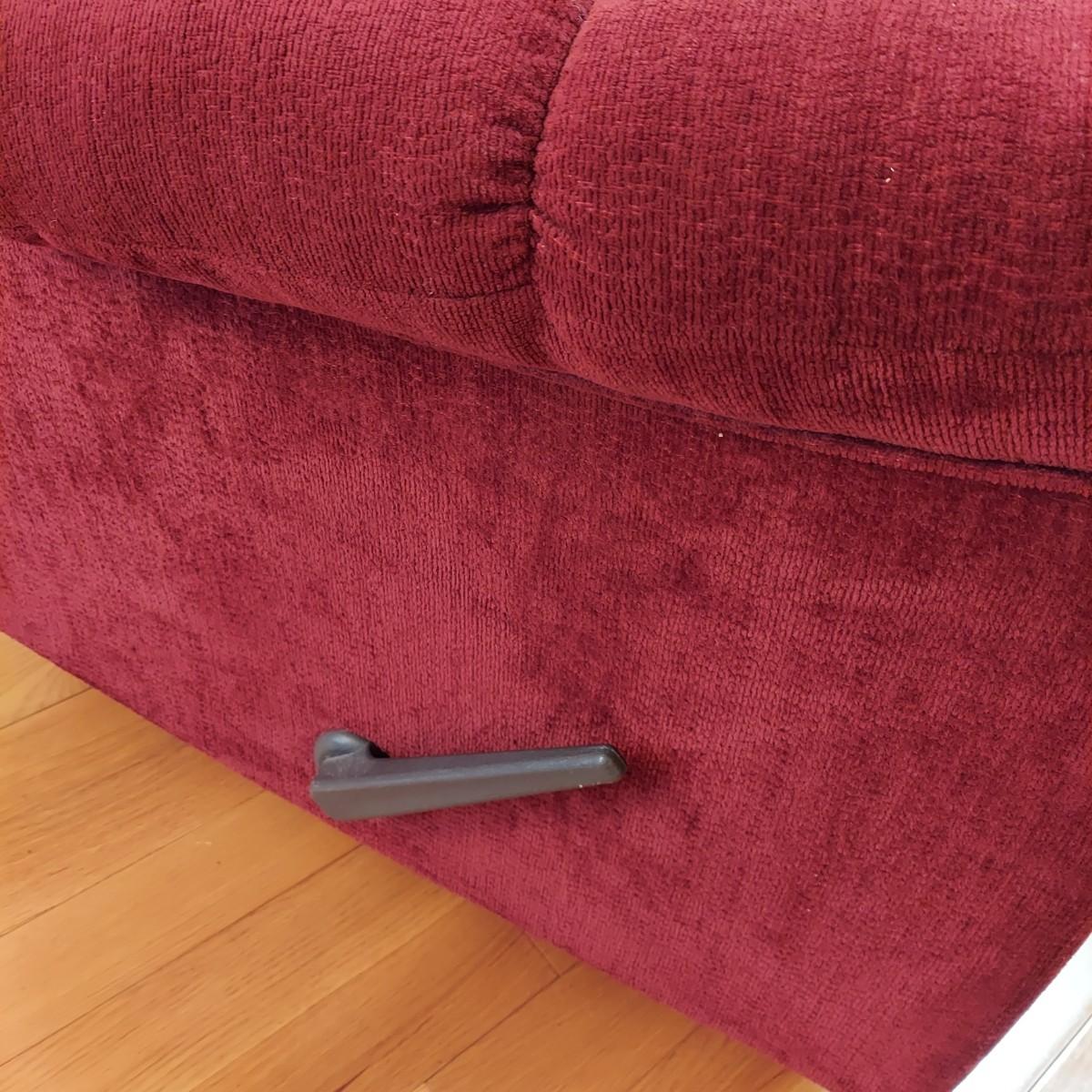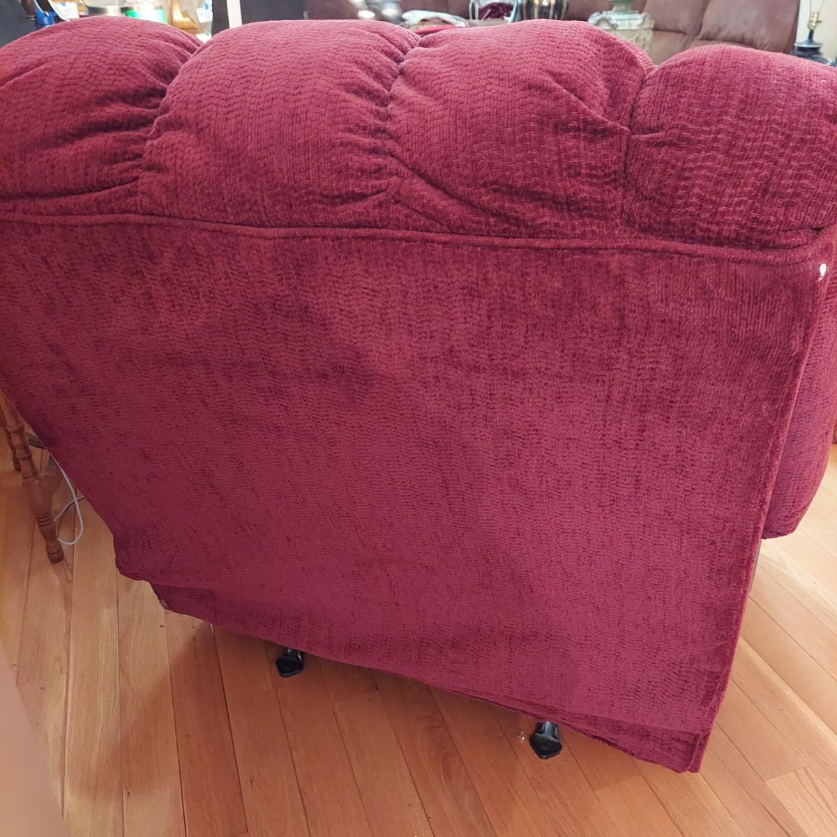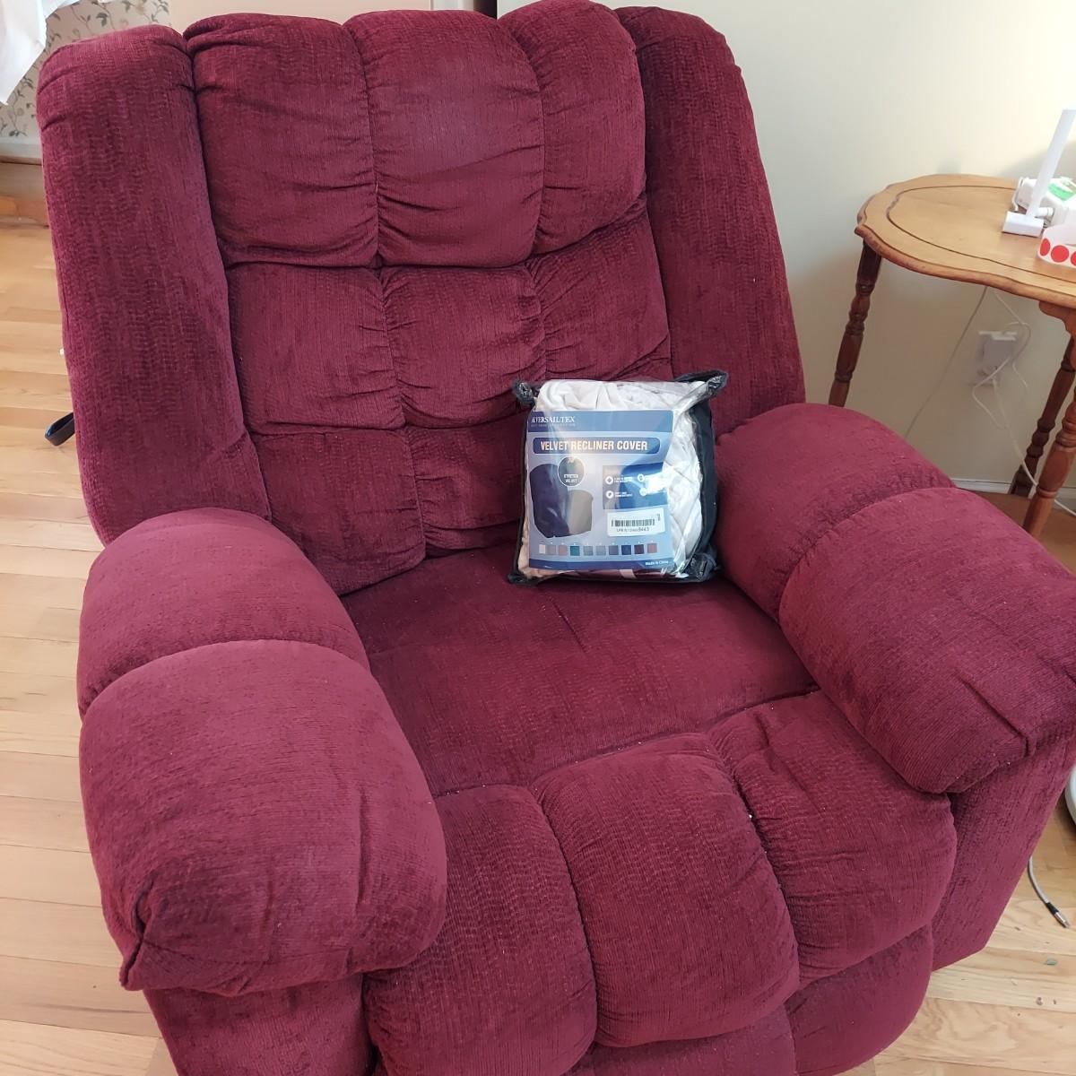 Oversized burgundy recliner that measures 38” x 43” x 40"H with a 20” seat height. Has small rip on footrest. Also includes an elastic slipcover that appears to be new in the package. It comes with instructions. Please see photos for details. Local Pickup Only.