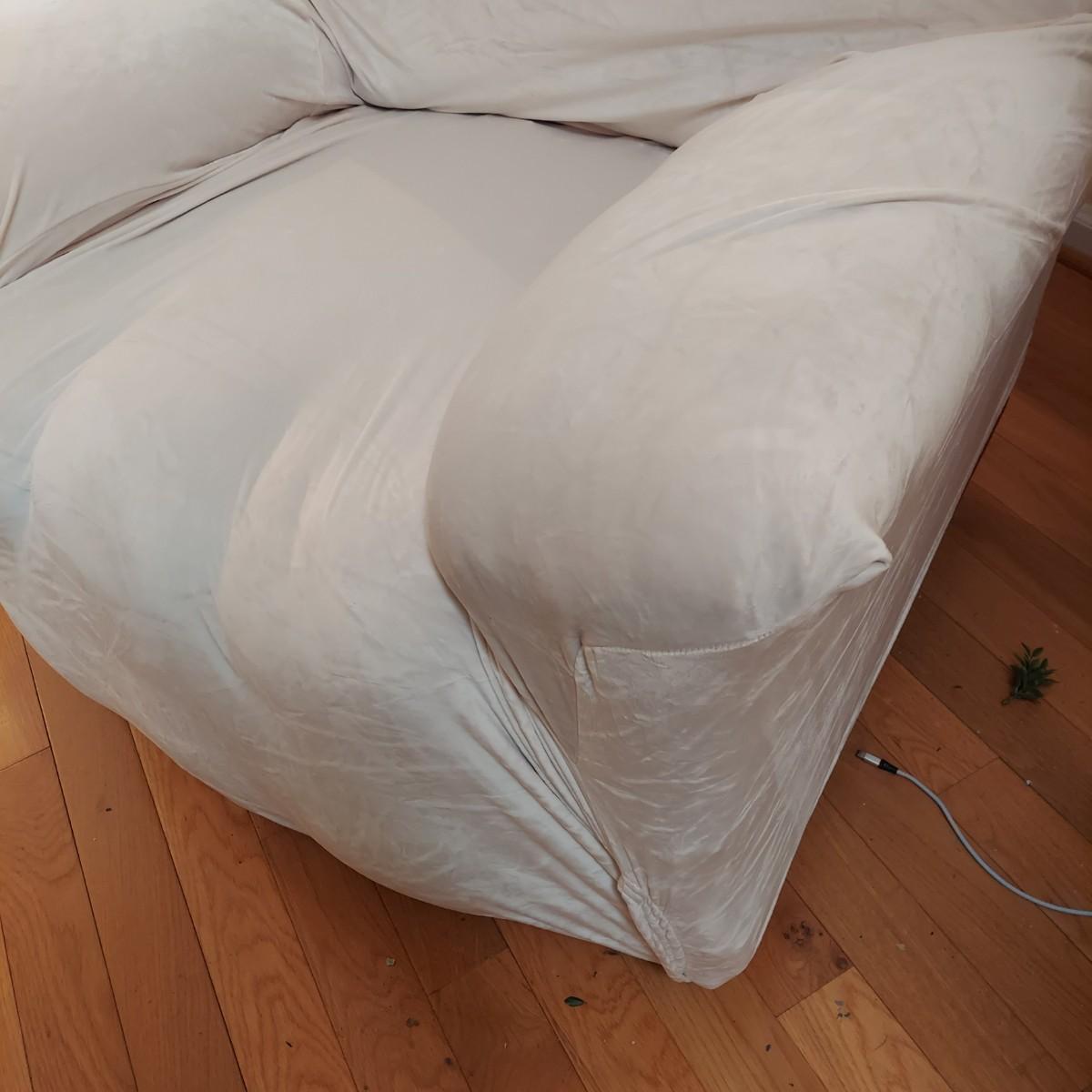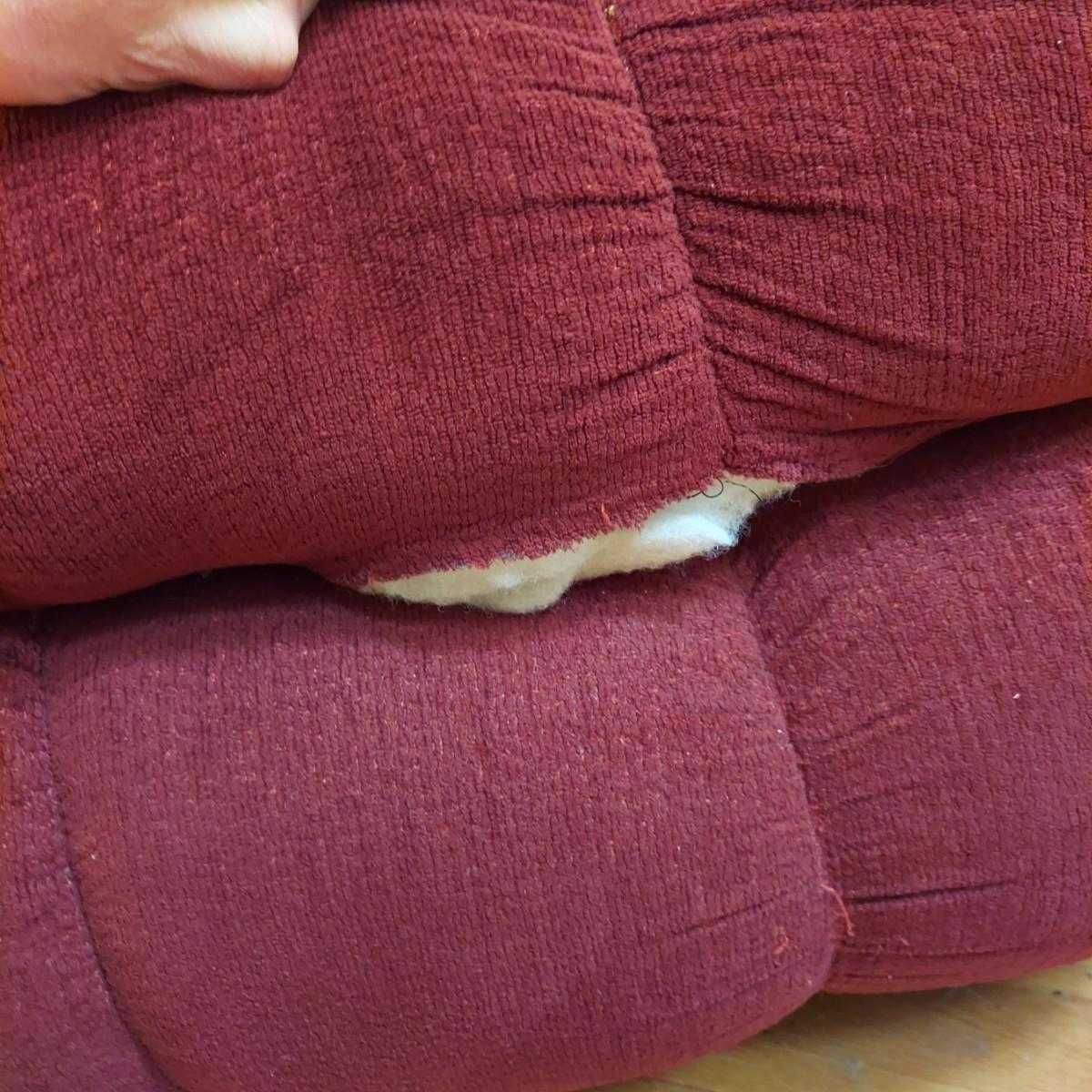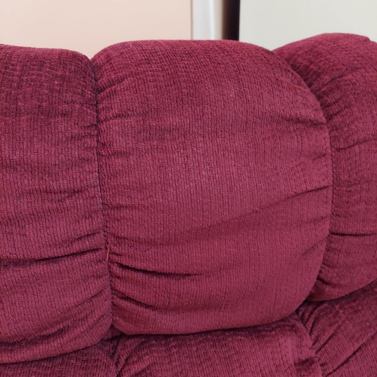 Oversized burgundy recliner that measures 38” x 43” x 40"H with a 20” seat height. Has small rip on footrest. Also includes an elastic slipcover that appears to be new in the package. It comes with instructions. Please see photos for details. Local Pickup Only.