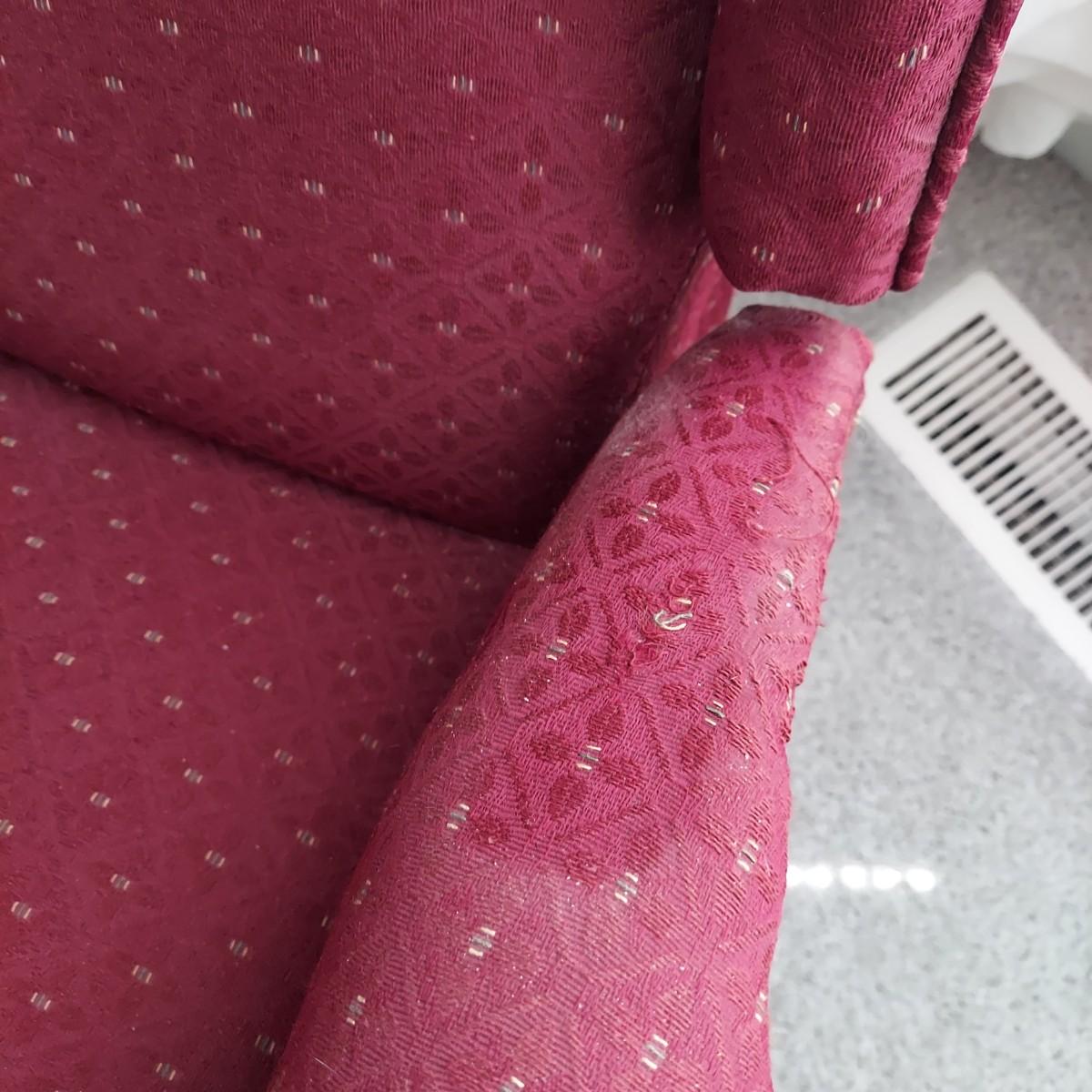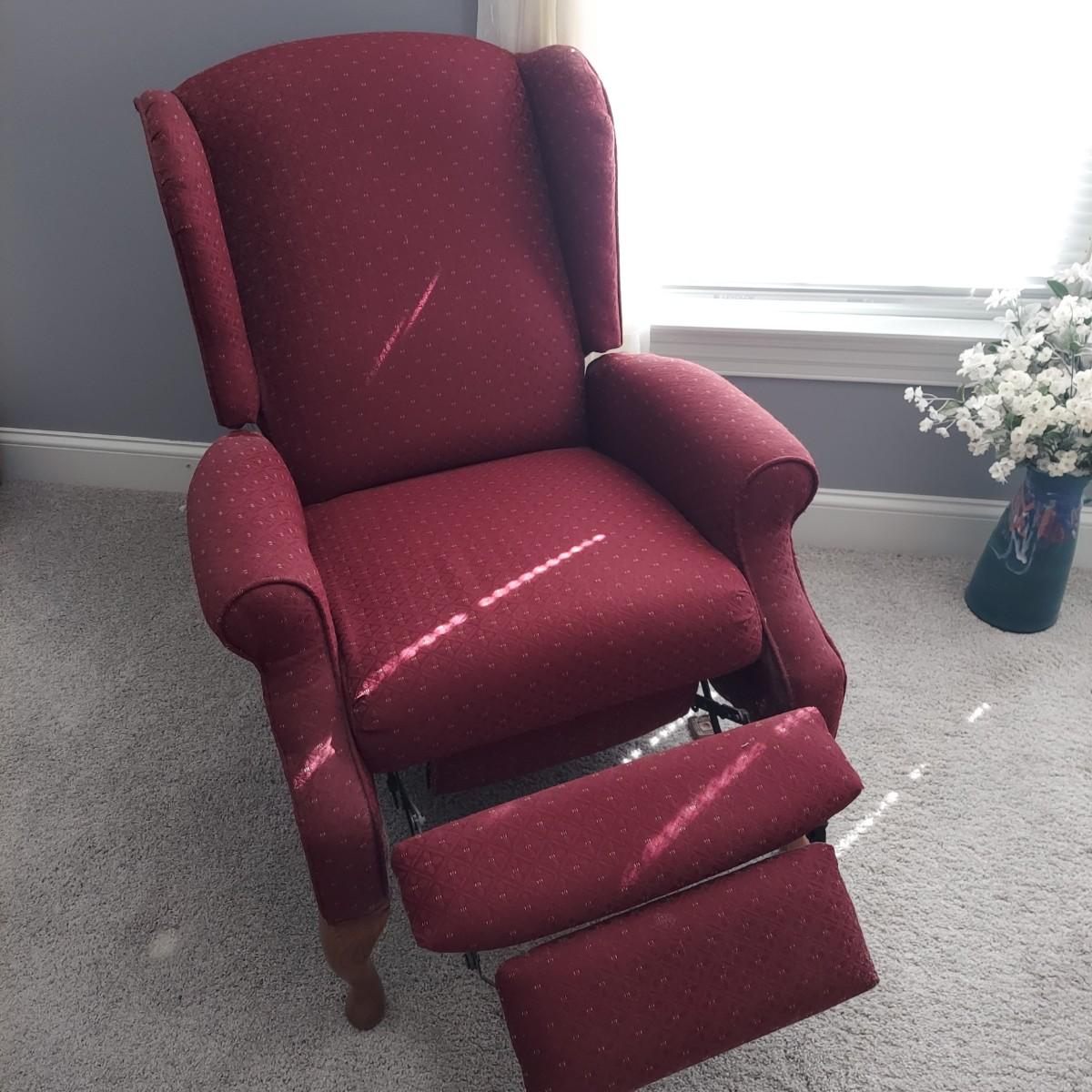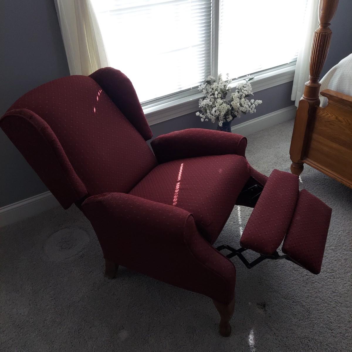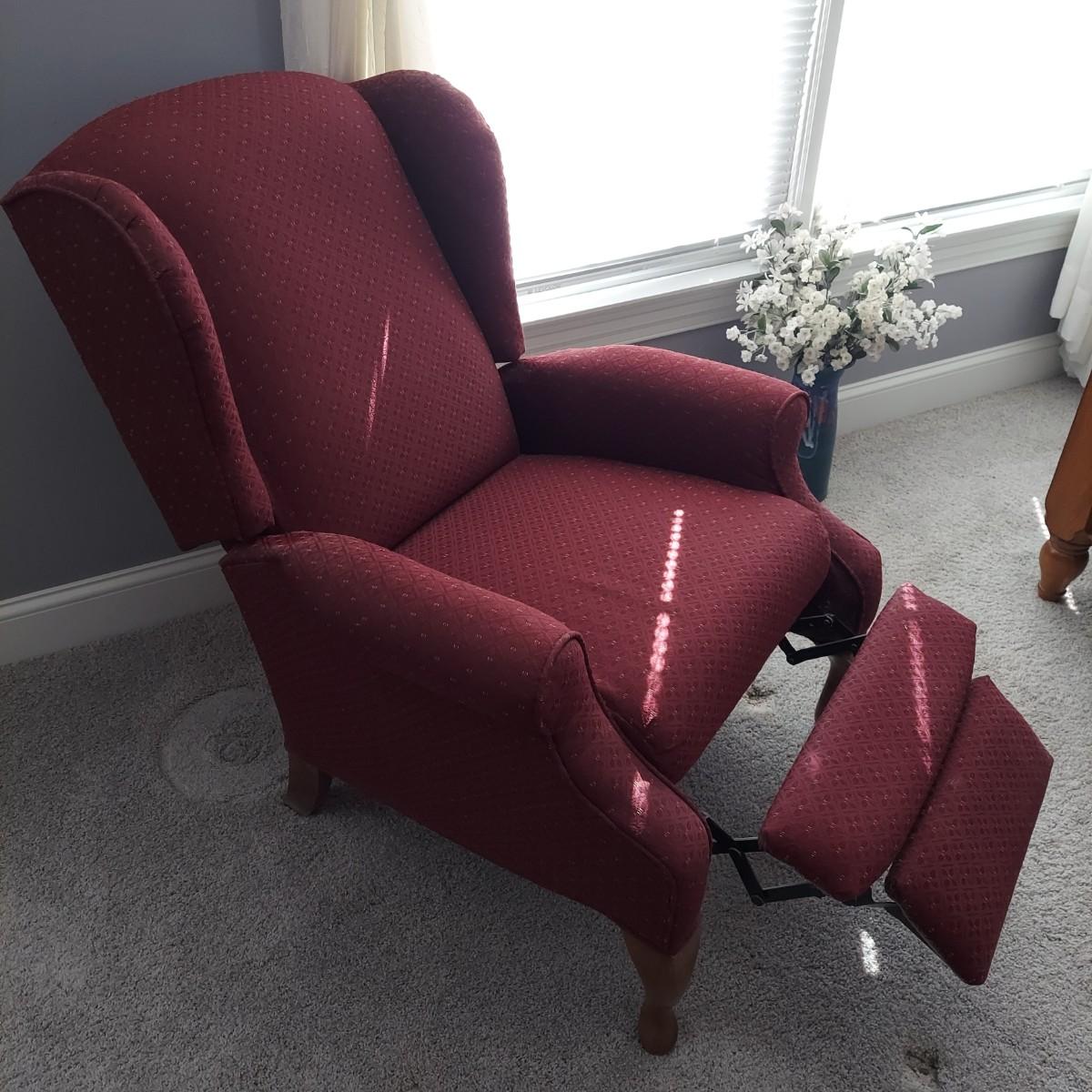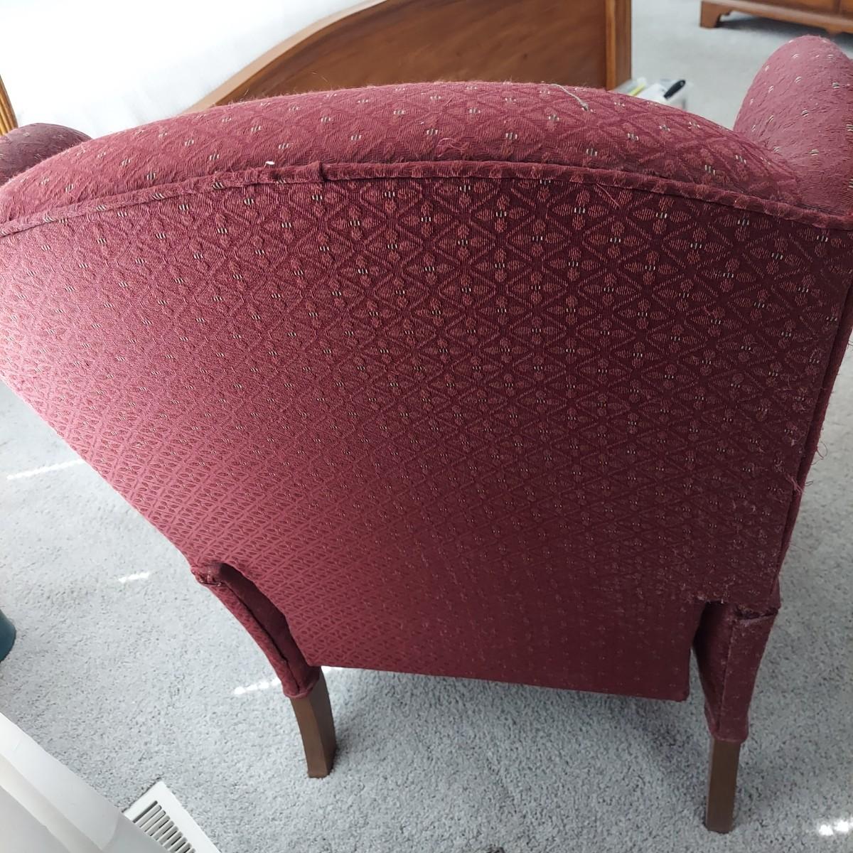Upholstered armchair that reclines. Measures approximately 31” x 30” x 40"H w/ a 19” seat height. Some sun fading and other wear to material. Please see photos for details. Local Pickup Only