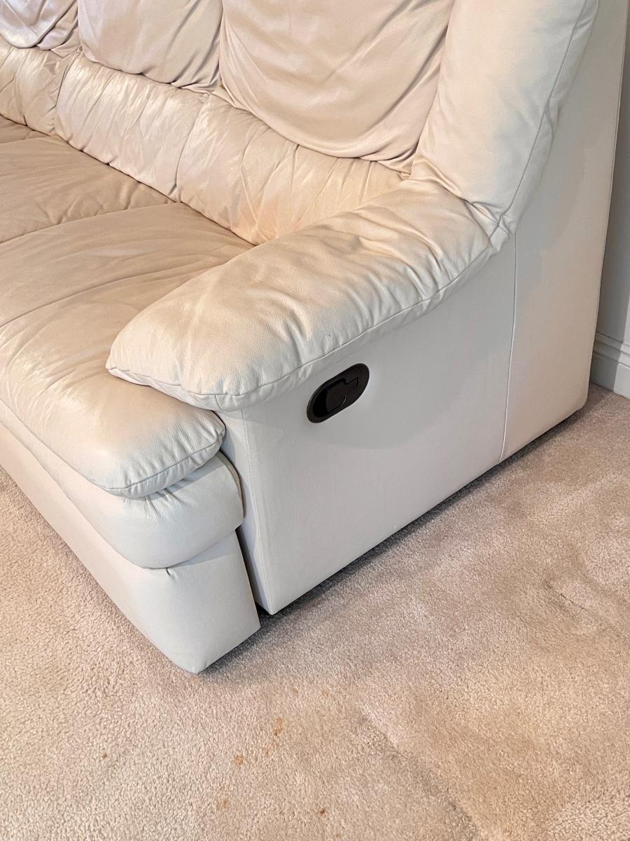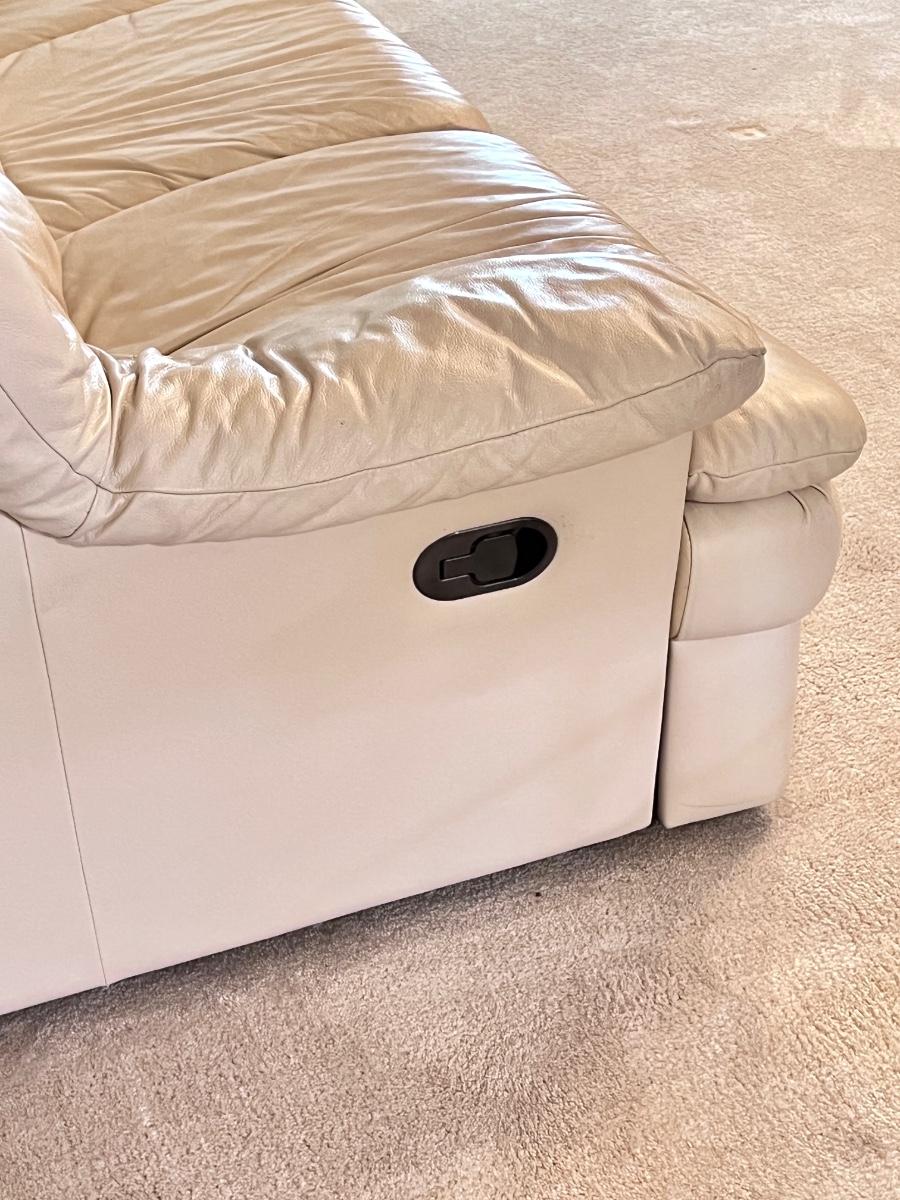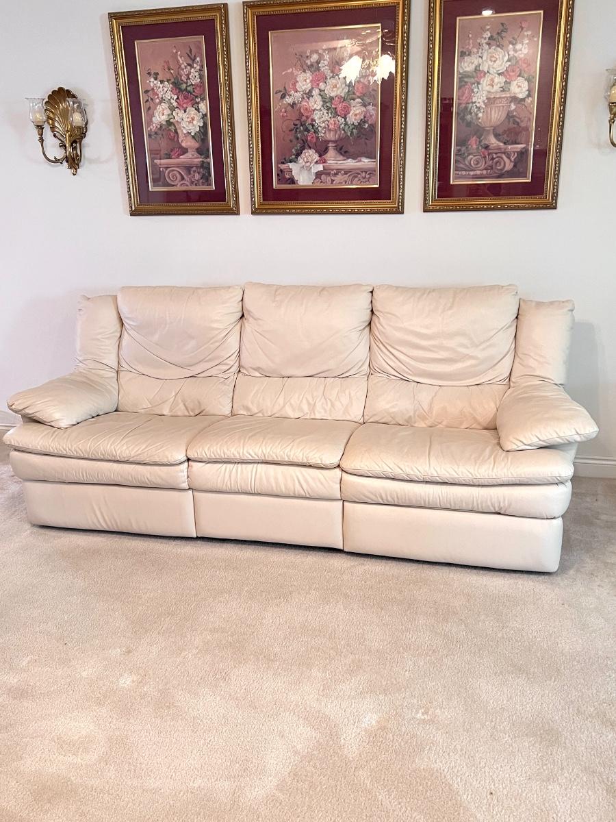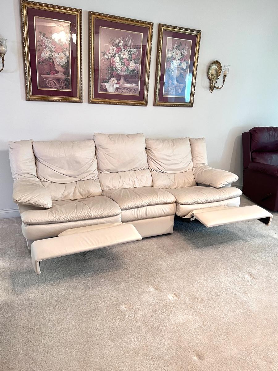 Reclines easily on both sides. No name brand found. Wall decor is sold separately. 36” H x 84” W x 36” D.