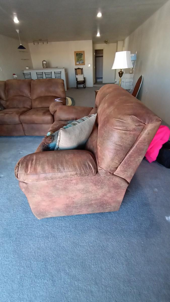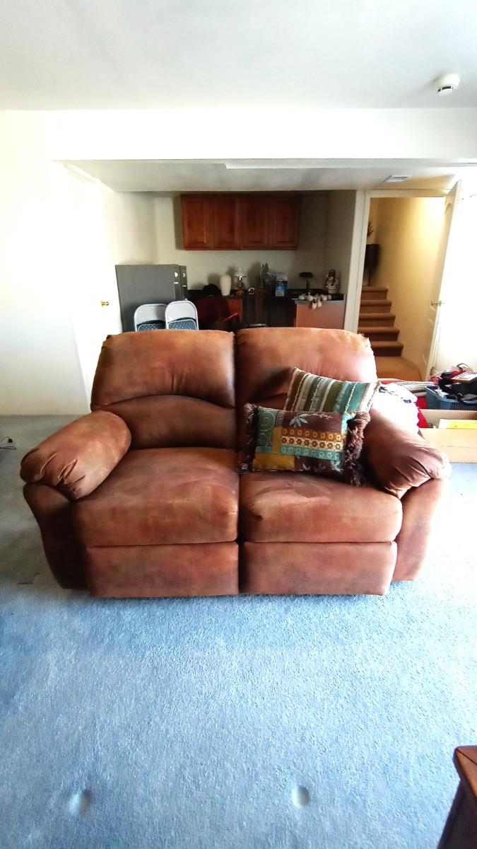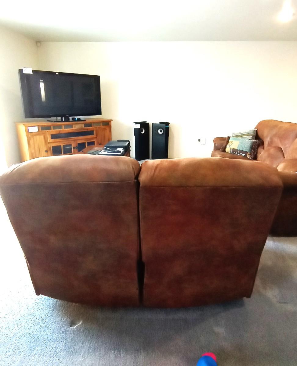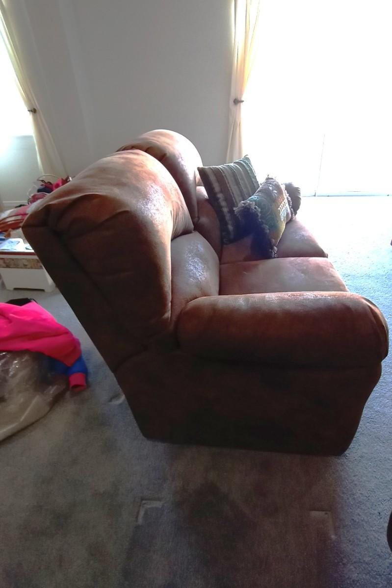 RECLINING LOVESEAT TWO TONE BROWN WITH SUADE LIKE MATERIAL BOTH SIDES RECLINE MEASURES APPROX. 60" LONG
