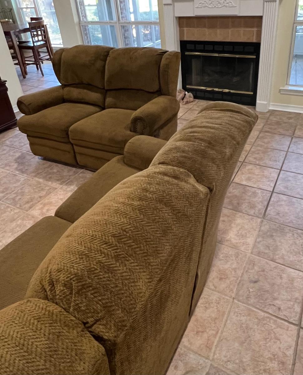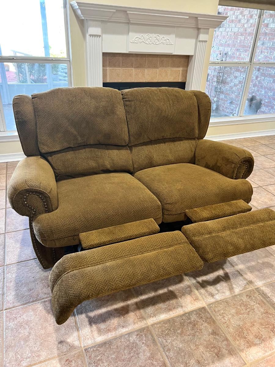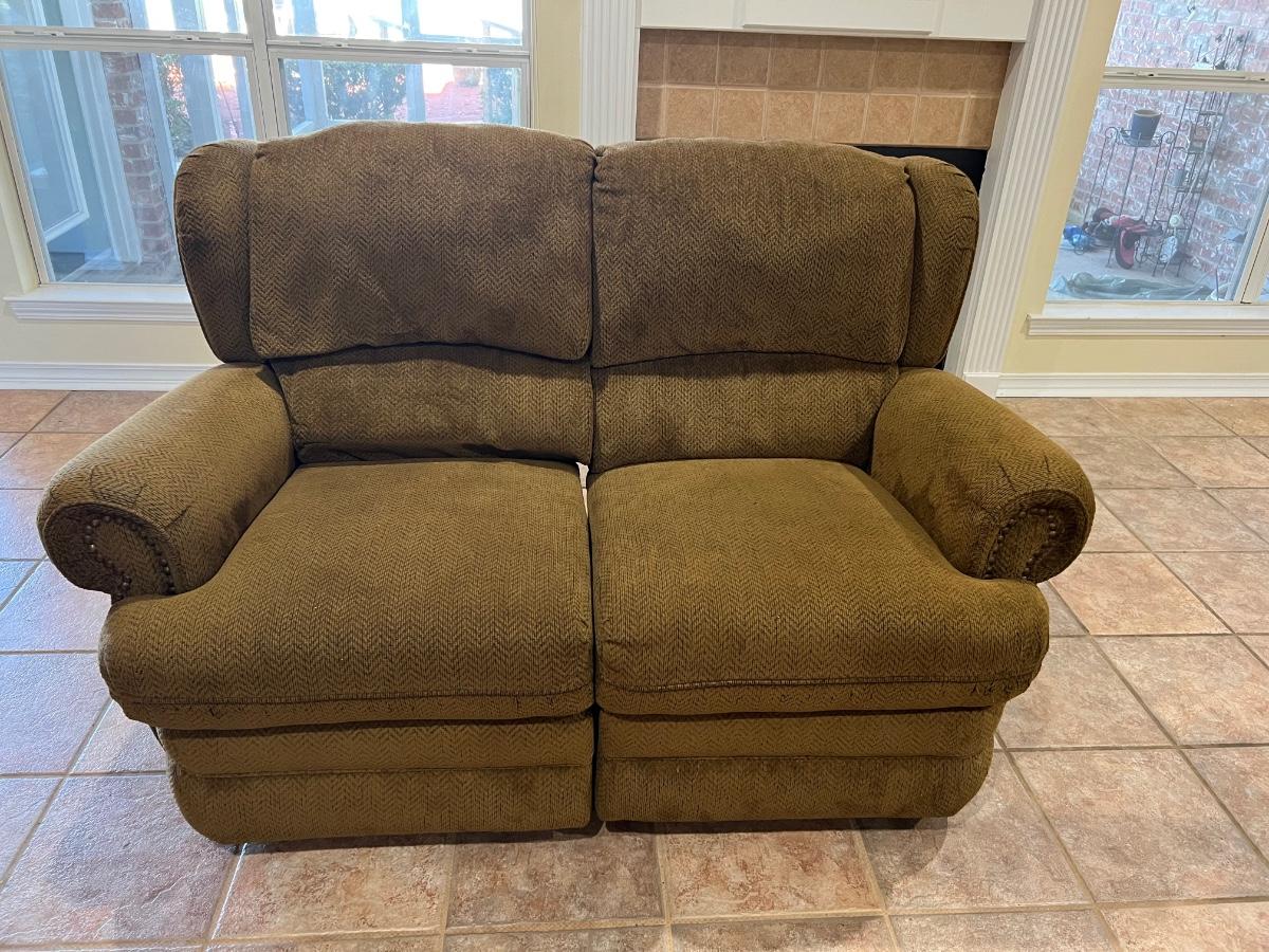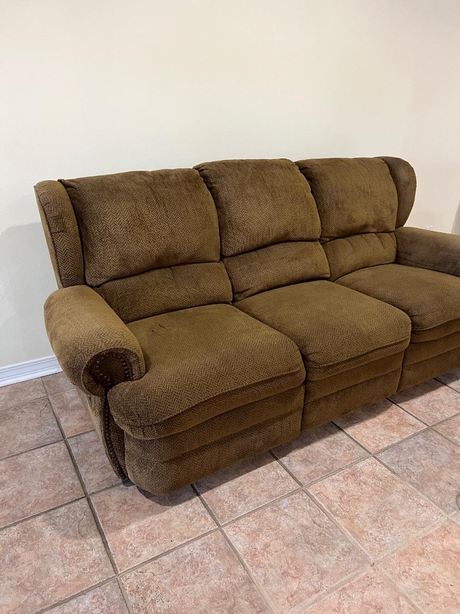 Sofa and love seat set. Dark brown. Both sofa and love seat recline. Sofa measures approximately 86 inches long, 38 inches tall and 37 inches deep. Loveseat measures approximately 66 inches long, 38 inches tall and 38 inches deep. Love seat has loose material on one cushion, see pictures. love seat bottom of cushion also has some loose