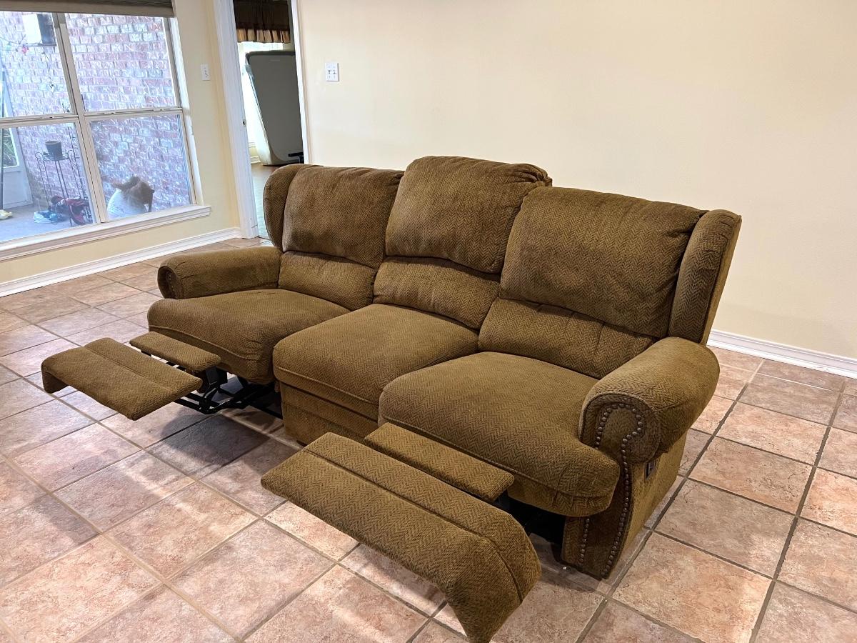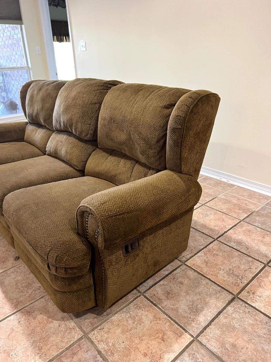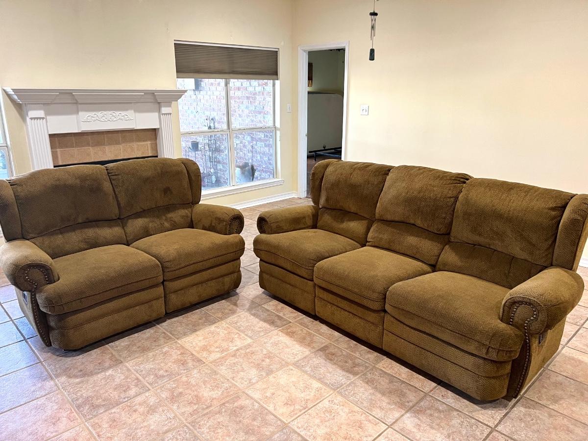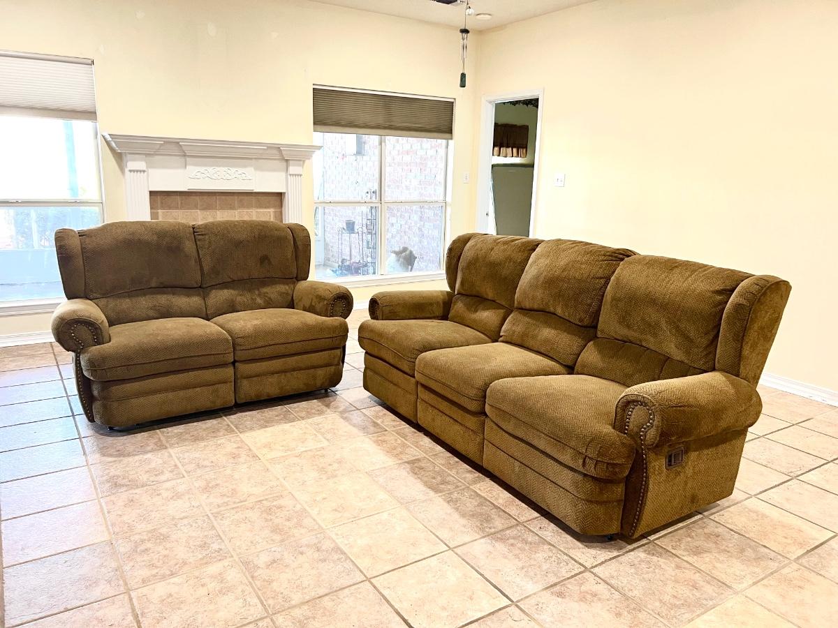 Sofa and love seat set. Dark brown. Both sofa and love seat recline. Sofa measures approximately 86 inches long, 38 inches tall and 37 inches deep. Loveseat measures approximately 66 inches long, 38 inches tall and 38 inches deep. Love seat has loose material on one cushion, see pictures. love seat bottom of cushion also has some loose