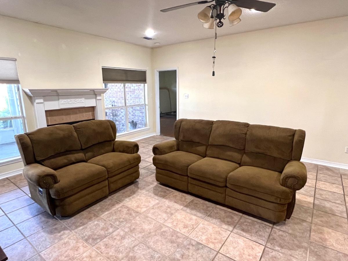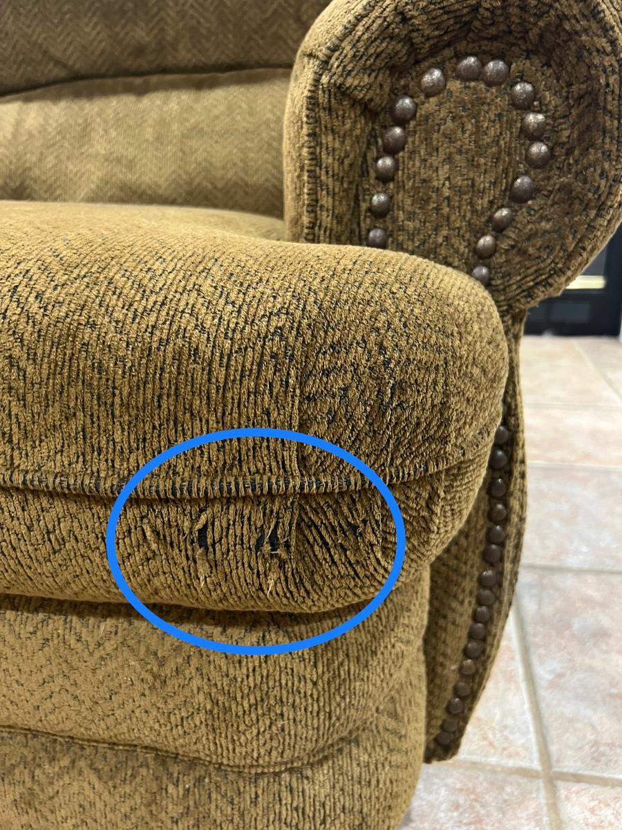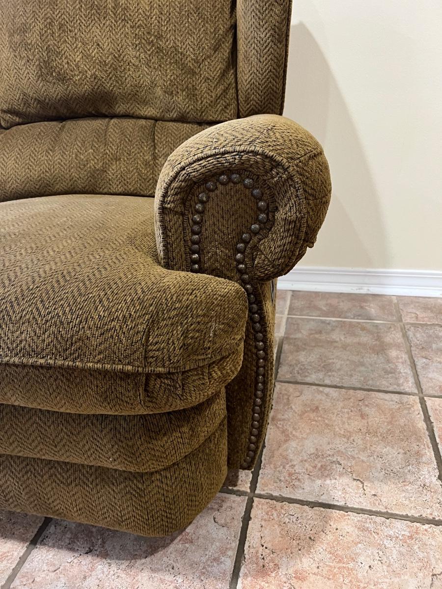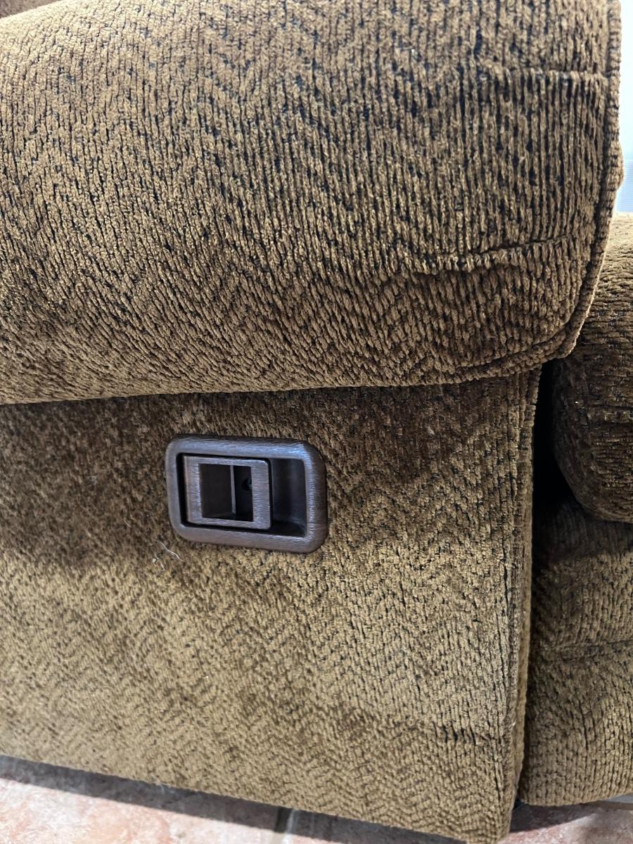 Sofa and love seat set. Dark brown. Both sofa and love seat recline. Sofa measures approximately 86 inches long, 38 inches tall and 37 inches deep. Loveseat measures approximately 66 inches long, 38 inches tall and 38 inches deep. Love seat has loose material on one cushion, see pictures. love seat bottom of cushion also has some loose