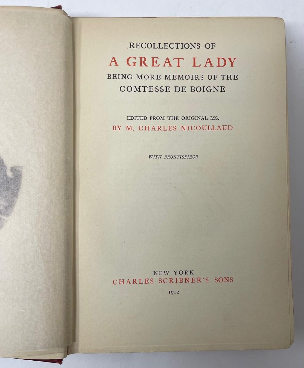Description: Recollections of a Great Lady, M. Charles Nicoullaud; Material: Paper