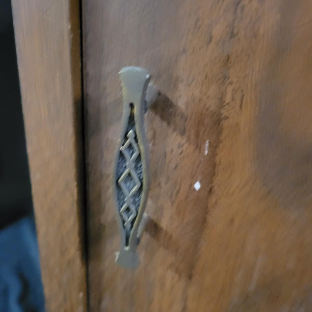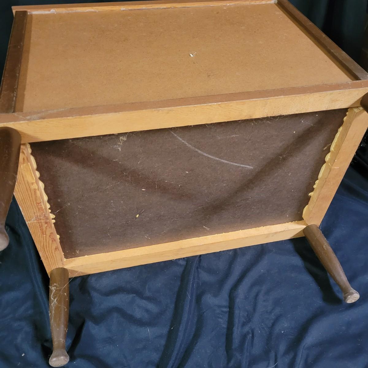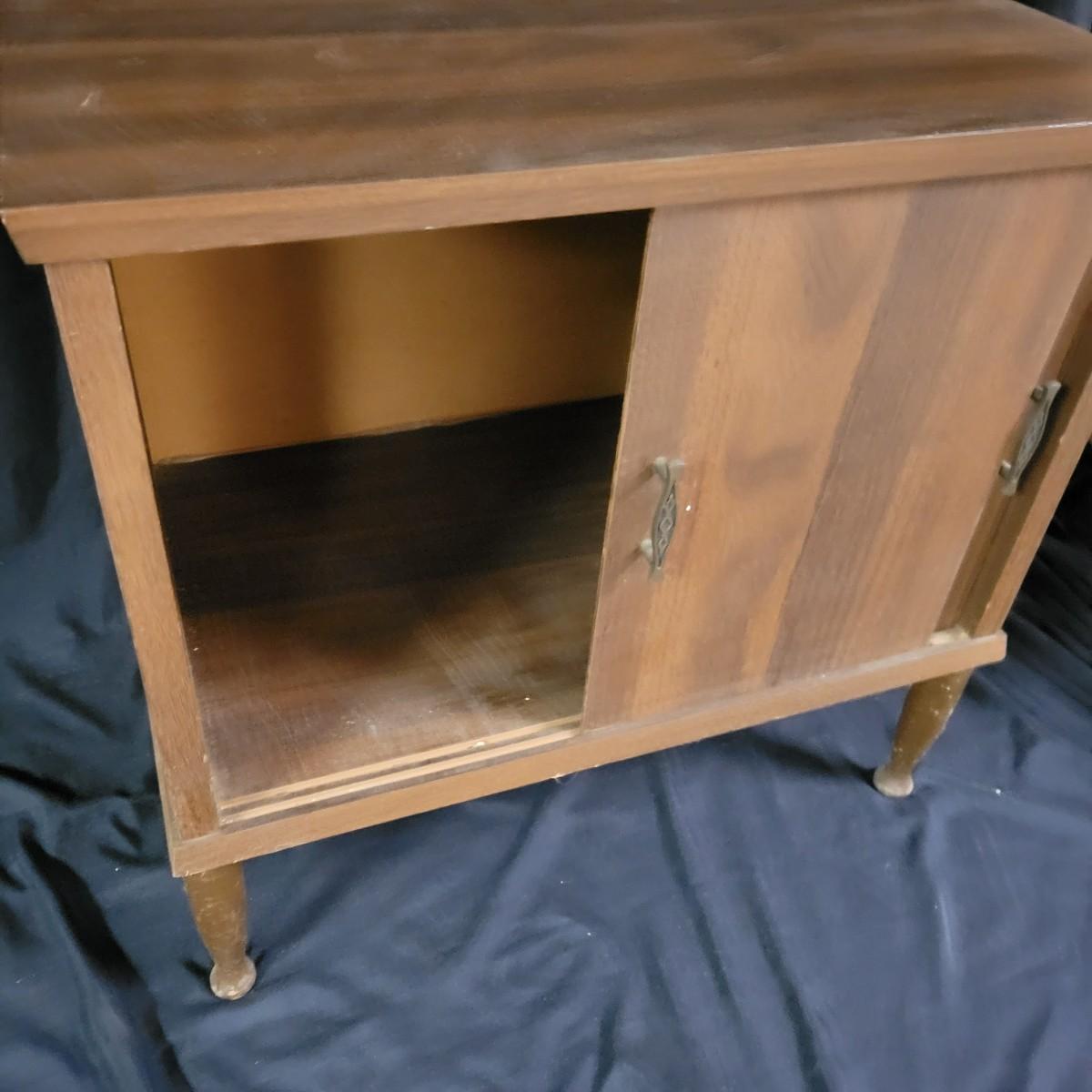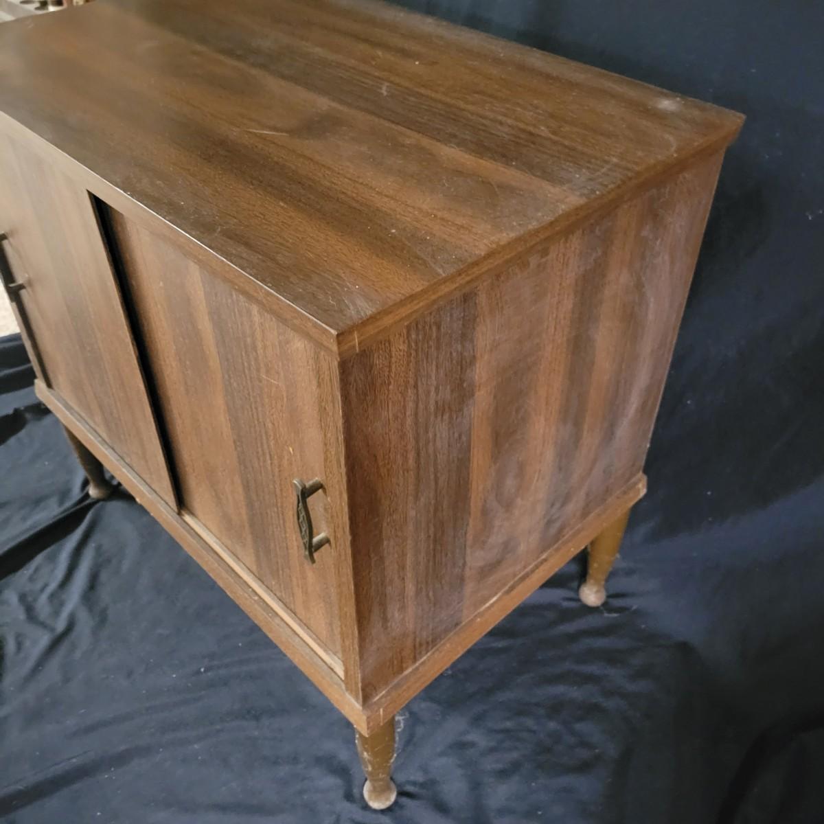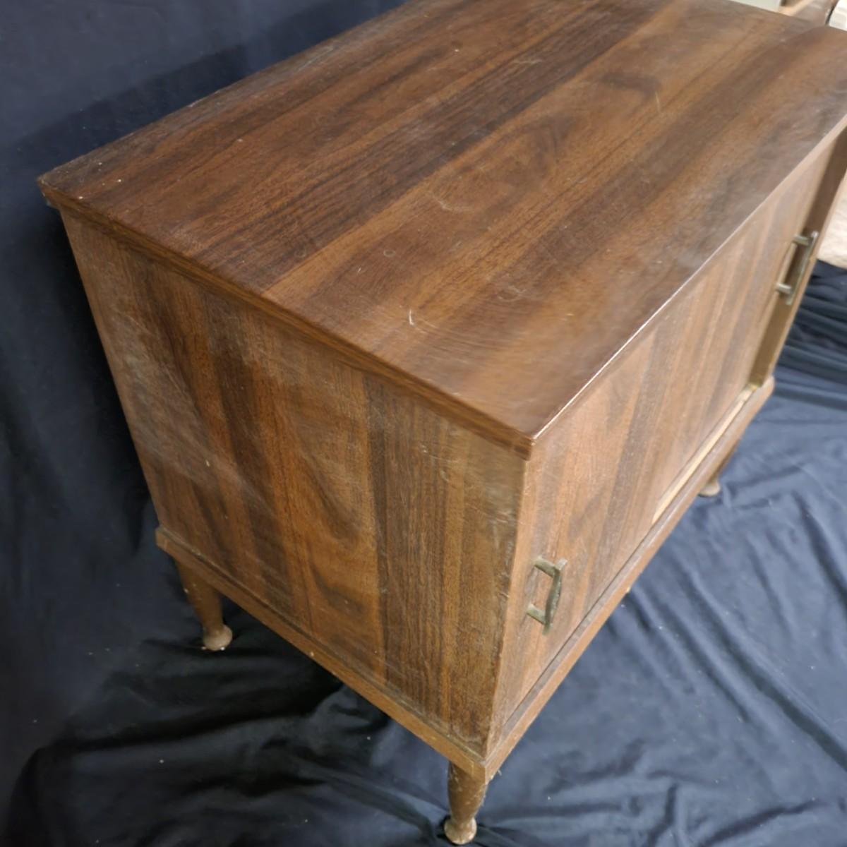 A two door record cabinet in good condition with no notable damage. This piece is made of pressed wood with a faux wood veneer. It has two sliding cabinet doors with brass hardware and measures approximately 23.5" x 13.5" x 23". Local pickup only