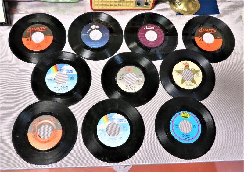 RECORDS 45's LOT Kenny Rogers, BEE GEES, HELLO DOLLY misc (yr 1976 +). Not tested.