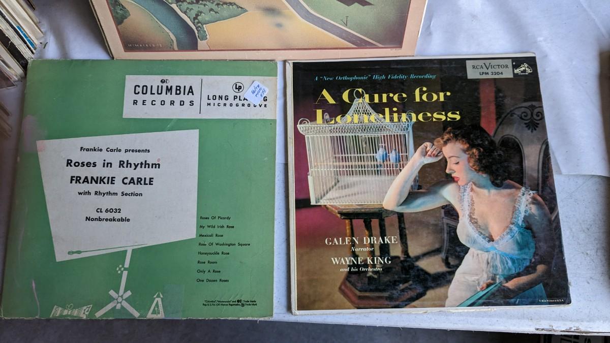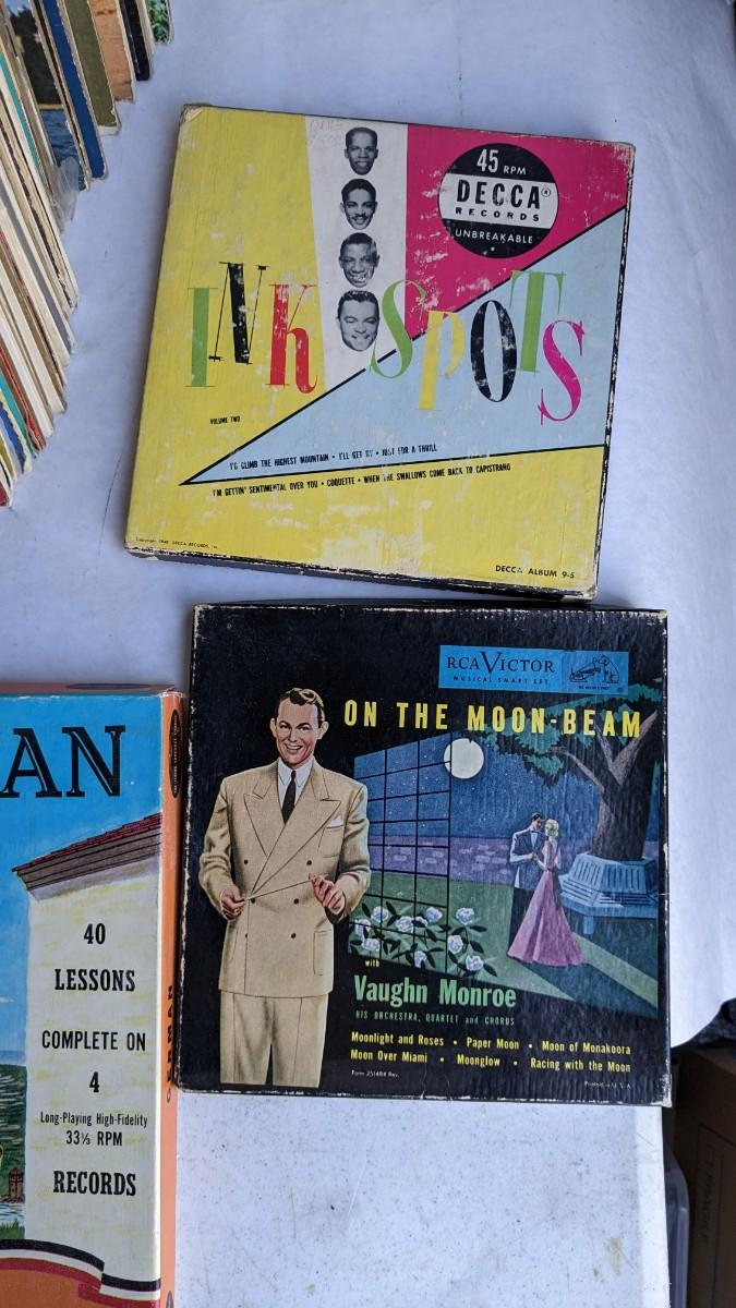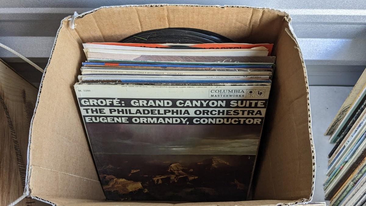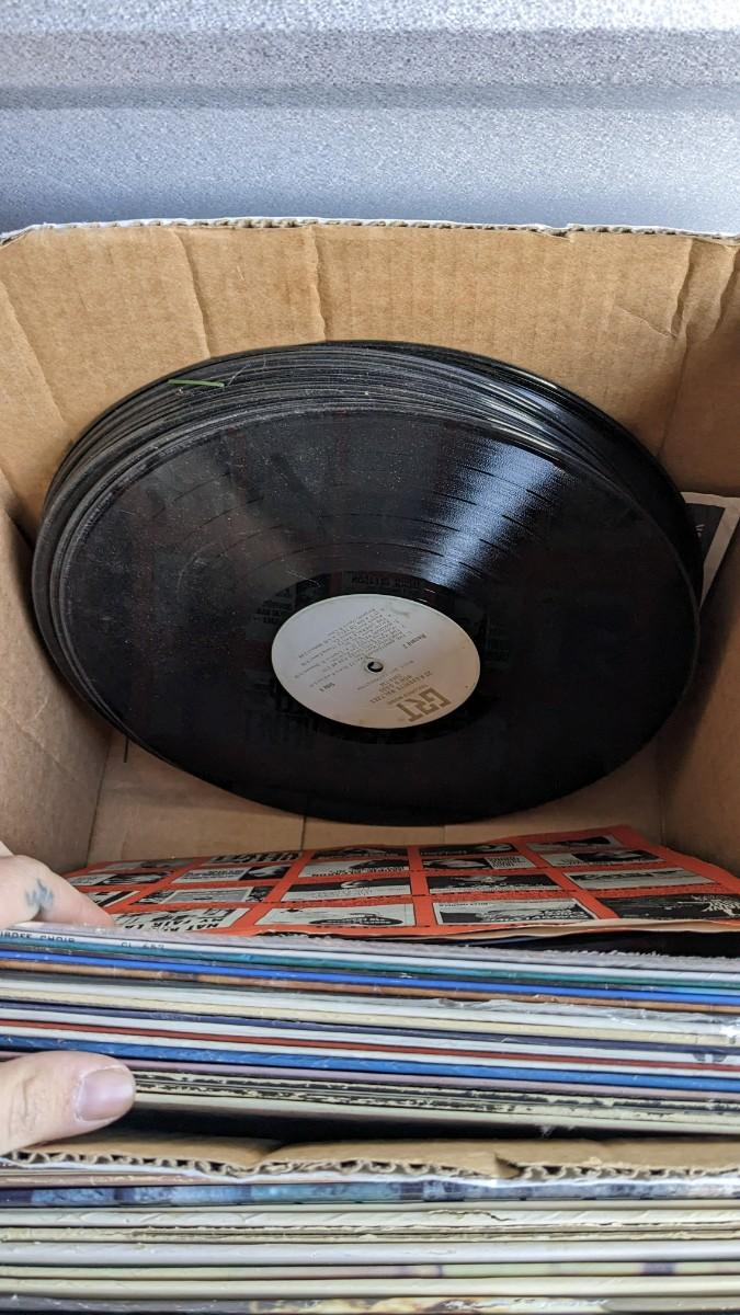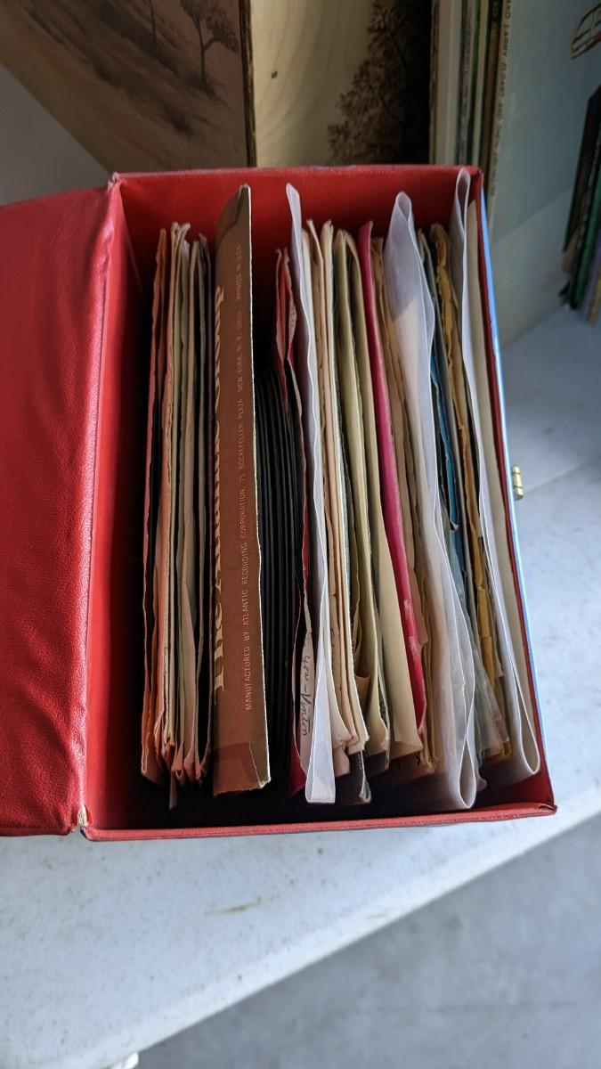 a fantastic lot of unsearched vinyl records. Lots of goodies in here, all are in fair to poor condition. a couple Good to VG. Includes fantastic wood crate, 45's, and learning items. Box in the center is mainly sleeves but it appears discs are present just not in there. No shipping. 2604