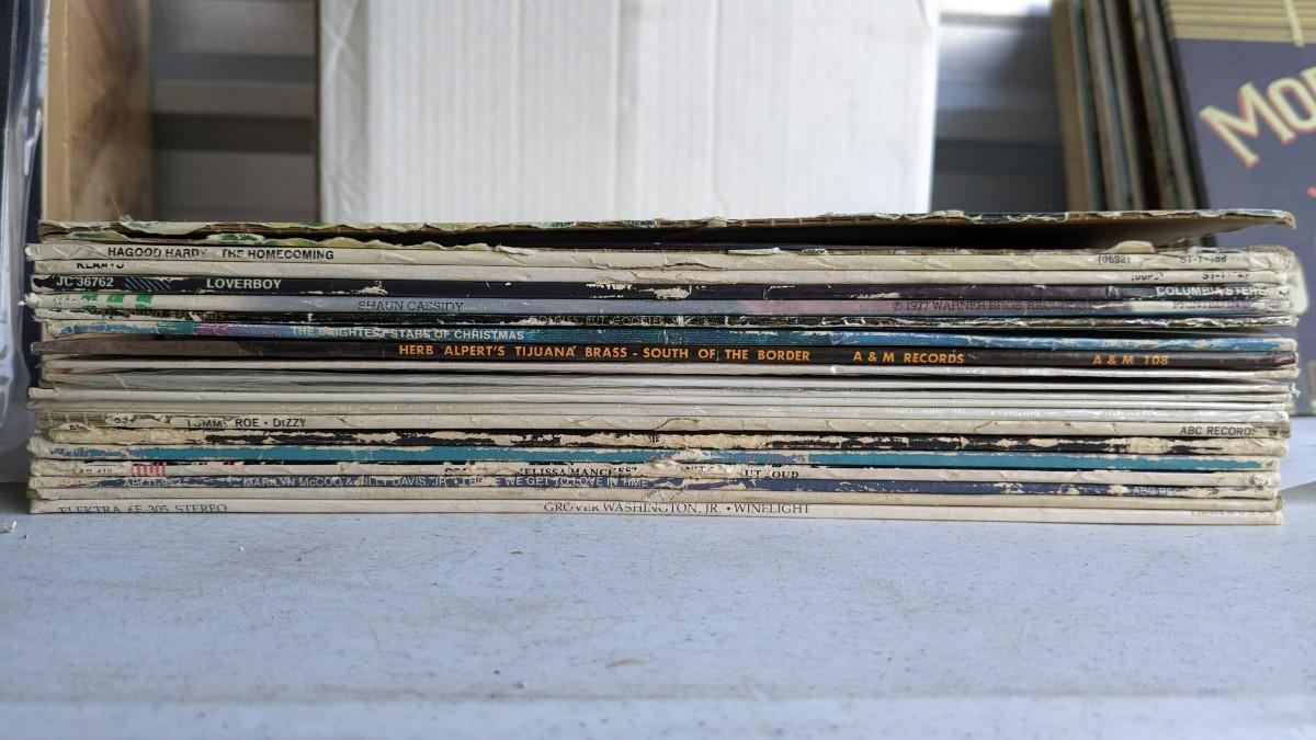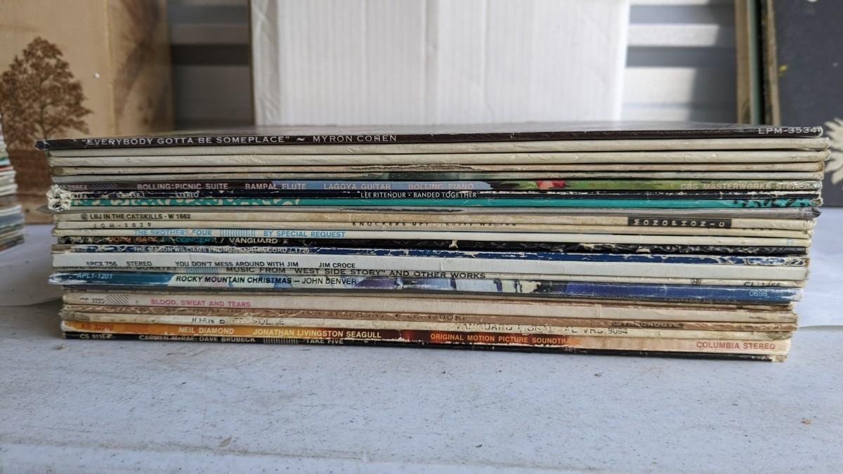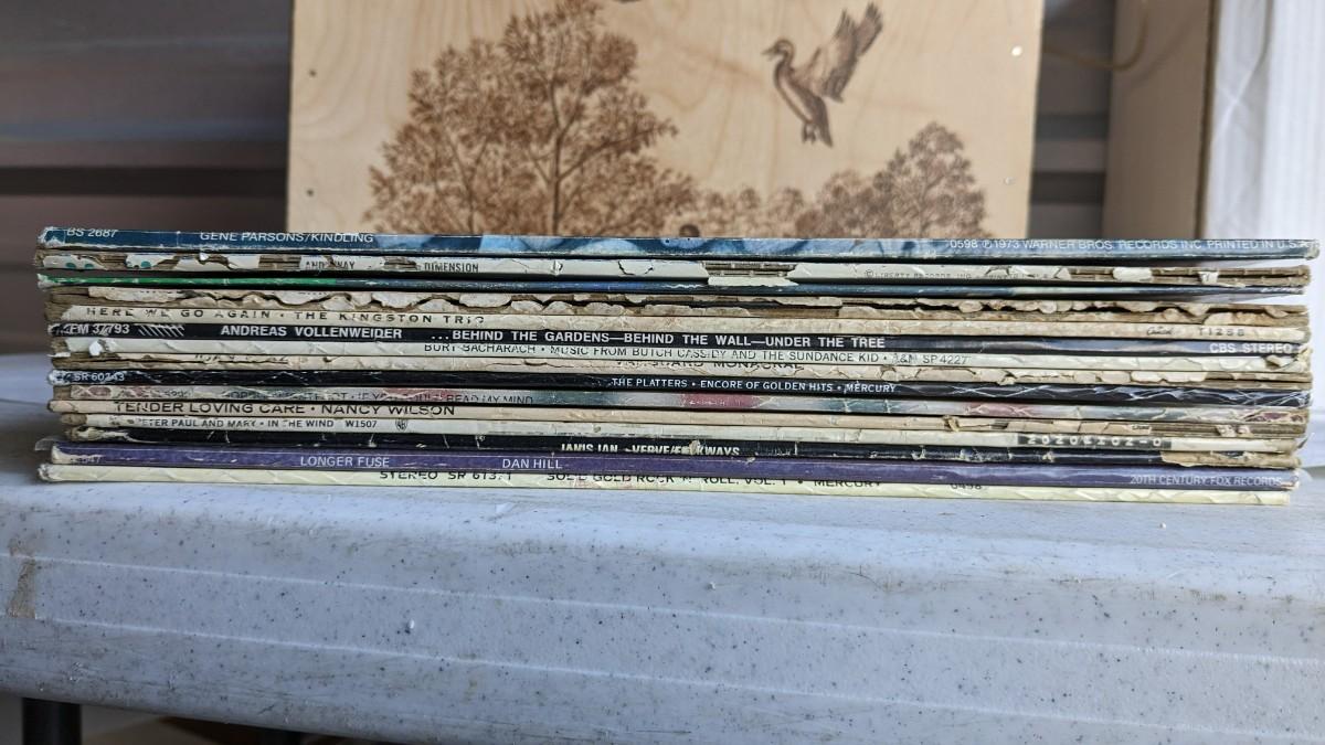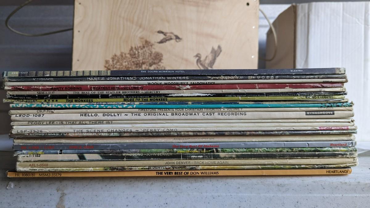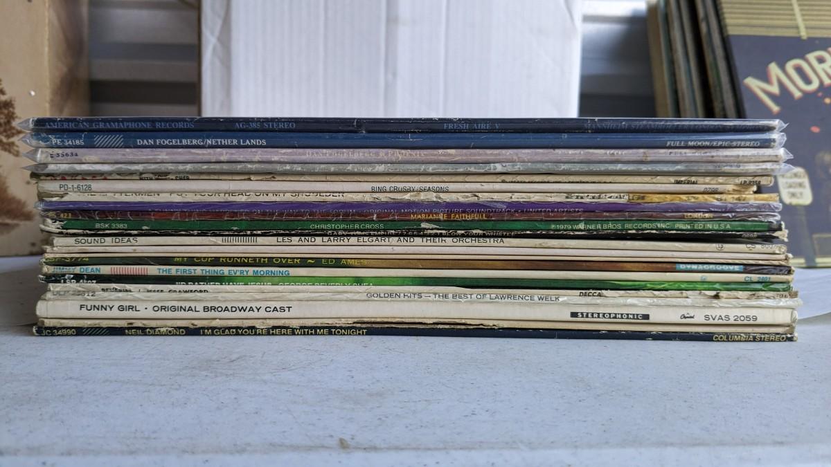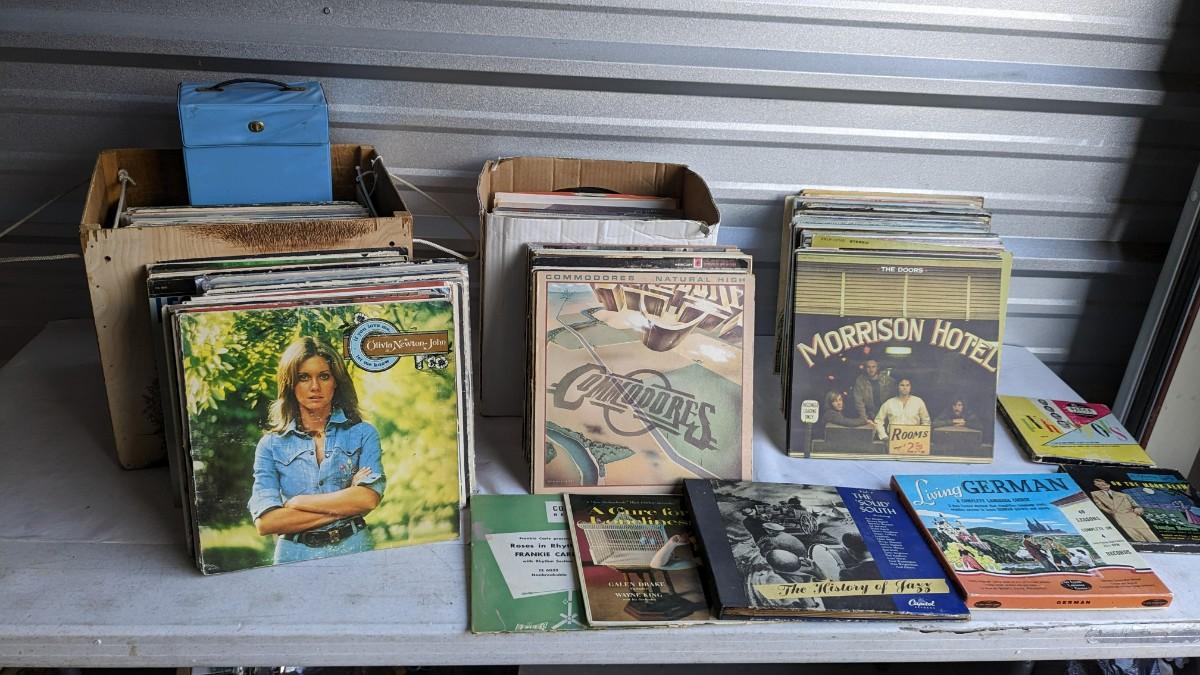 a fantastic lot of unsearched vinyl records. Lots of goodies in here, all are in fair to poor condition. a couple Good to VG. Includes fantastic wood crate, 45's, and learning items. Box in the center is mainly sleeves but it appears discs are present just not in there. No shipping. 2604