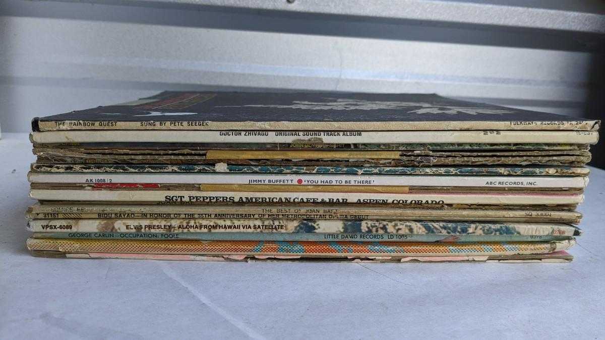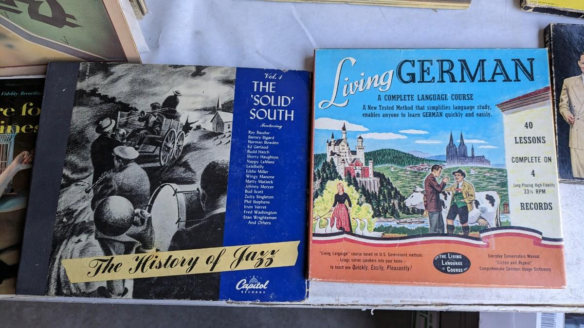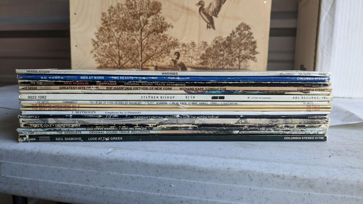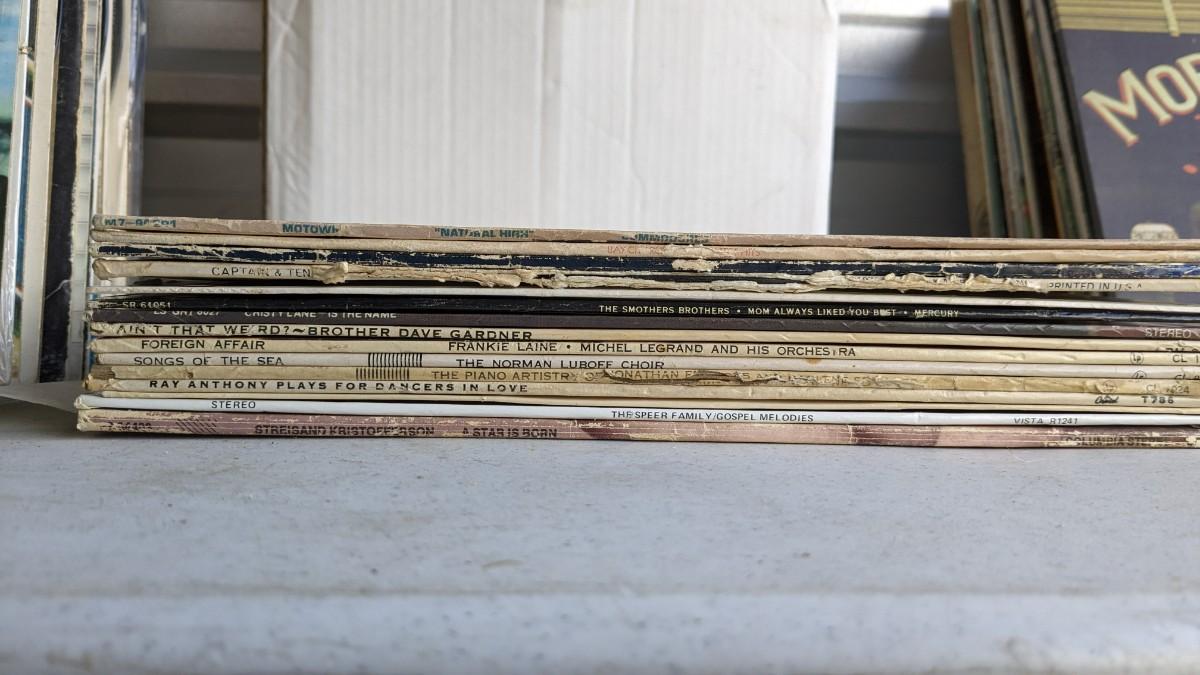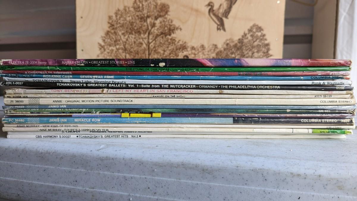 a fantastic lot of unsearched vinyl records. Lots of goodies in here, all are in fair to poor condition. a couple Good to VG. Includes fantastic wood crate, 45's, and learning items. Box in the center is mainly sleeves but it appears discs are present just not in there. No shipping. 2604