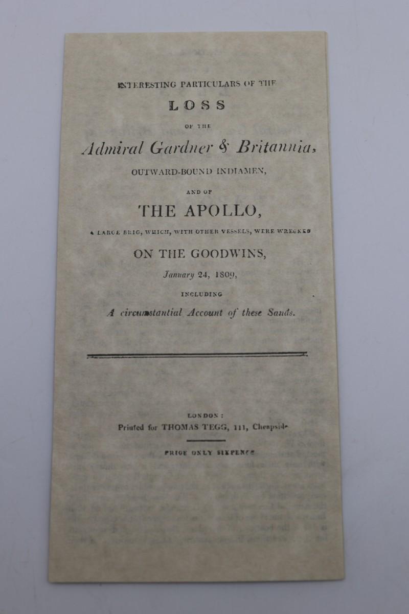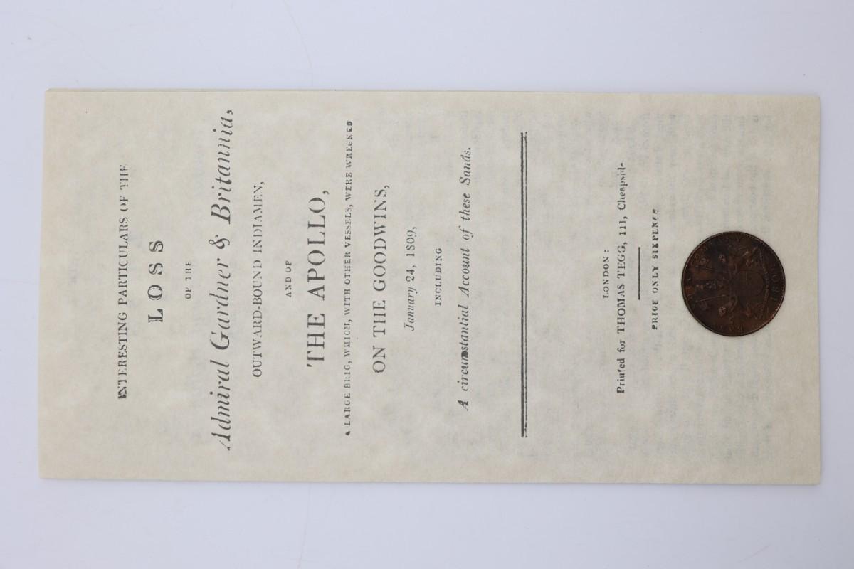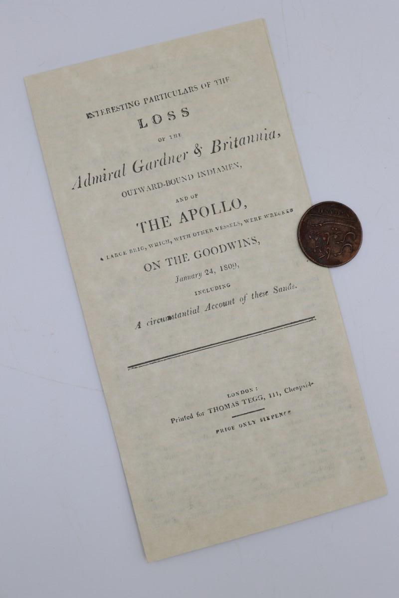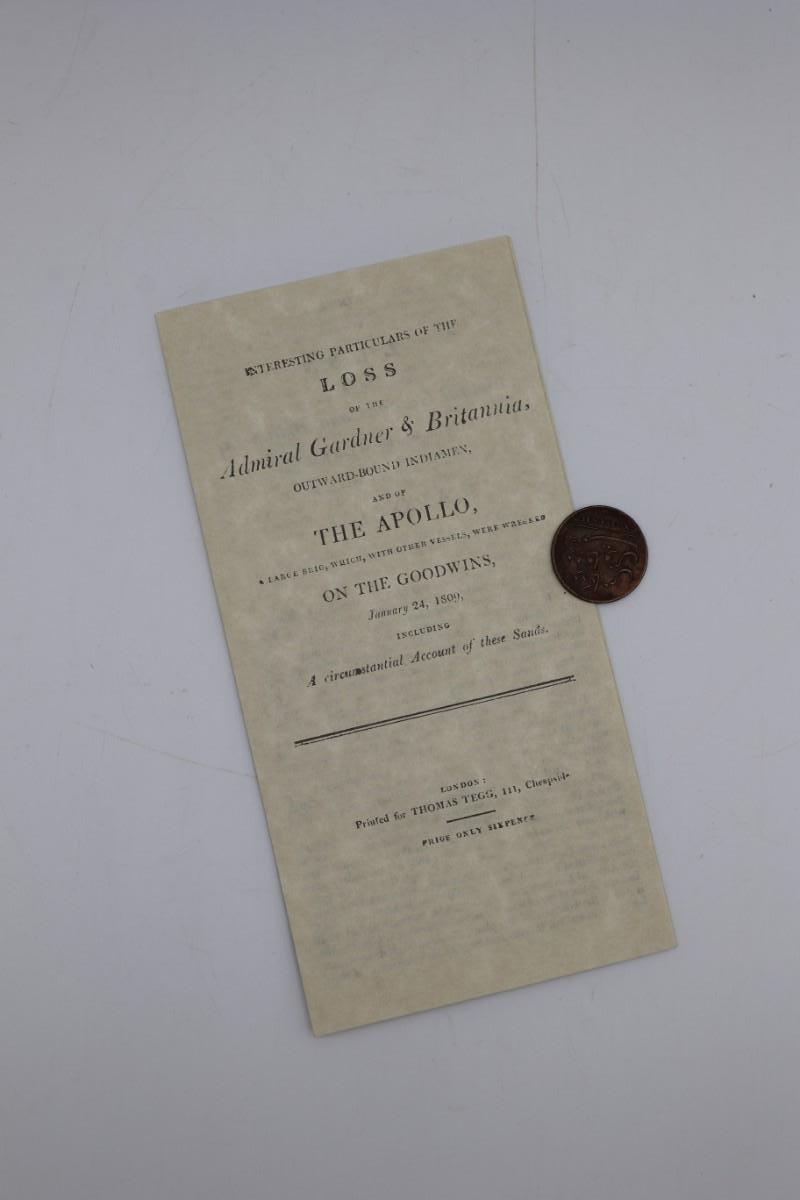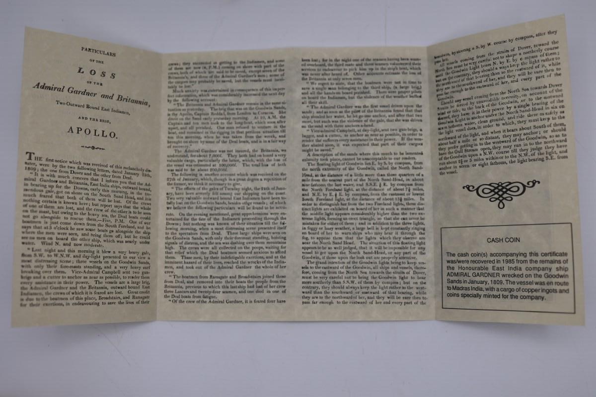 The cash coin accompanying this certificate was recovered in 1985 from the remains of the Honorable East India company ship Admiral Gardner wrecked on the Goodwin Sands in January, 1809.