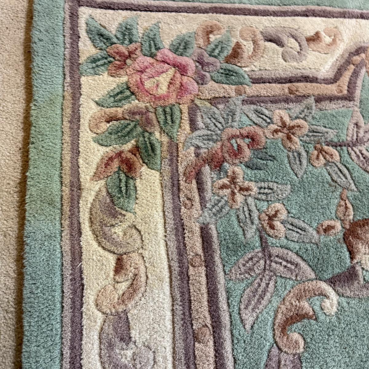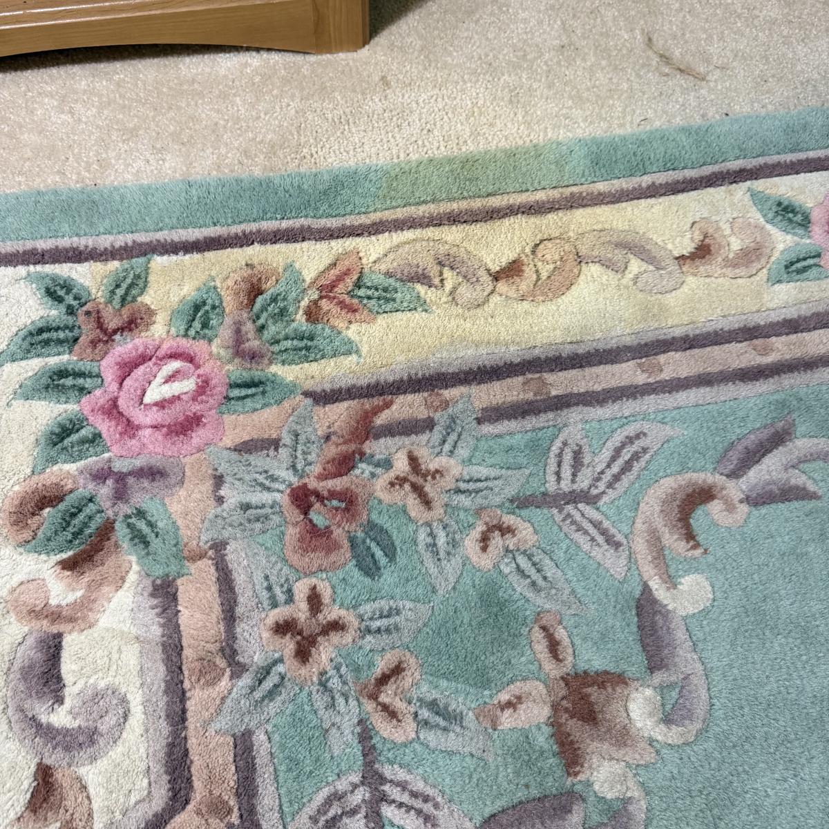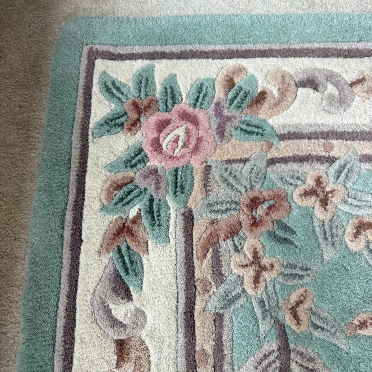This lot contains a lovely floral wool rug from China. This rug measures 4’9” x 7’9” and is rectangular medium sized rug. It is a pretty aquamarine color with floral details in the border and center. There do appear to be some stains on one side of the rug, see pictures for details. Local pick up only.