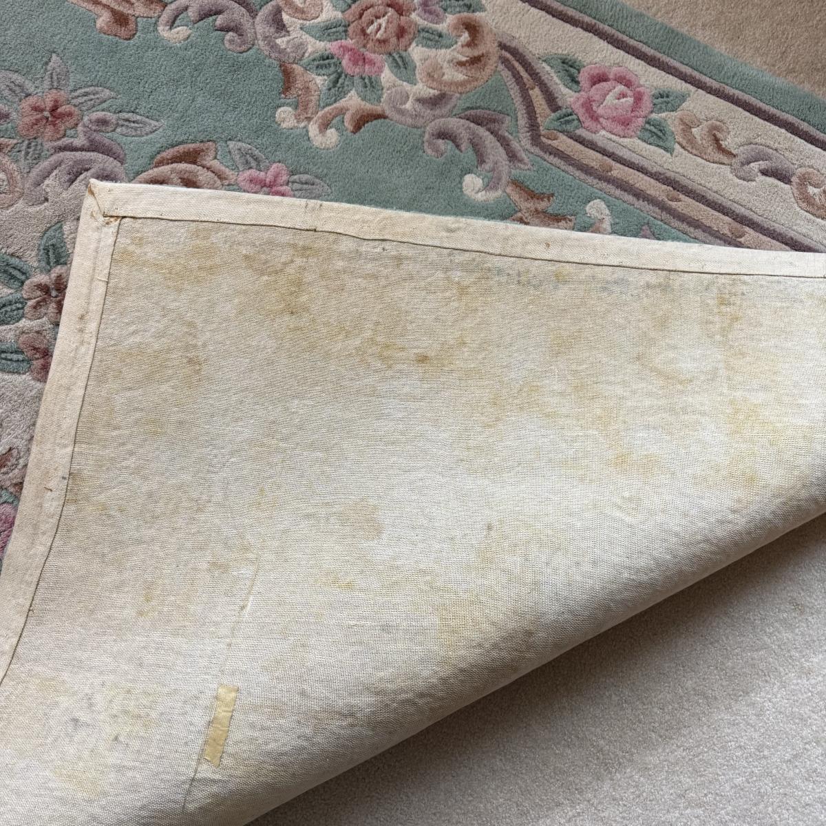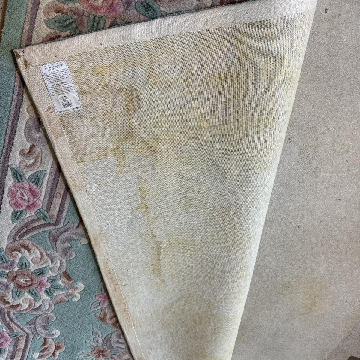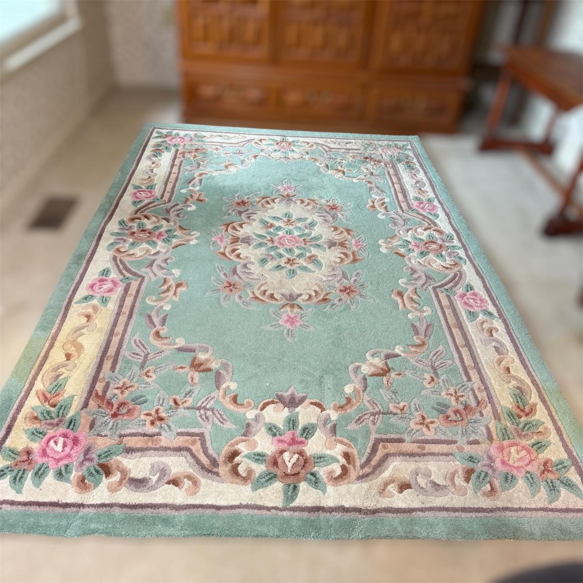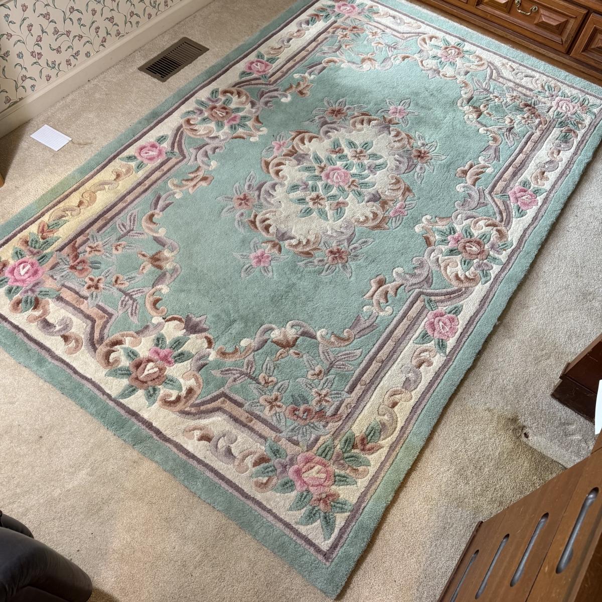 This lot contains a lovely floral wool rug from China. This rug measures 4’9” x 7’9” and is rectangular medium sized rug. It is a pretty aquamarine color with floral details in the border and center. There do appear to be some stains on one side of the rug, see pictures for details. Local pick up only.