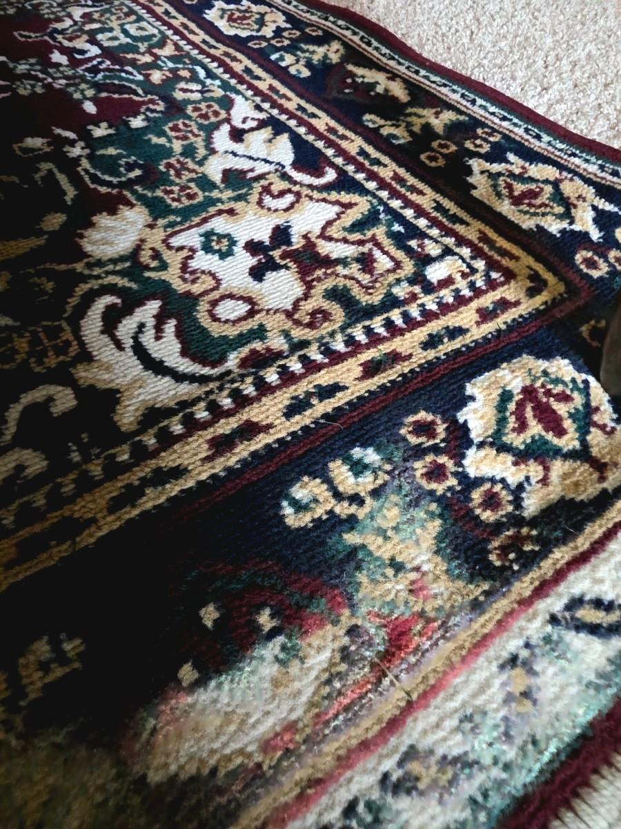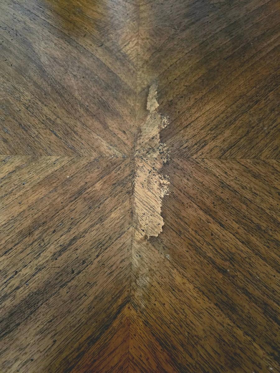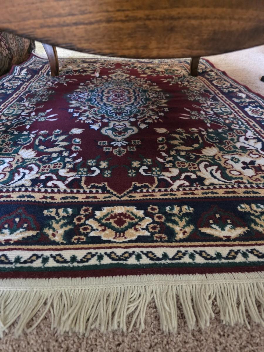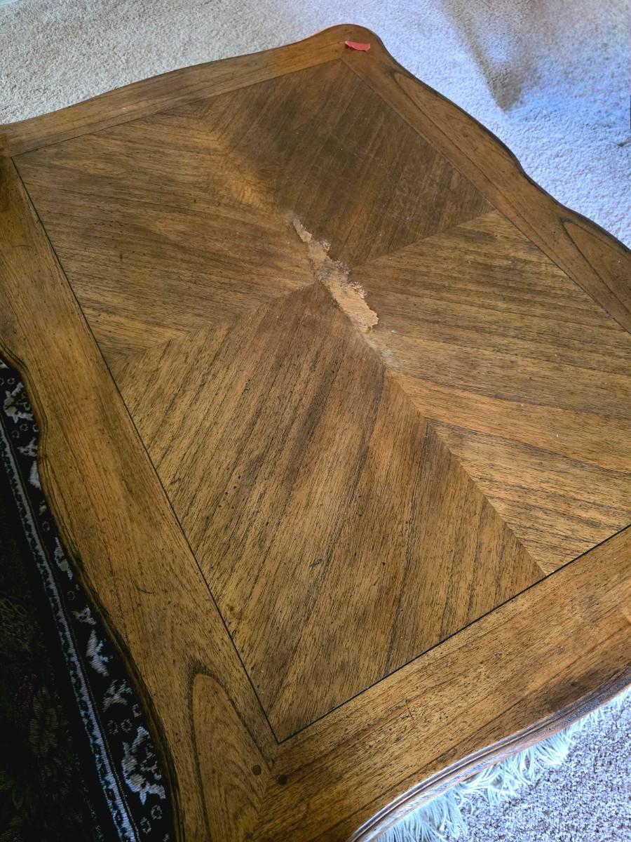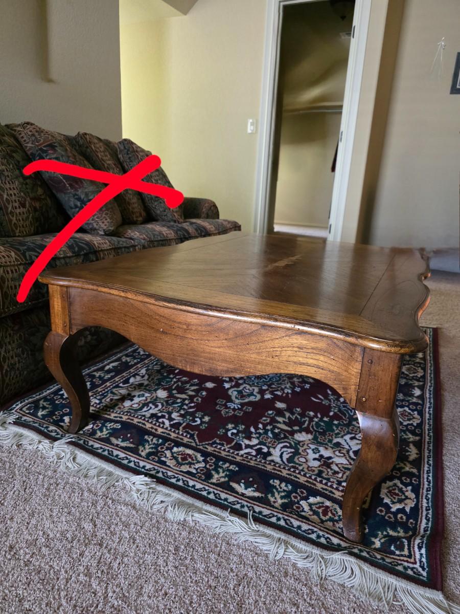 Rectangle wood coffee table with area rug. Please see picture for defect on top of coffee table. Table measures 50"L x 36"W x 17.5"H.