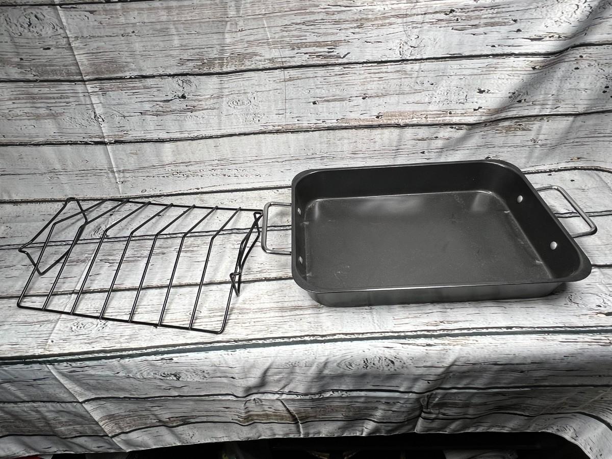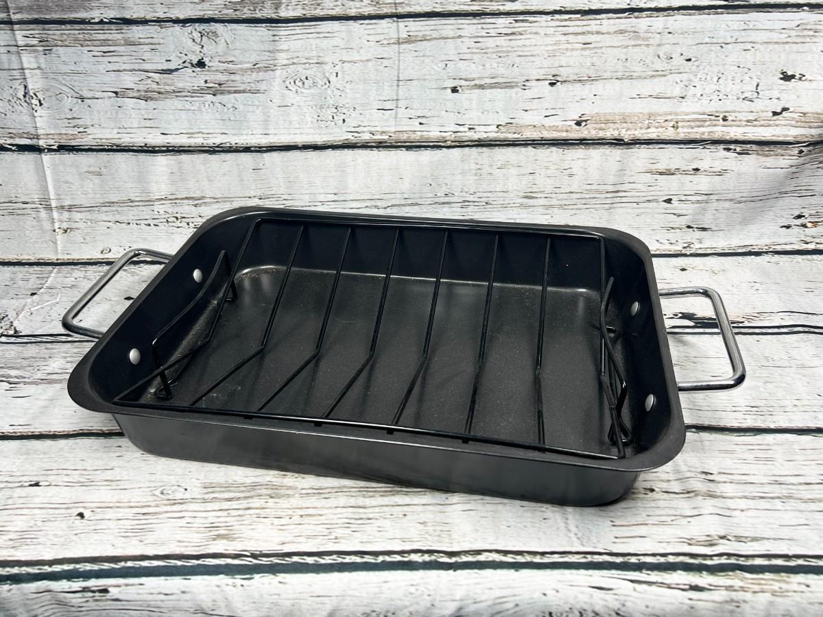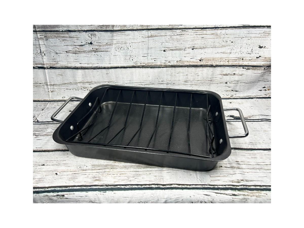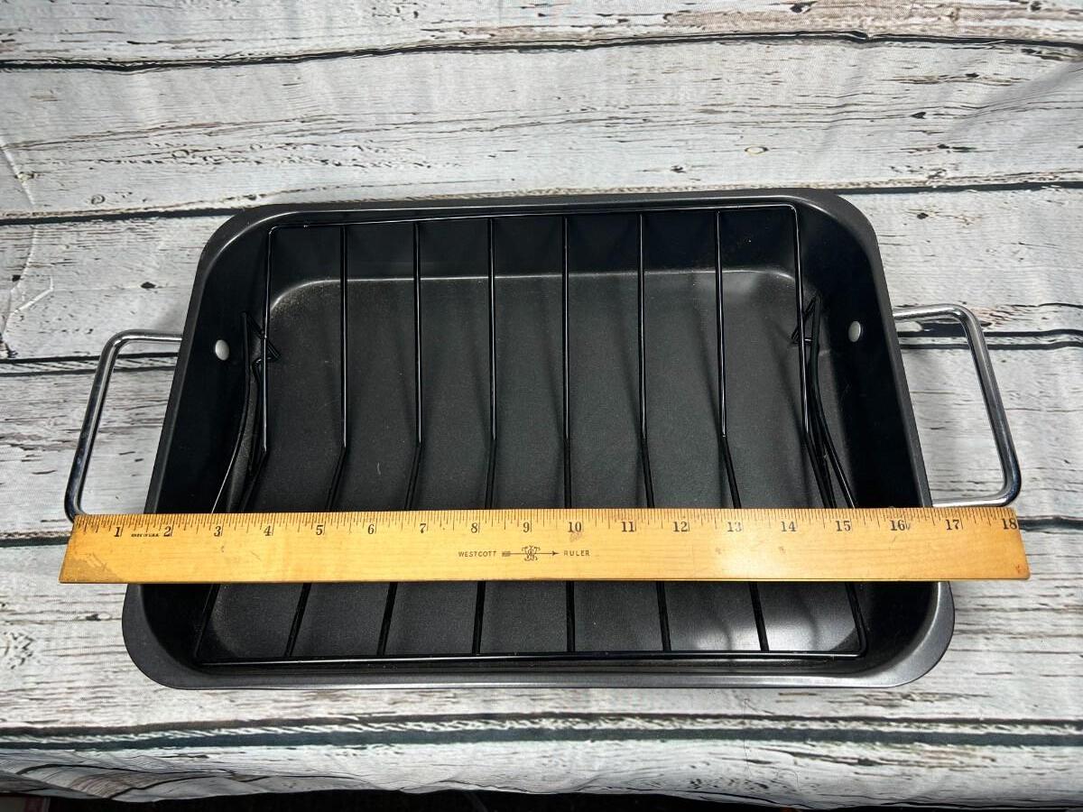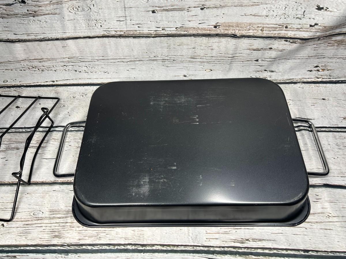 Rectangular Non Stick Roaster Pan with Rack, there is some wear, but there is no significant damage and is in good useable condition. Check pictures for more details and for sizing.
