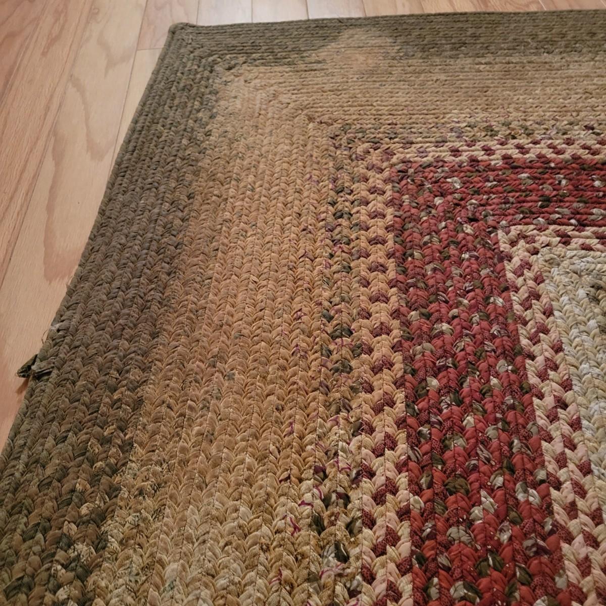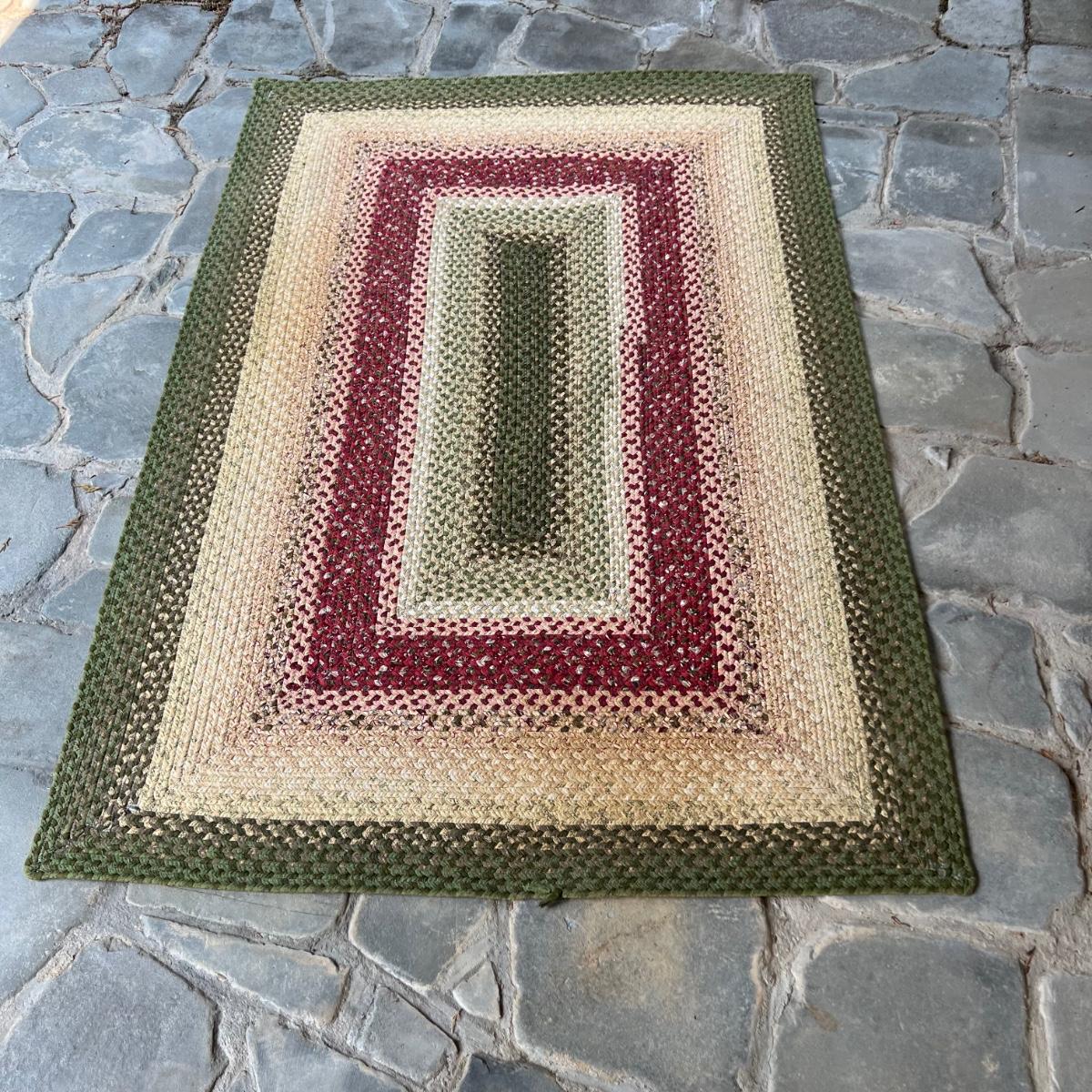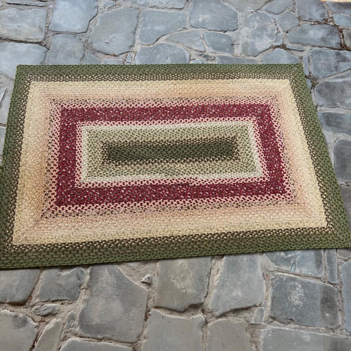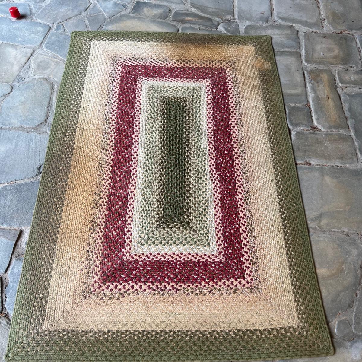 Rectangular rug in shades of green, gold, maroon and tan measures 48” x 72”. There is a notable stain in one corner, but there are no unusual odors. Local pickup only.
