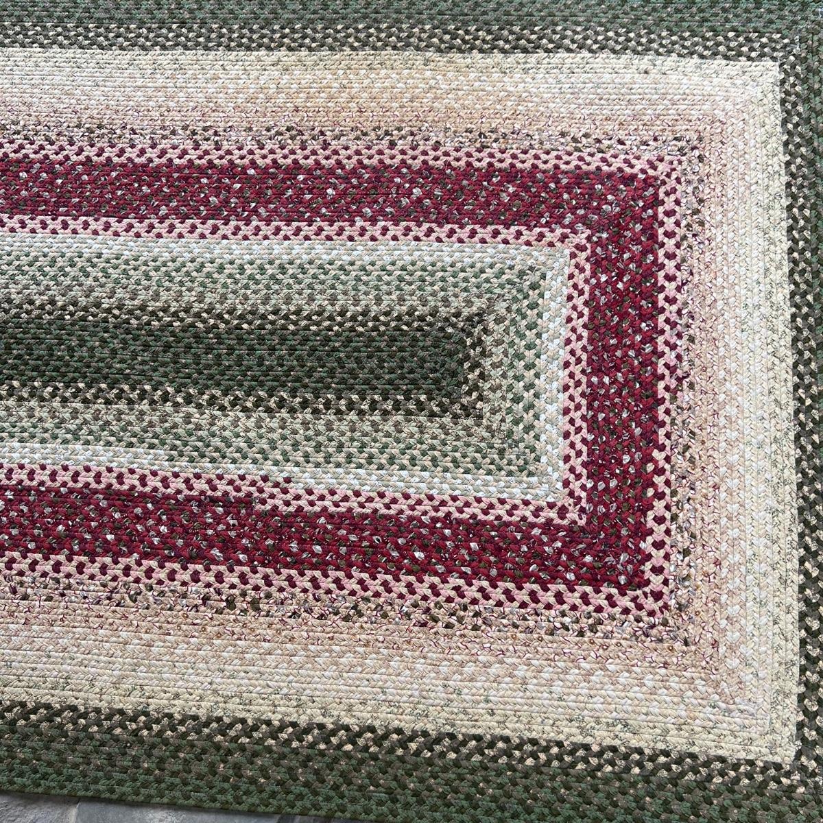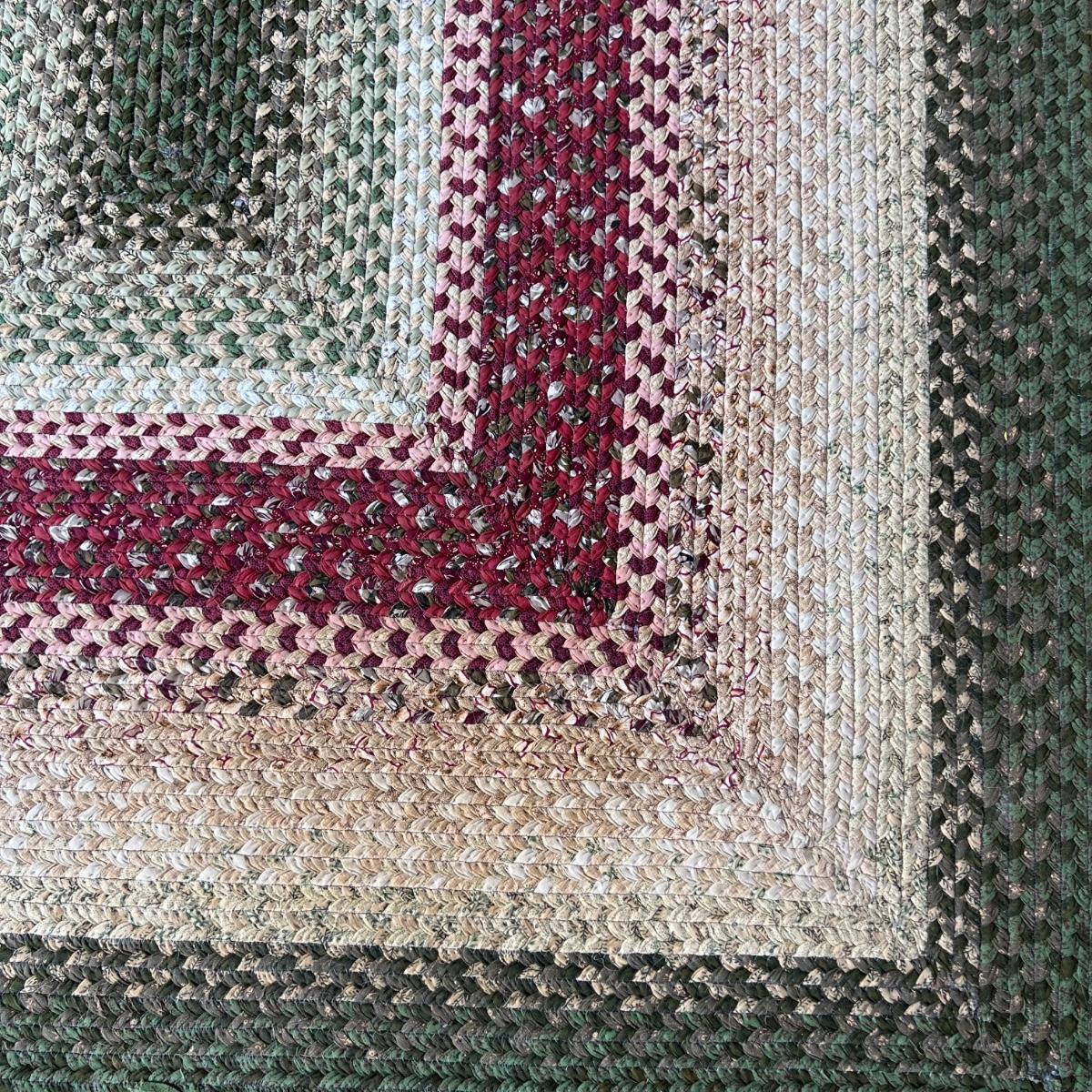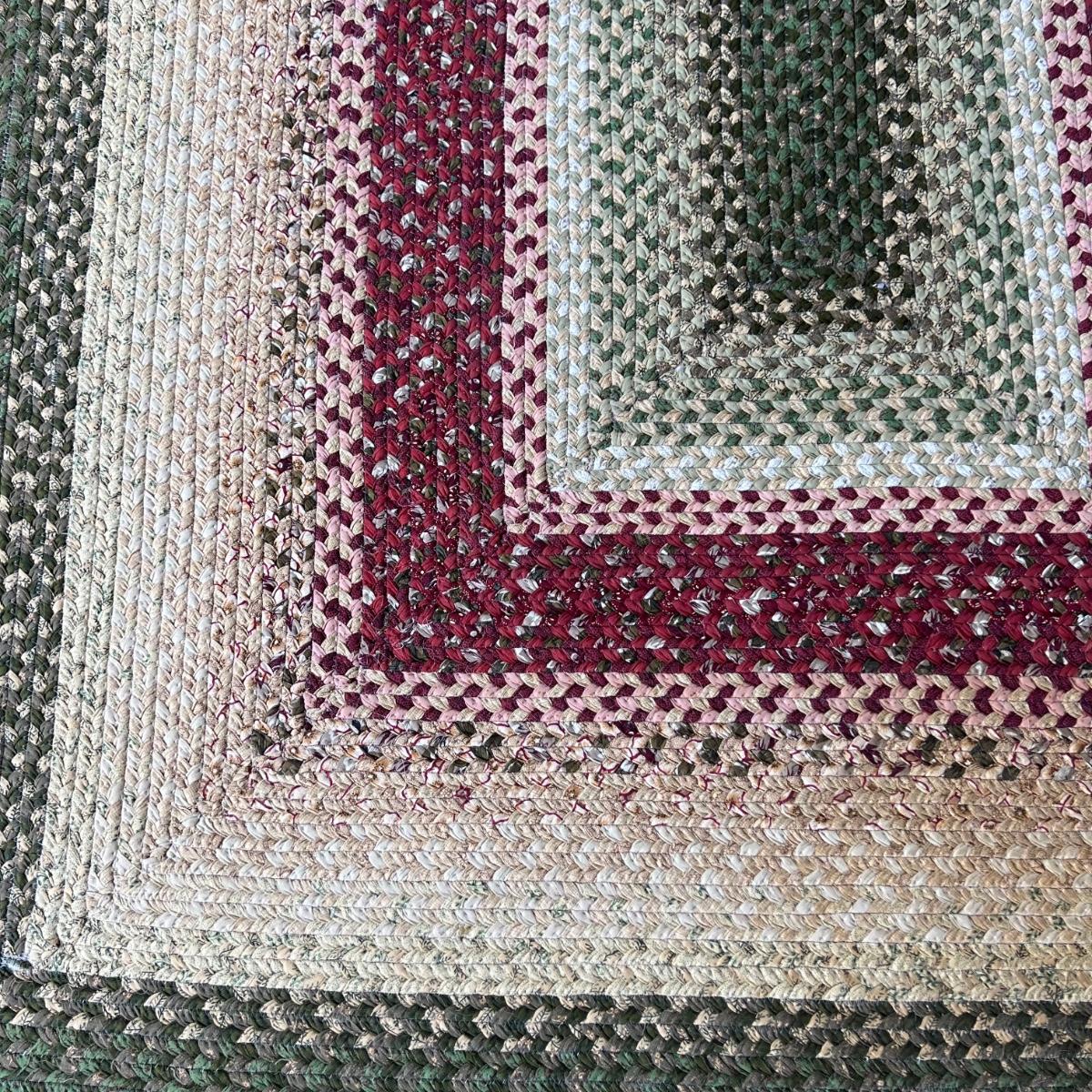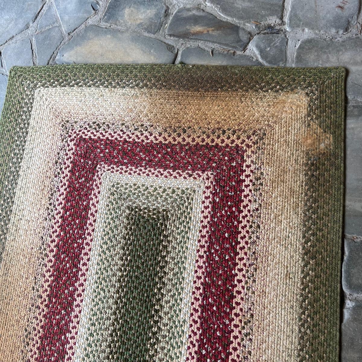 Rectangular rug in shades of green, gold, maroon and tan measures 48” x 72”. There is a notable stain in one corner, but there are no unusual odors. Local pickup only.