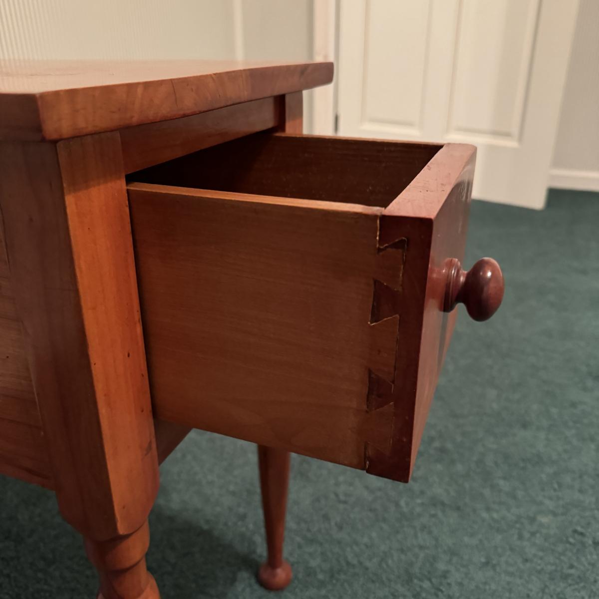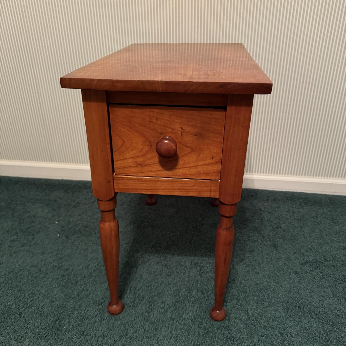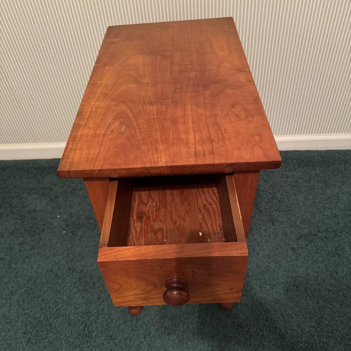 Solid wood side table in rectangular shape. Has one dovetail drawer. Some small blemishes on the top corner. Measures 23” x 13.5” x 22”H.