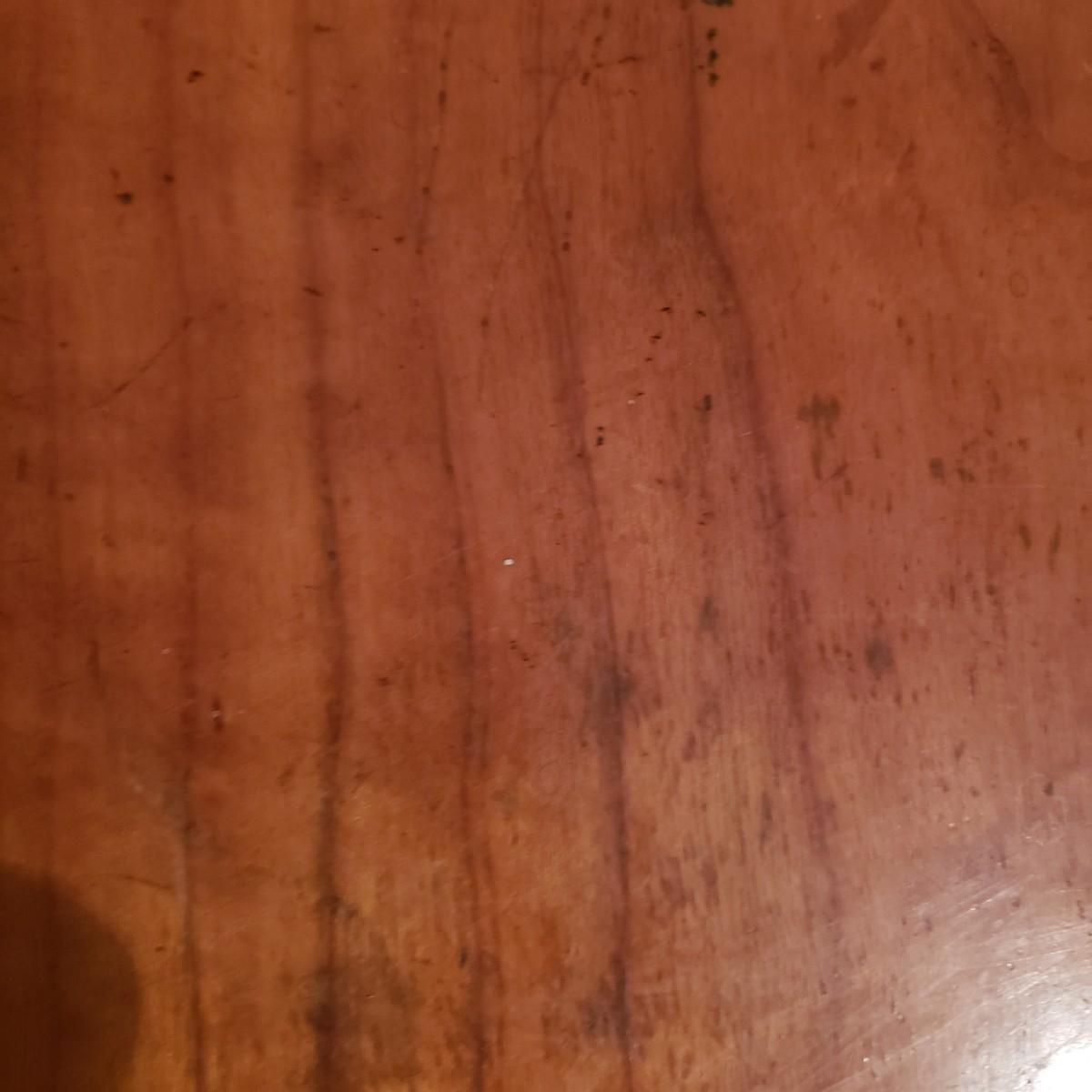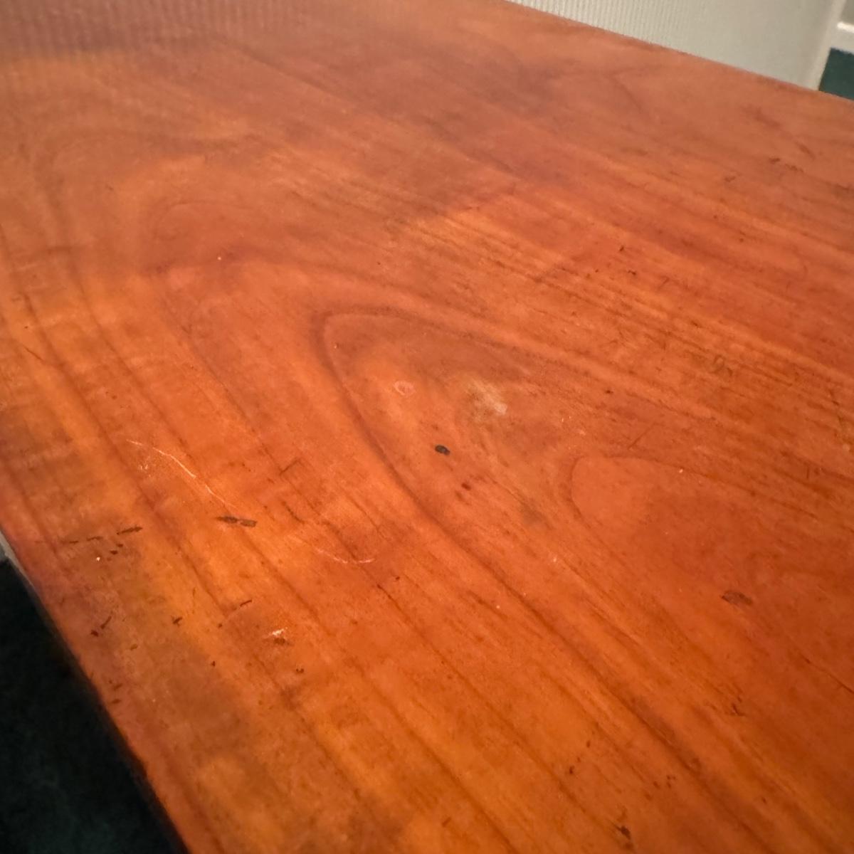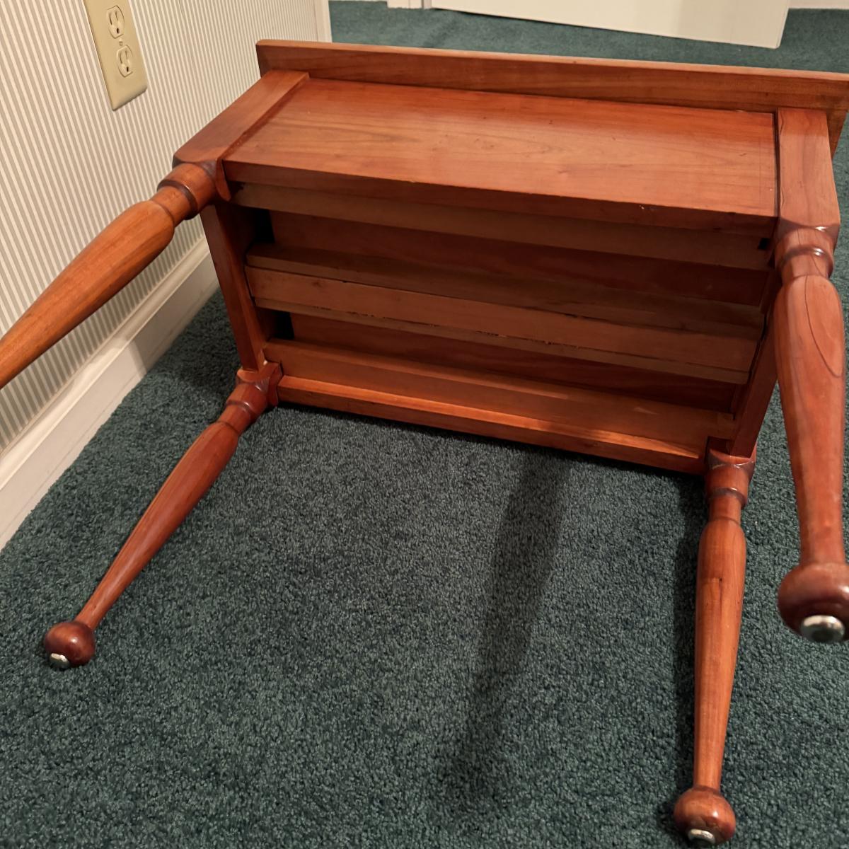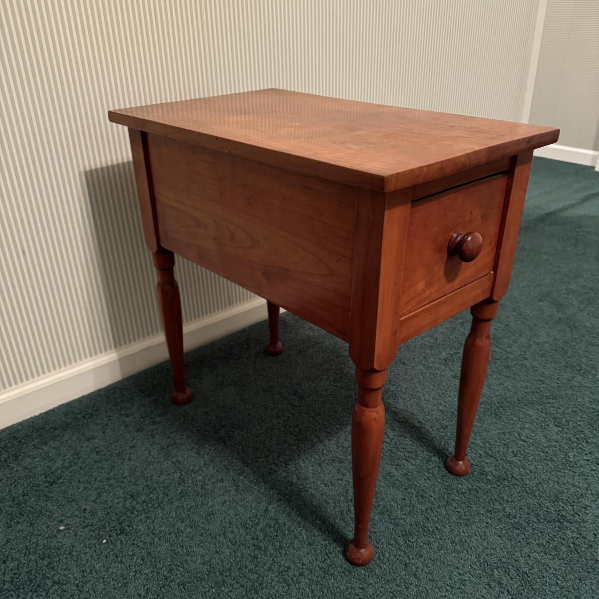 Solid wood side table in rectangular shape. Has one dovetail drawer. Some small blemishes on the top corner. Measures 23” x 13.5” x 22”H.