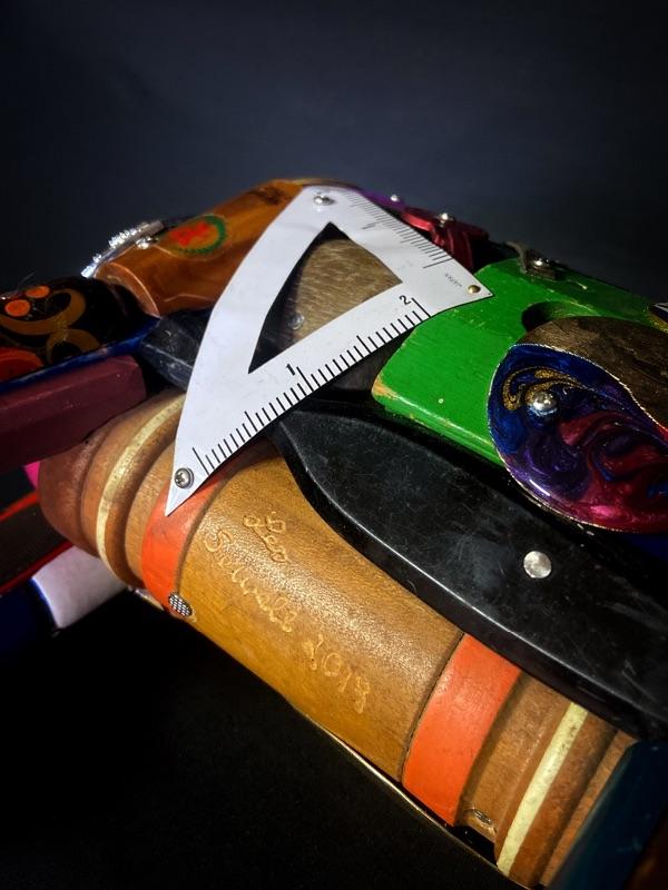 Measures 14”h x 6”d x 14”w. Signed by Leo Sewell. His sculptures are composed of recognizable objects of plastic, metal and wood. These objects are chosen for their color, shape, texture, durability and patina; then they are assembled using nails, bolts, and screws. The outdoor sculptures are constructed of stainless steel, brass, or aluminum found objects which are welded together. Packaging and shipping services available.