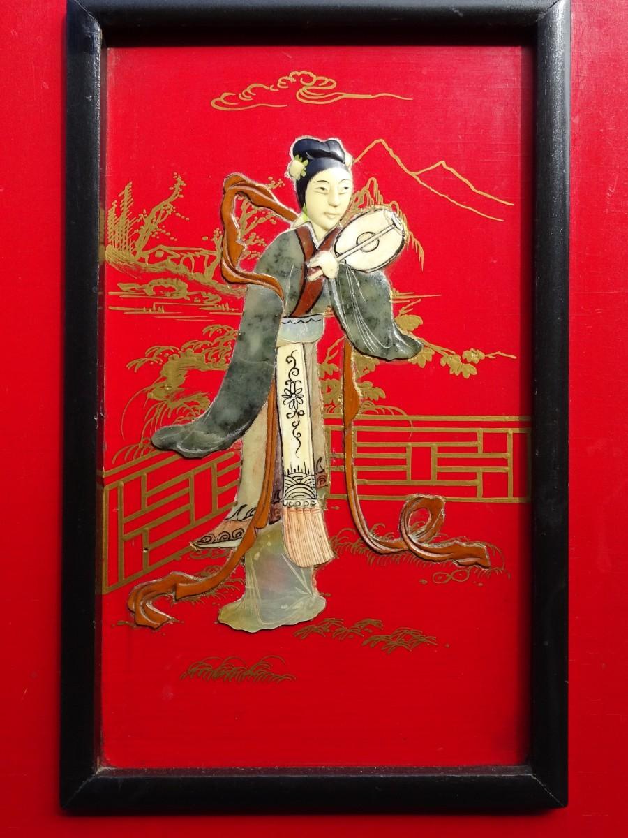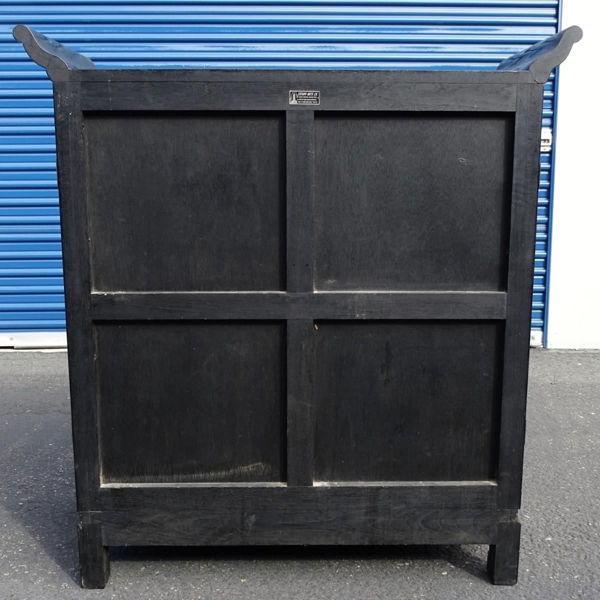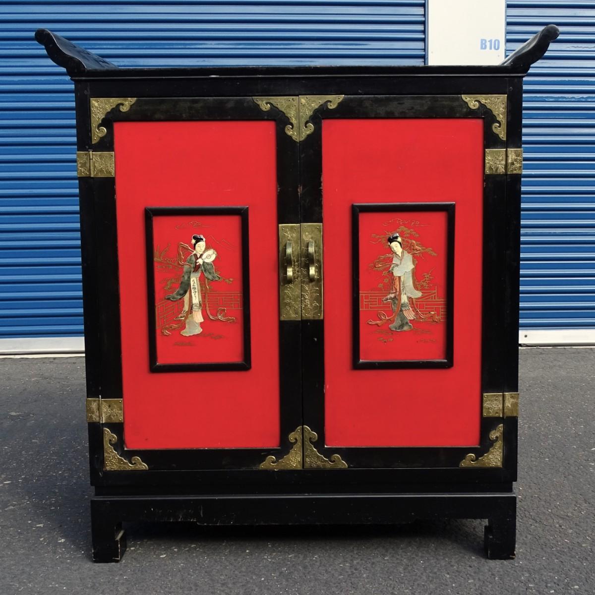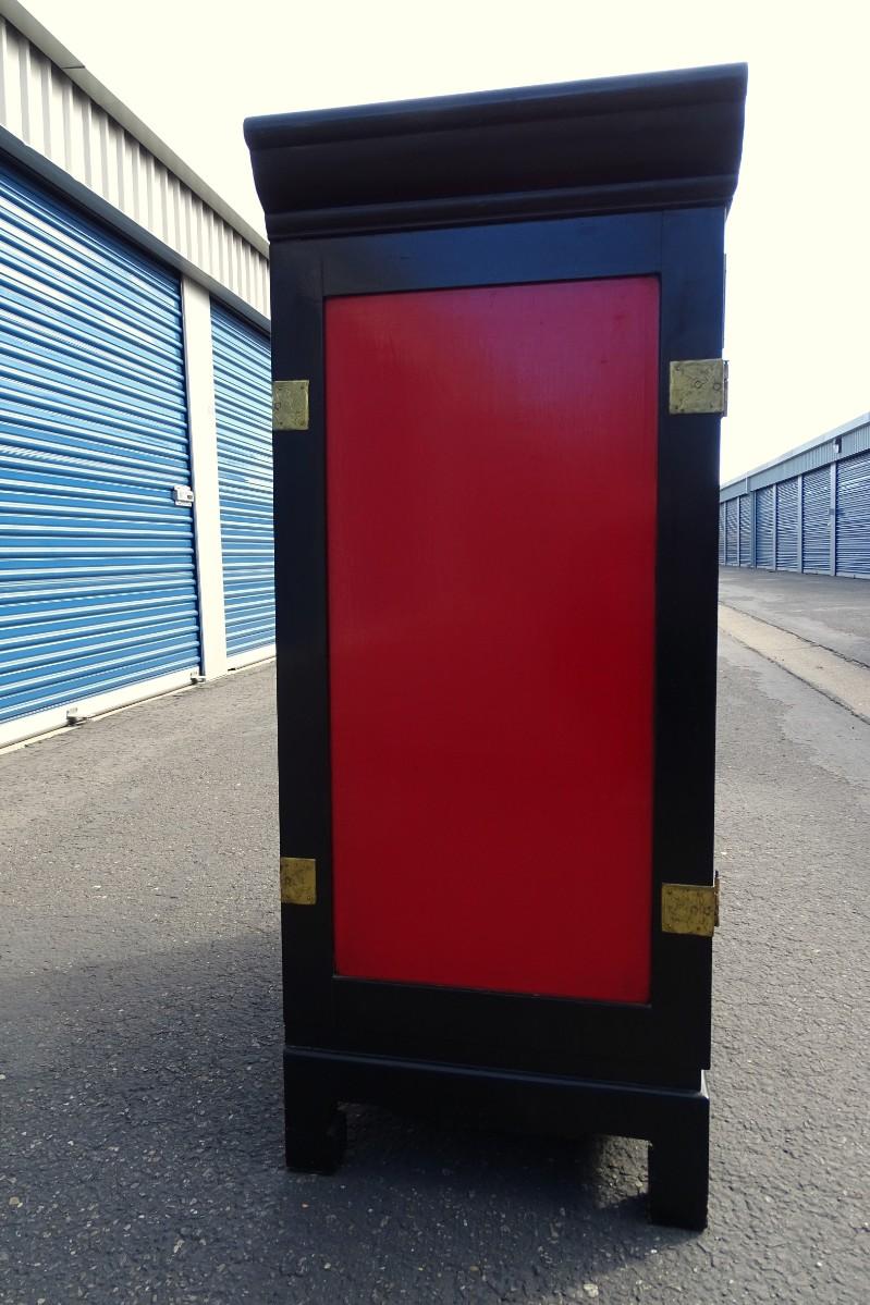 Red and Black Chinoiserie, Lacquered, Carved and Painted cabinet by Cathay Arts company. Some wear and tear.