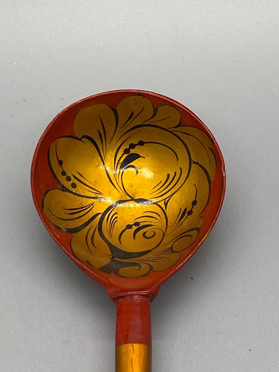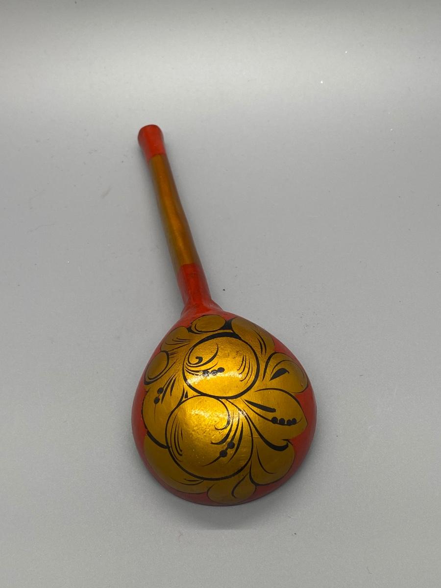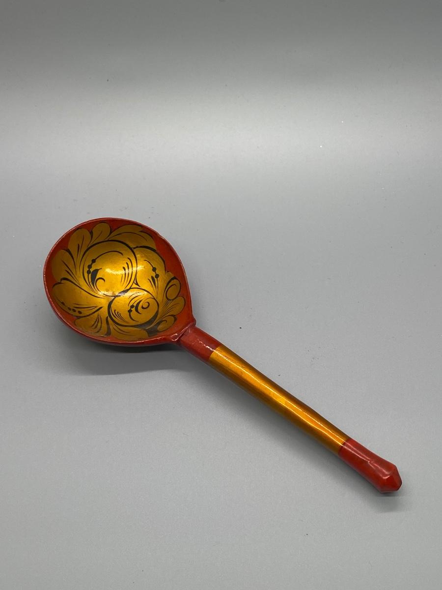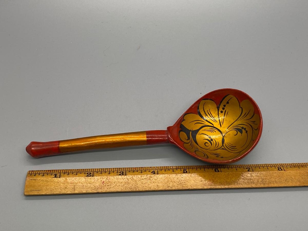 Red and gold painted Russian folk art spoon. Good vintage condition. Light wear from age.
