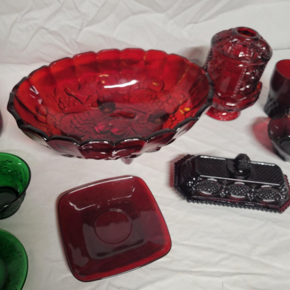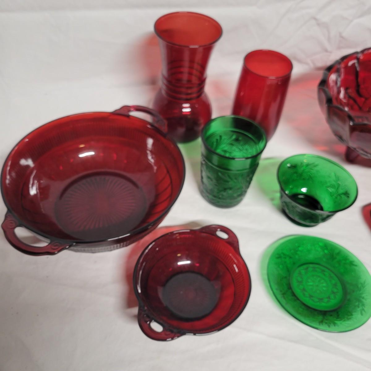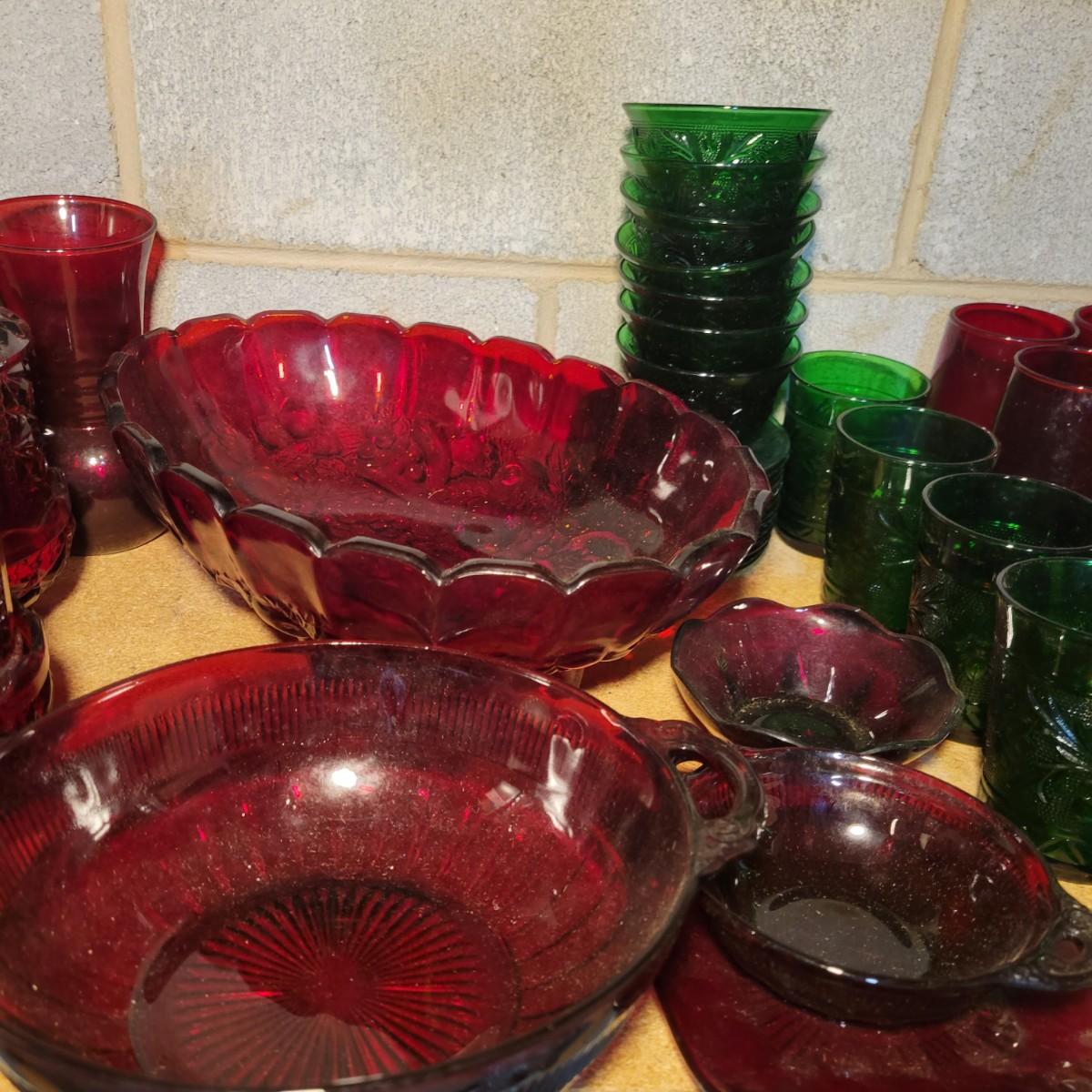A large assortment of red and green decorative glass that includes glasses, plates, vases, serving bowls, votive candle holders and more. The largest red serving bowl measures approximately 12.5" x 9" x 4.5"H. There are over 50 pieces in this lot. Local pickup only