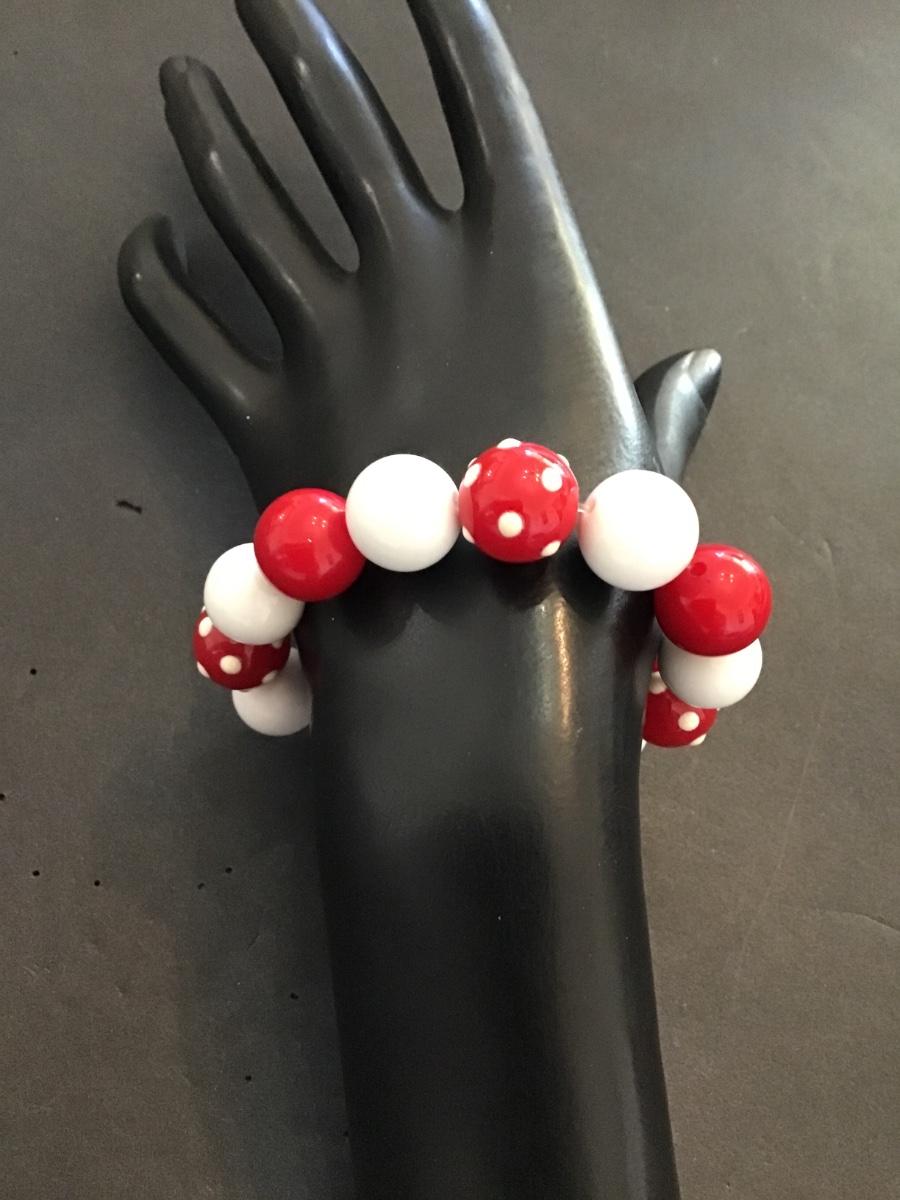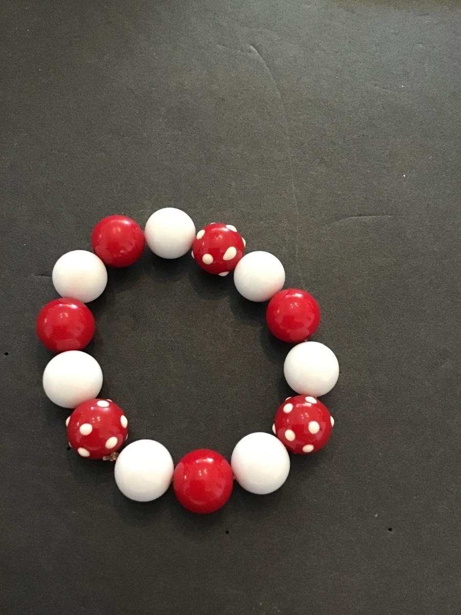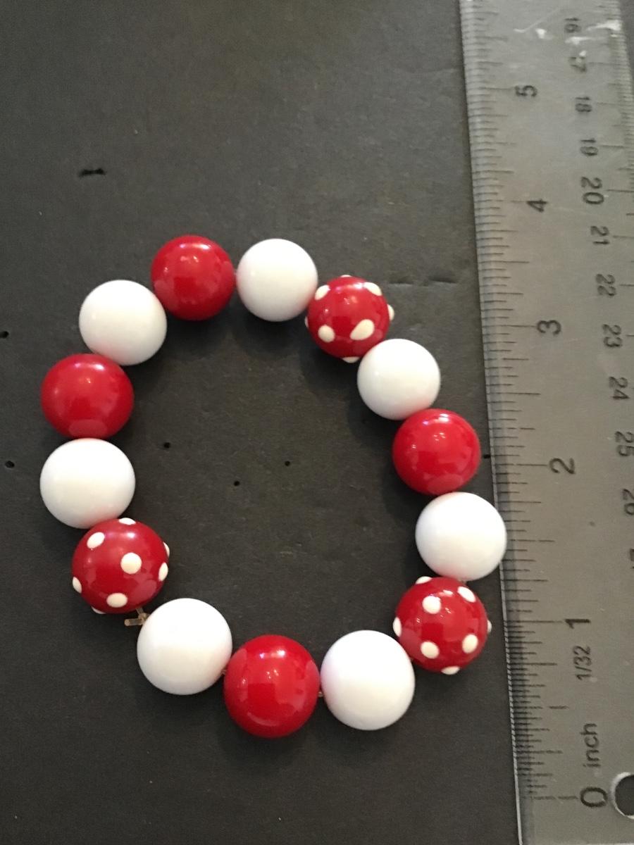 Red and white plastic beaded stretch bracelet. Please see attached photos.