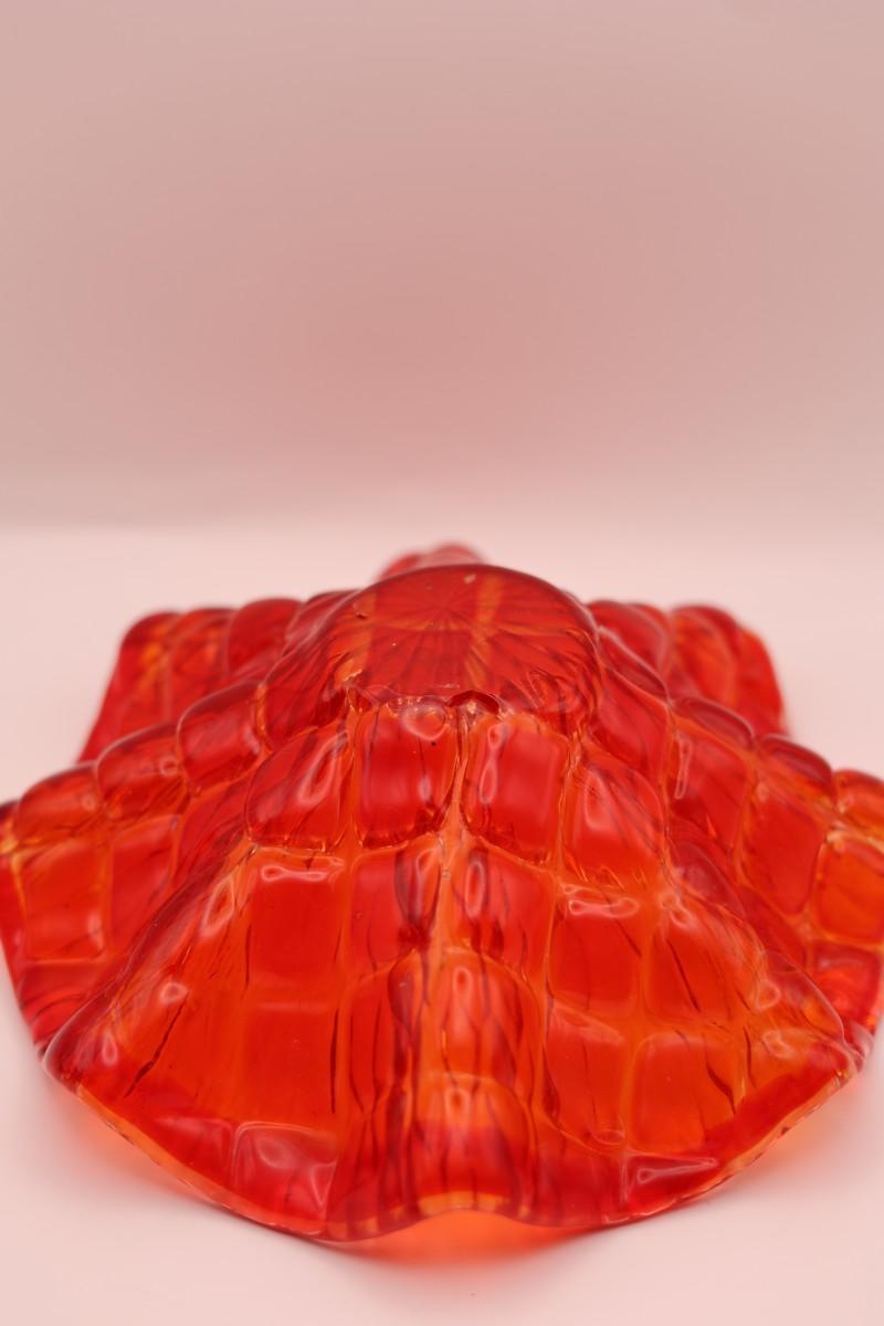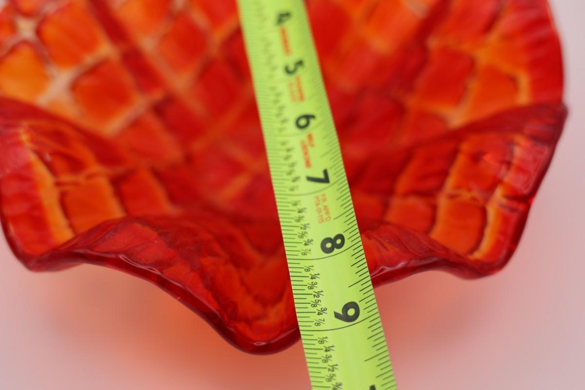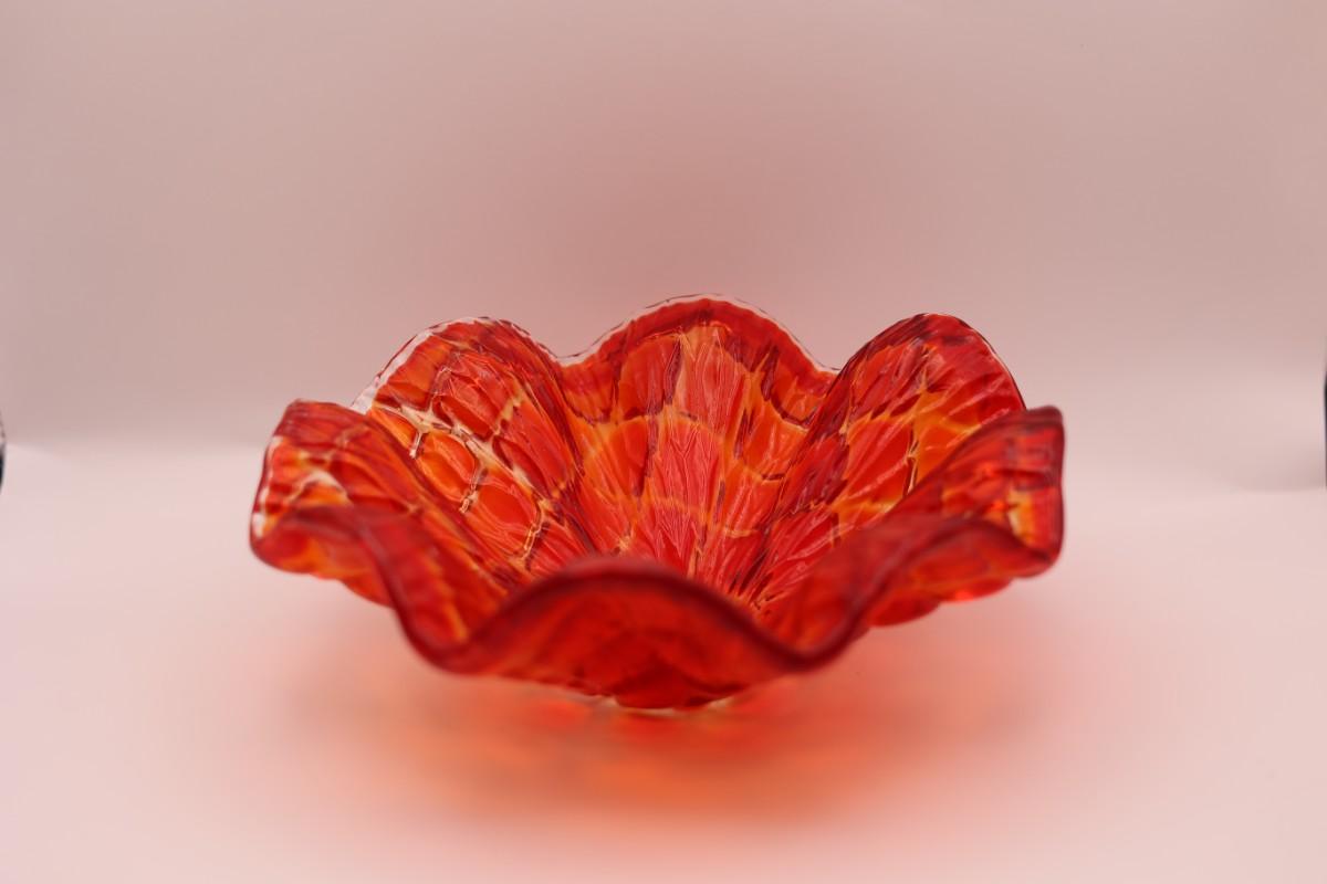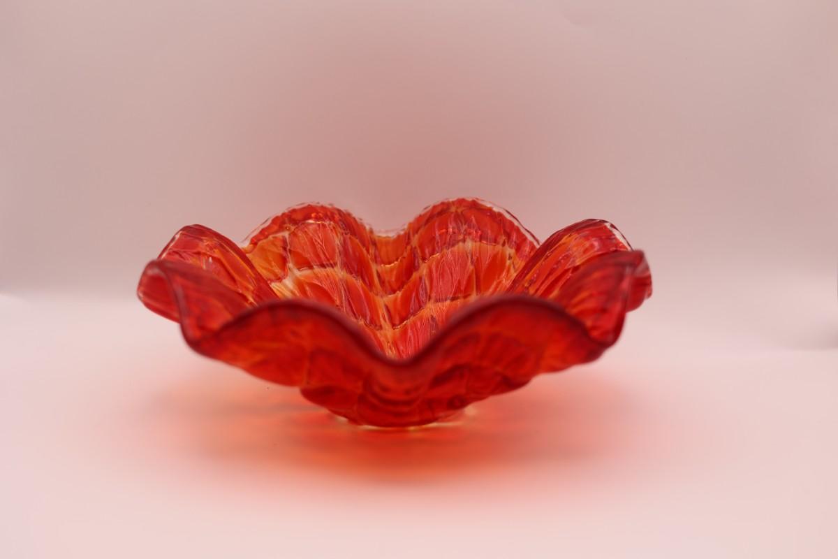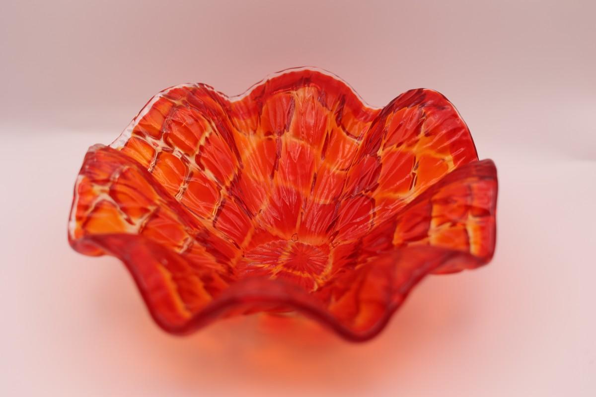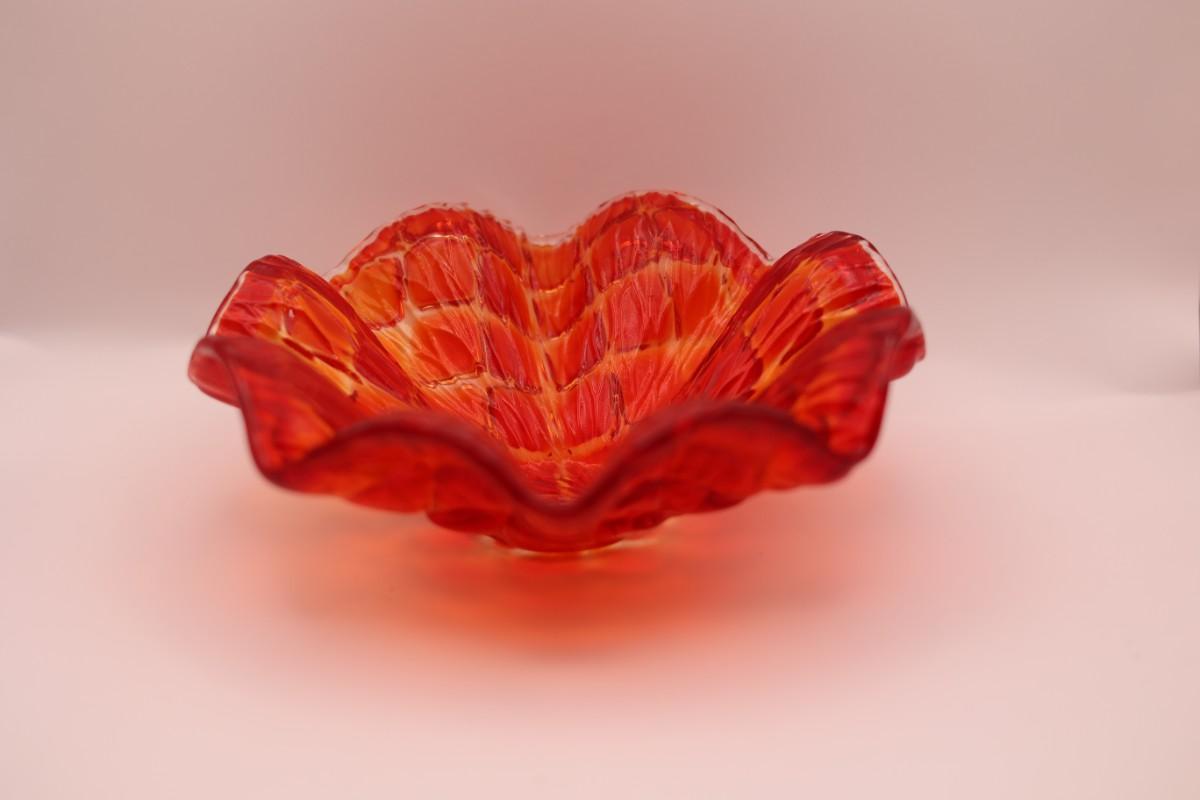 Decorative red art glass bowl with ruffled, scalloped edge and mottled coloration. No maker’s mark observed.