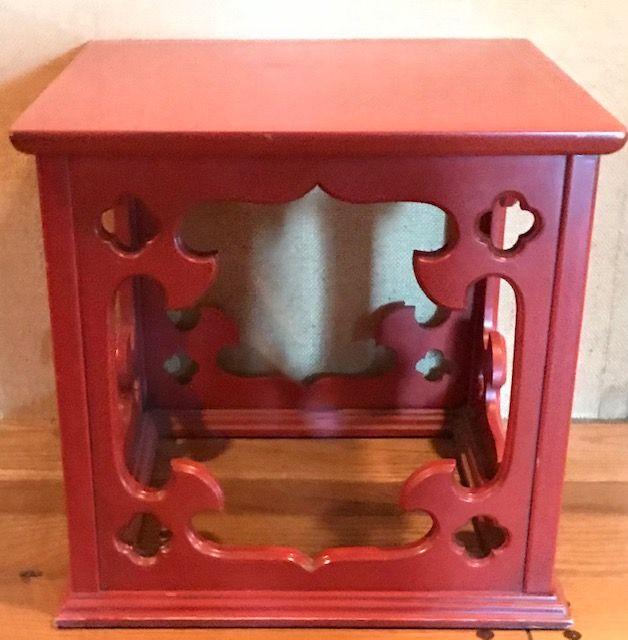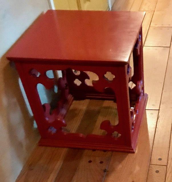 Measures 18 inches wide and 18 inches tall. Minor wear on top, chipped paint.