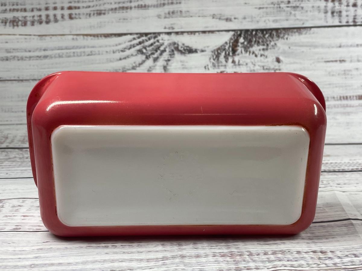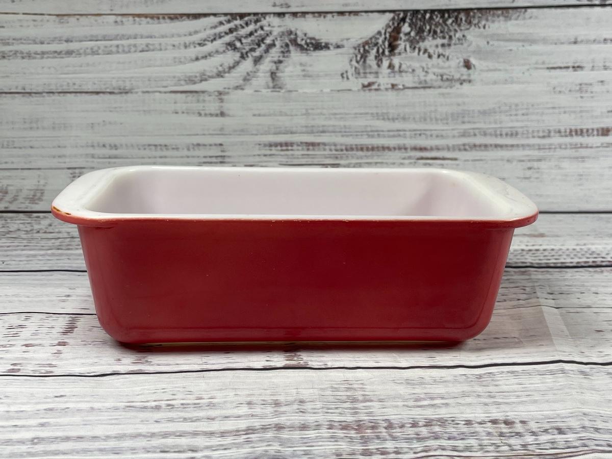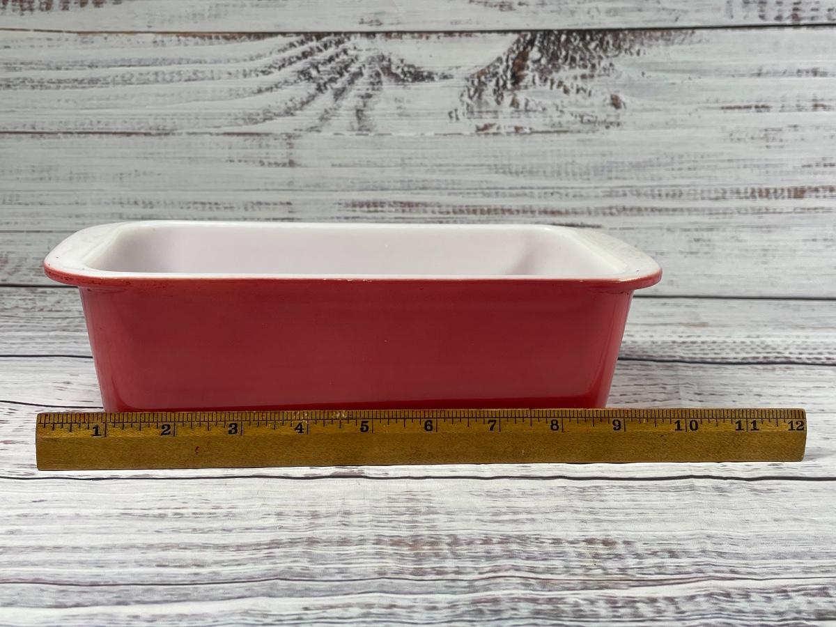 Vintage pink flamingo Pyrex bread/loaf pan. In a solid watermelon pink color. 1.5qt size. Item is in good condition. There is some faint discoloration on the item due to years of owning.
