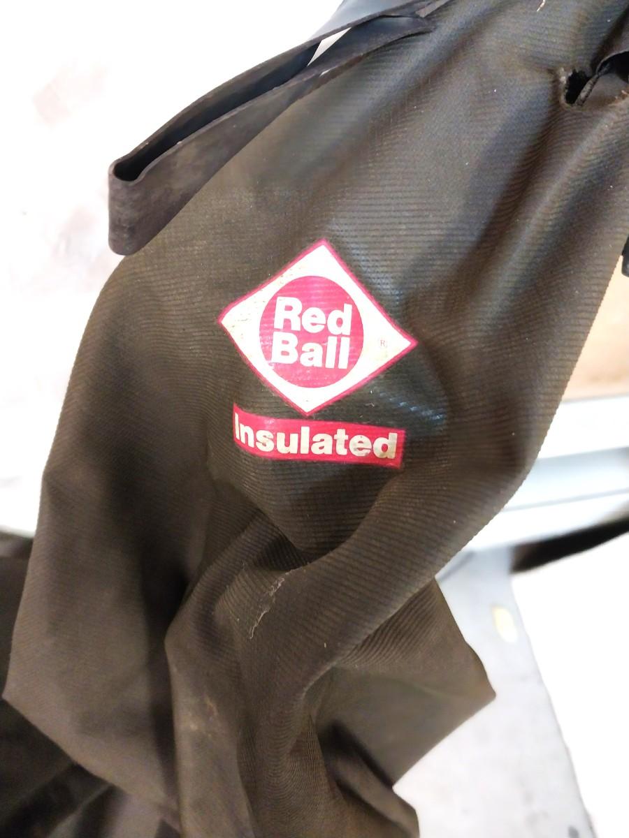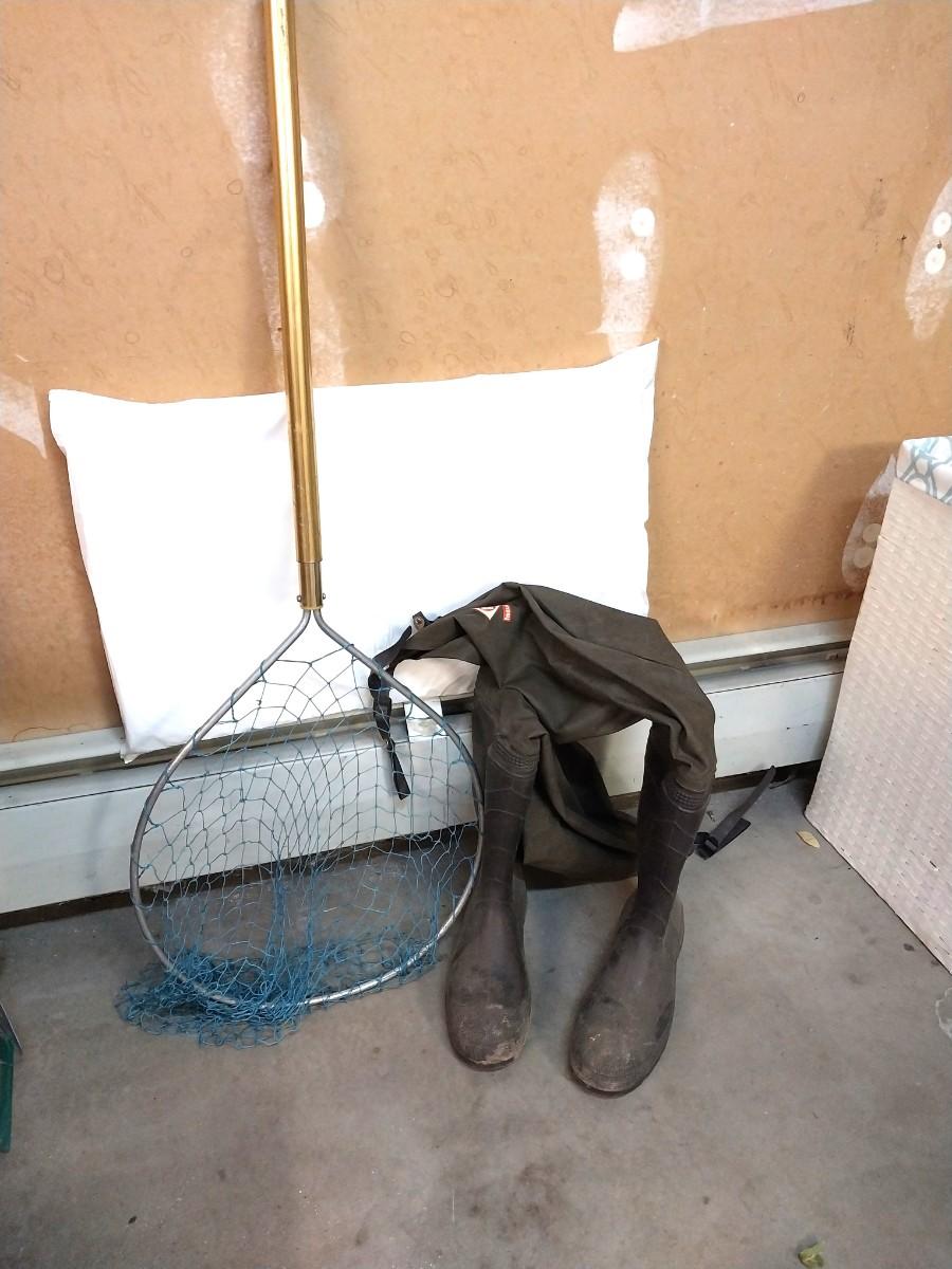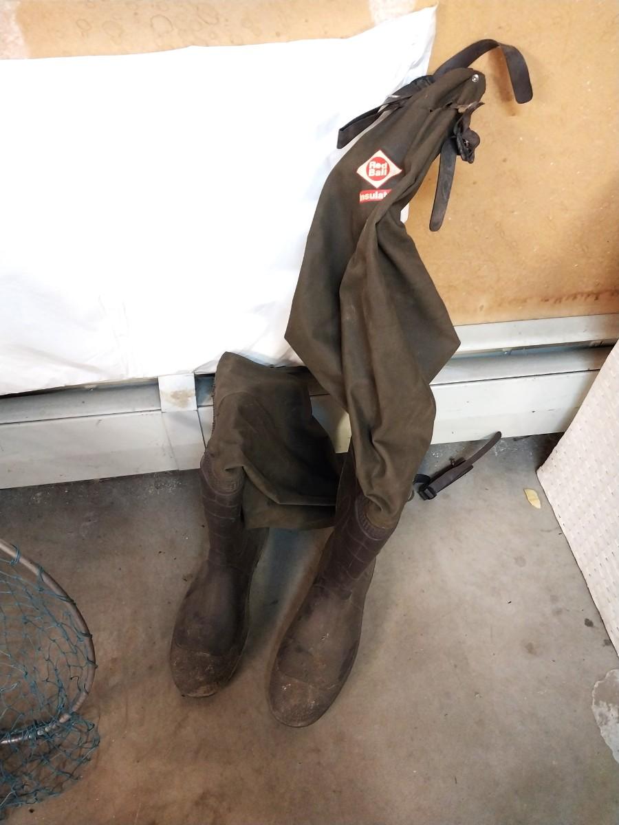 RED BALL INSULATED FISHING WADERS AND A LARGE NET