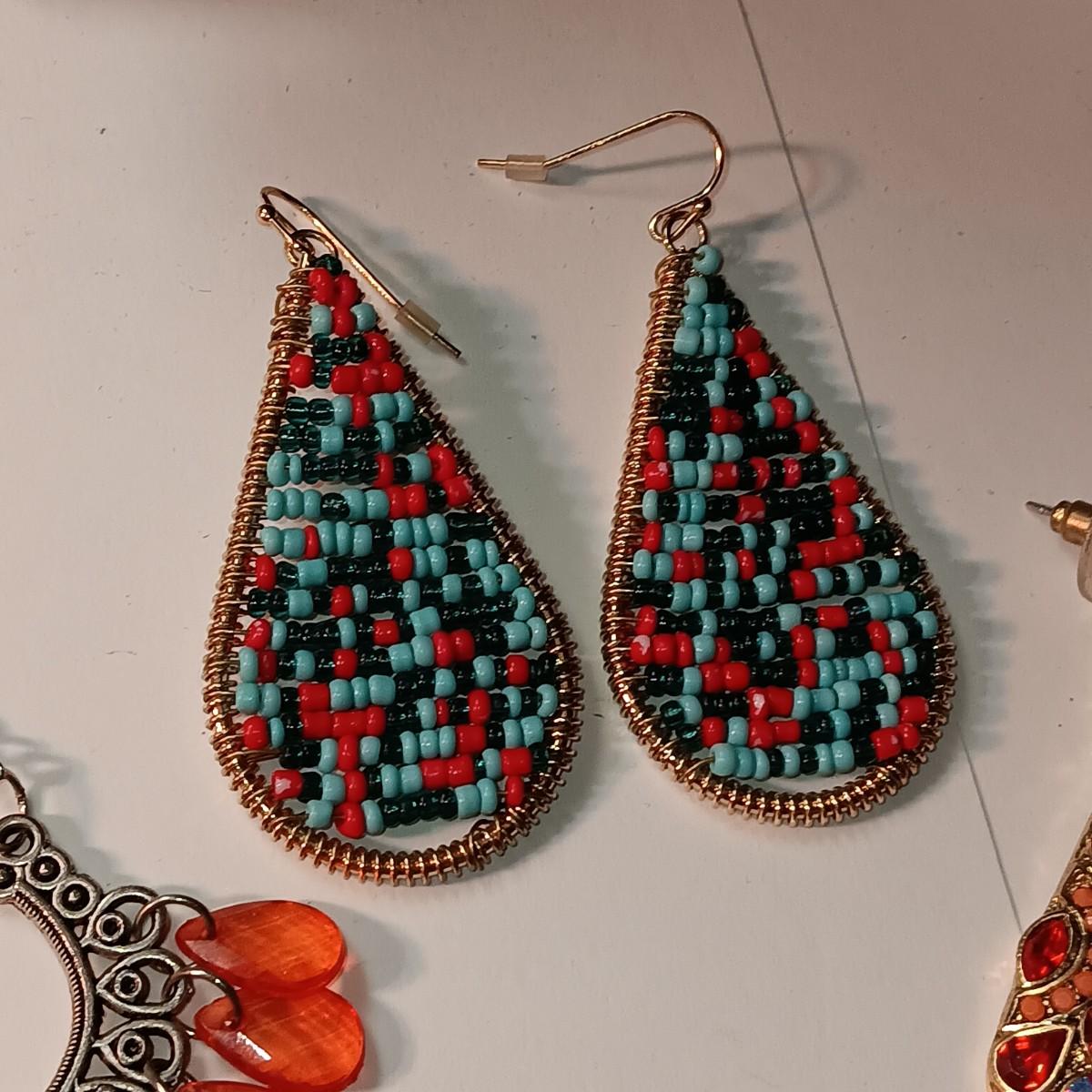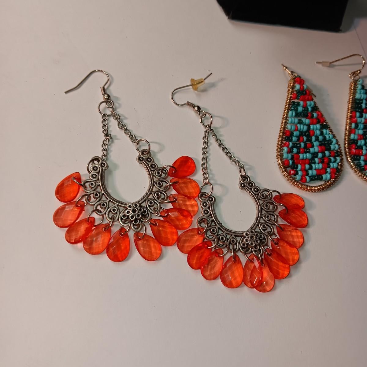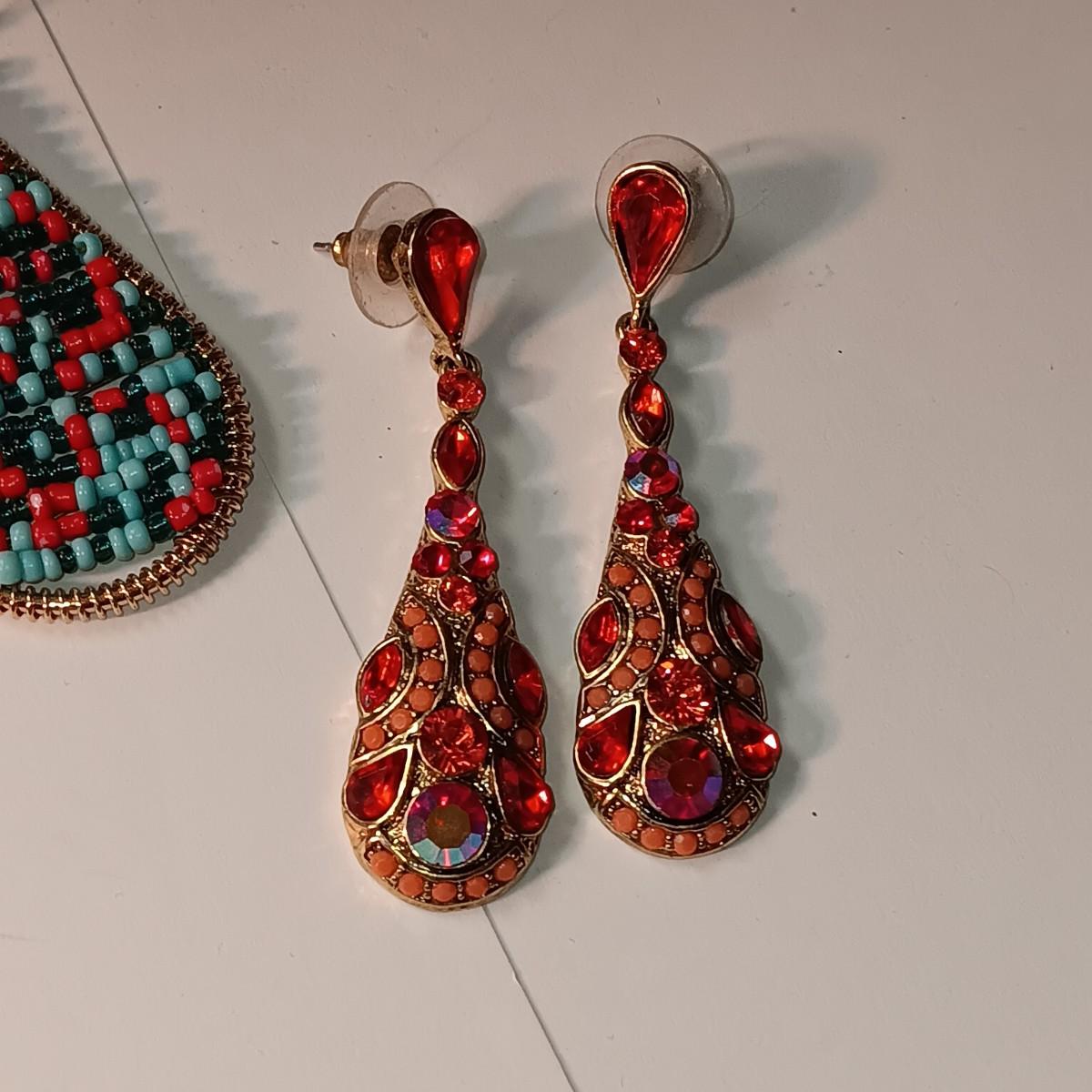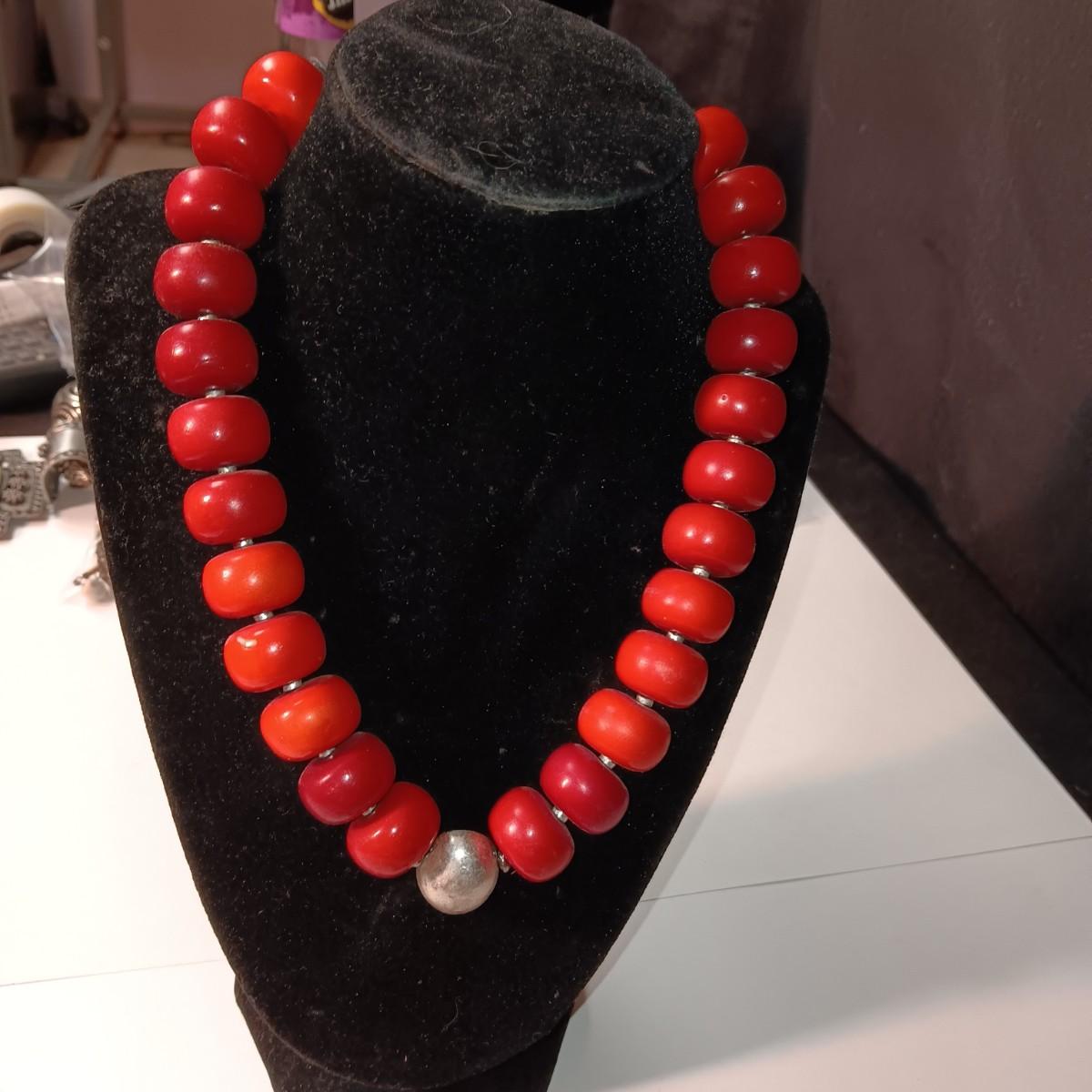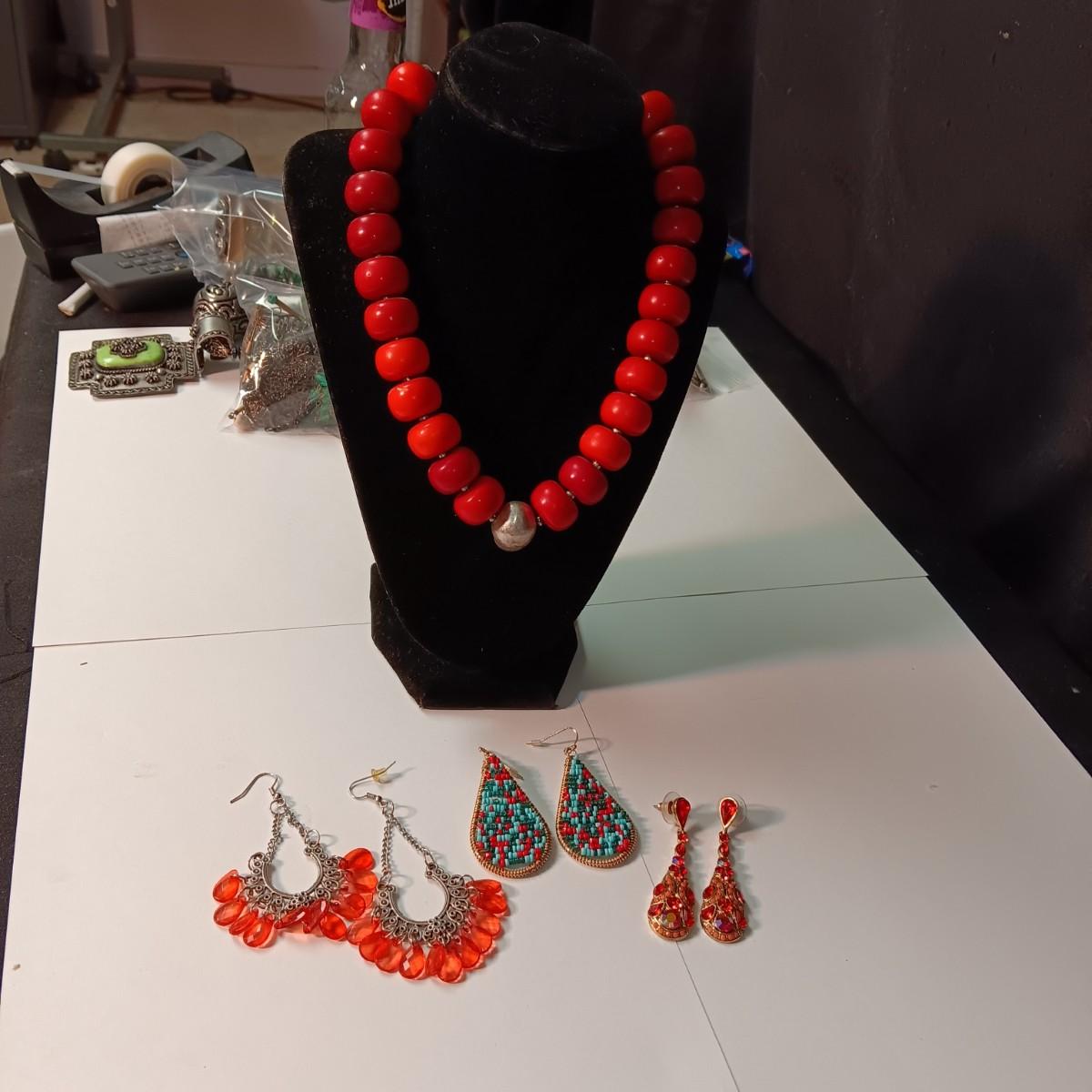 RED BEADED NECKLACE AND 3 PAIRS OF EARRINGS