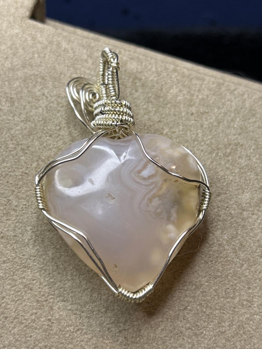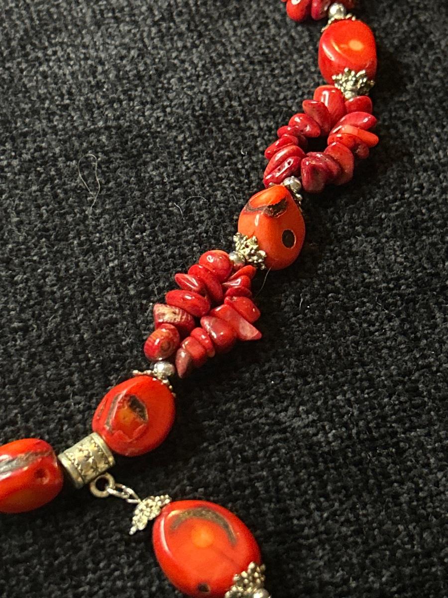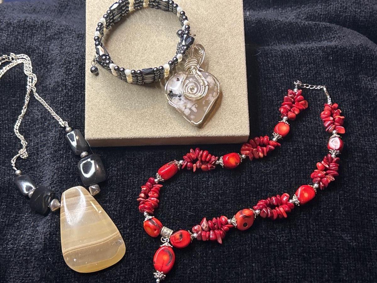 I believe the larger red pieces are coral. The large stone is Calcite, the hematite piece can be a bracelet or a necklace. the Agate pendant will need a strong chain.