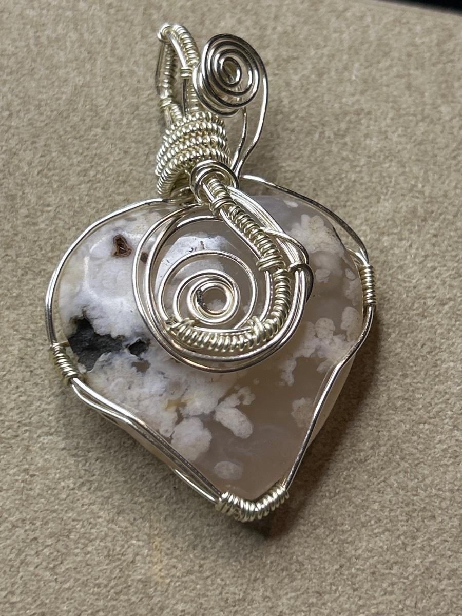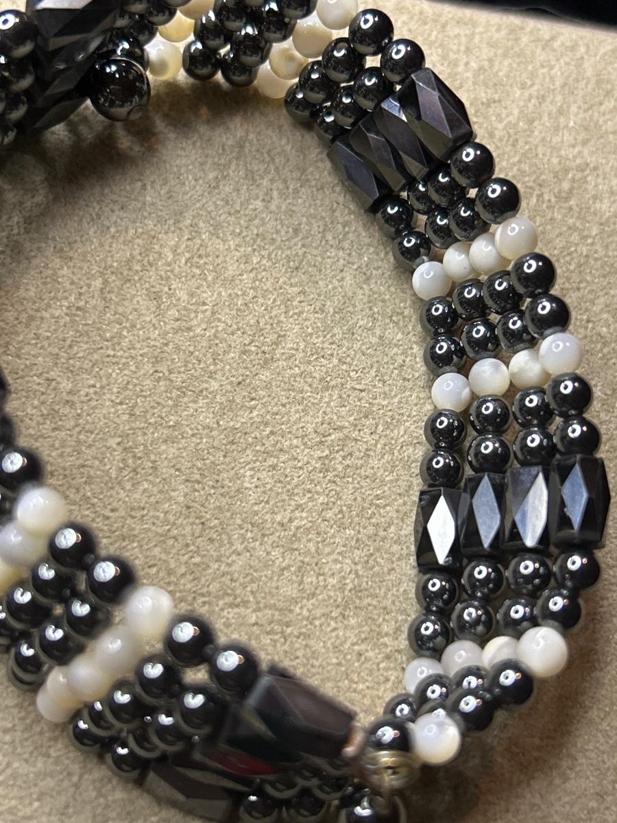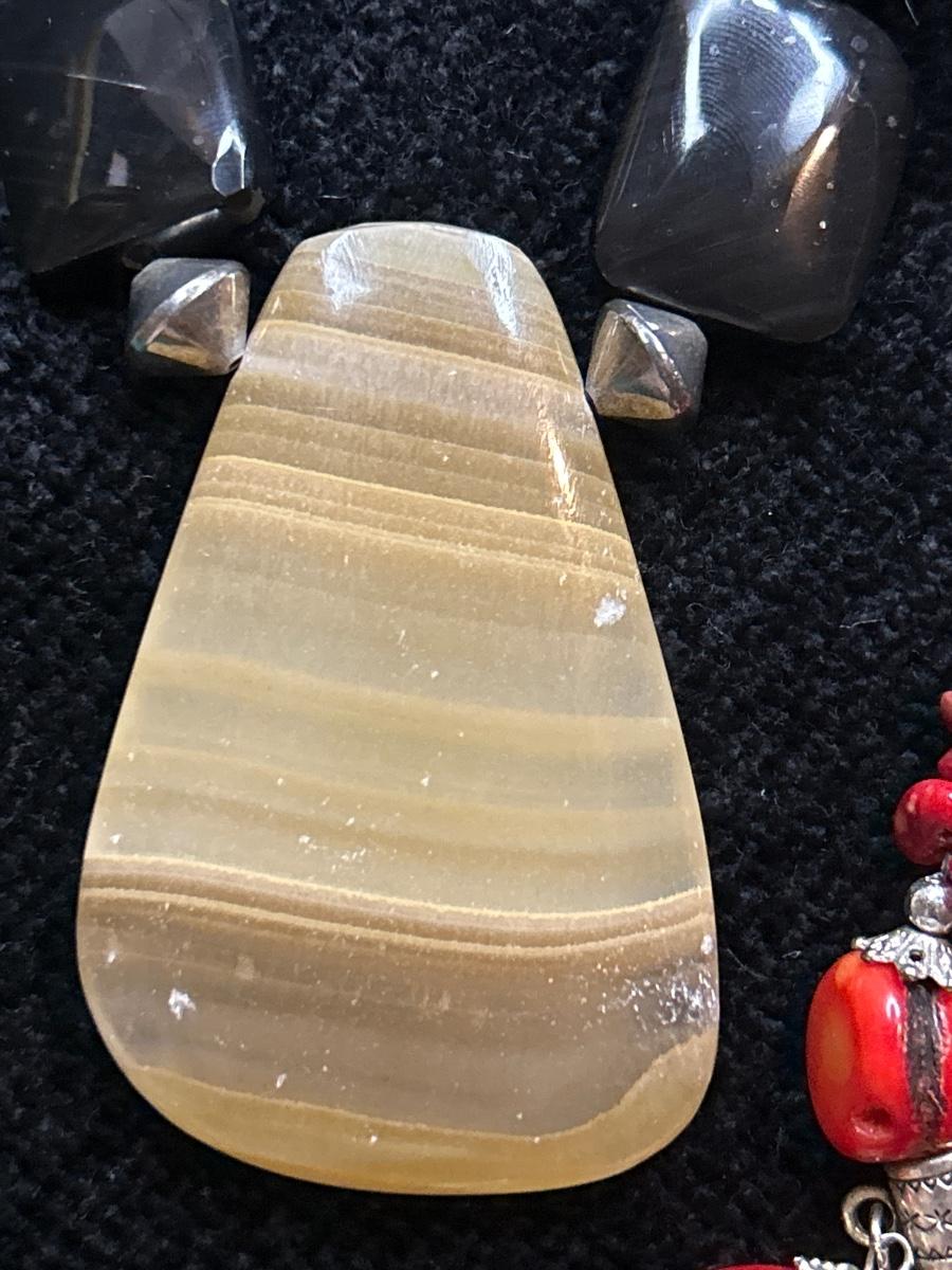 I believe the larger red pieces are coral. The large stone is Calcite, the hematite piece can be a bracelet or a necklace. the Agate pendant will need a strong chain.