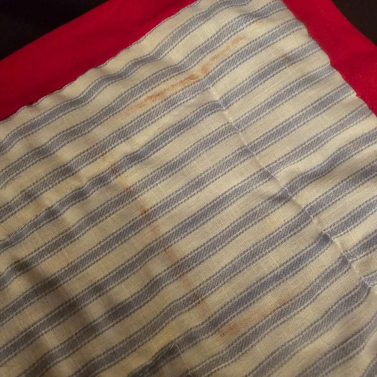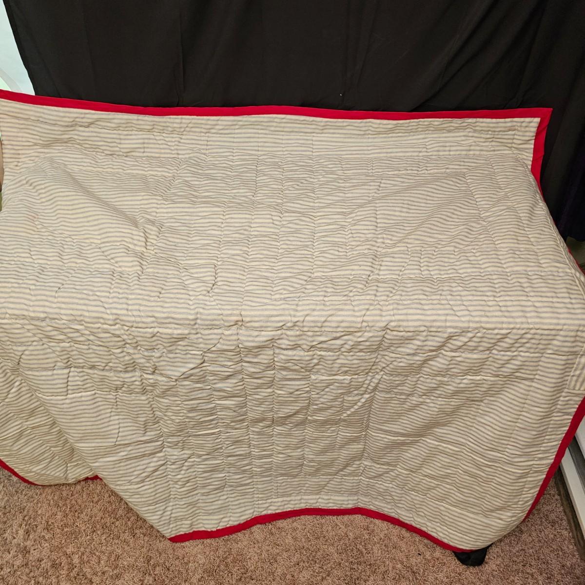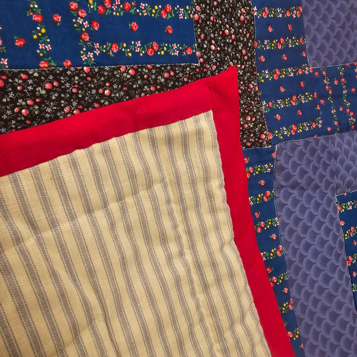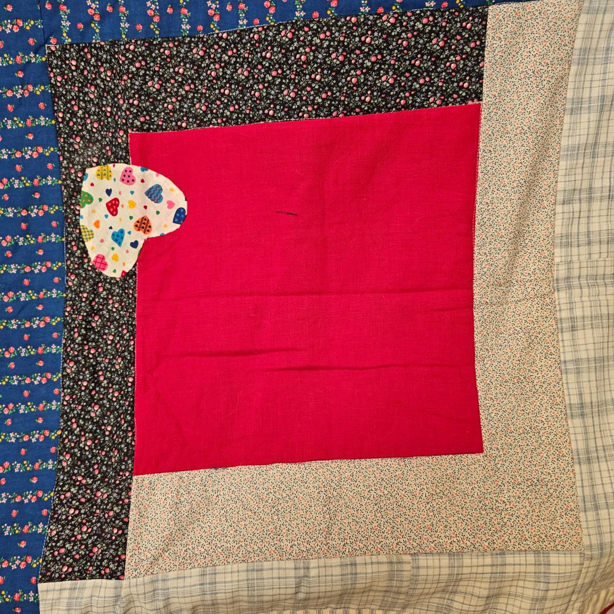 Small simple quilt in red and blue colors with a heart incorporated into each corner section. Blue/white ticking look backpack. Quilt is 56" square, has red binding trim. One back corner has some blemishes. See photos for details. Shipping available.