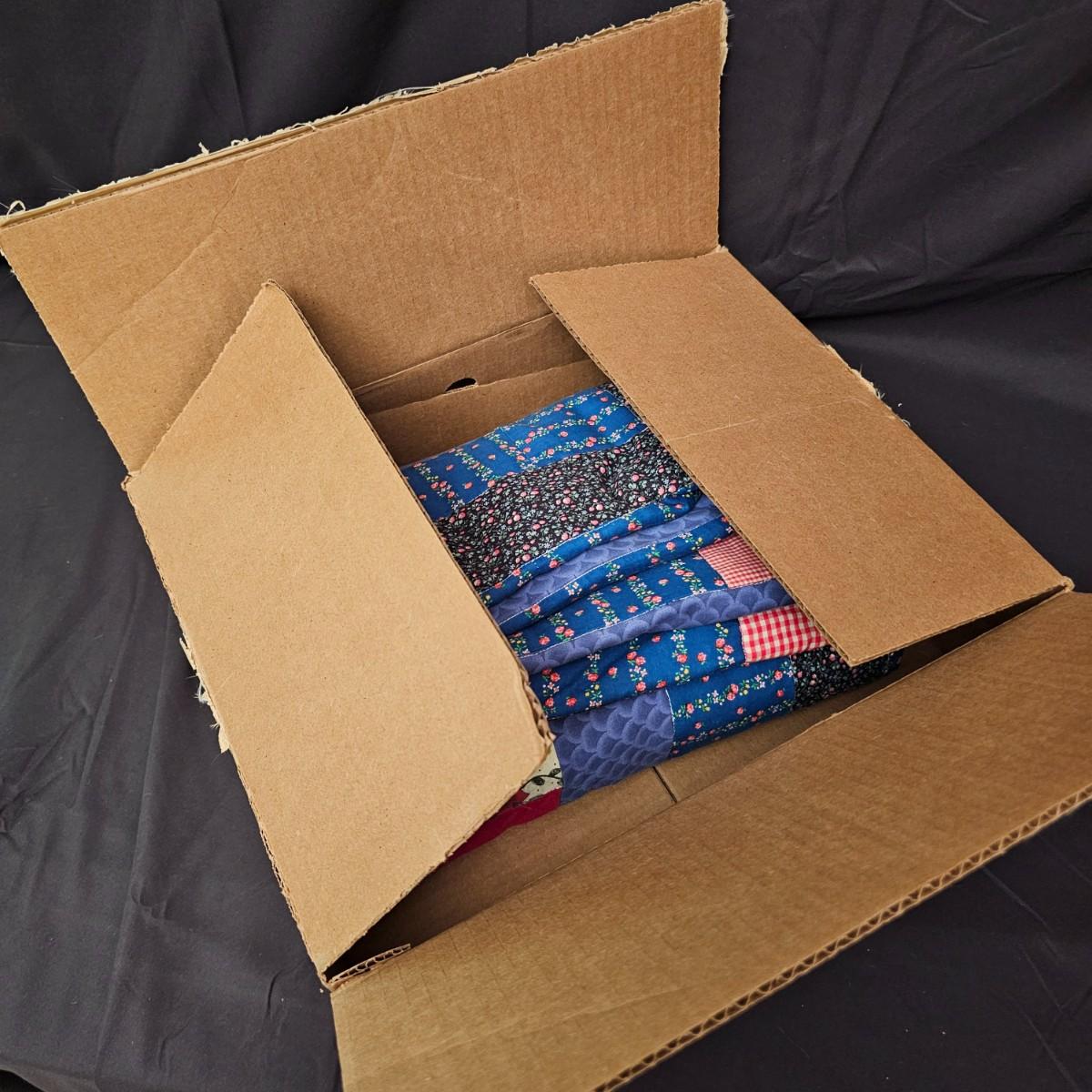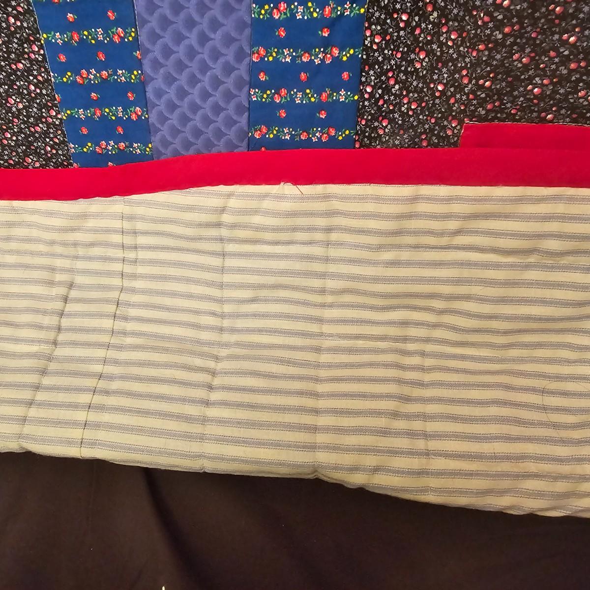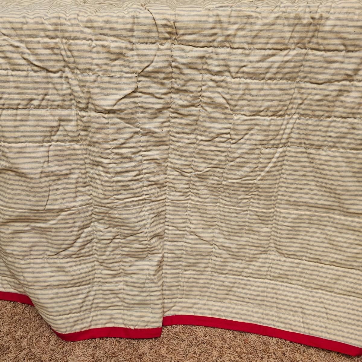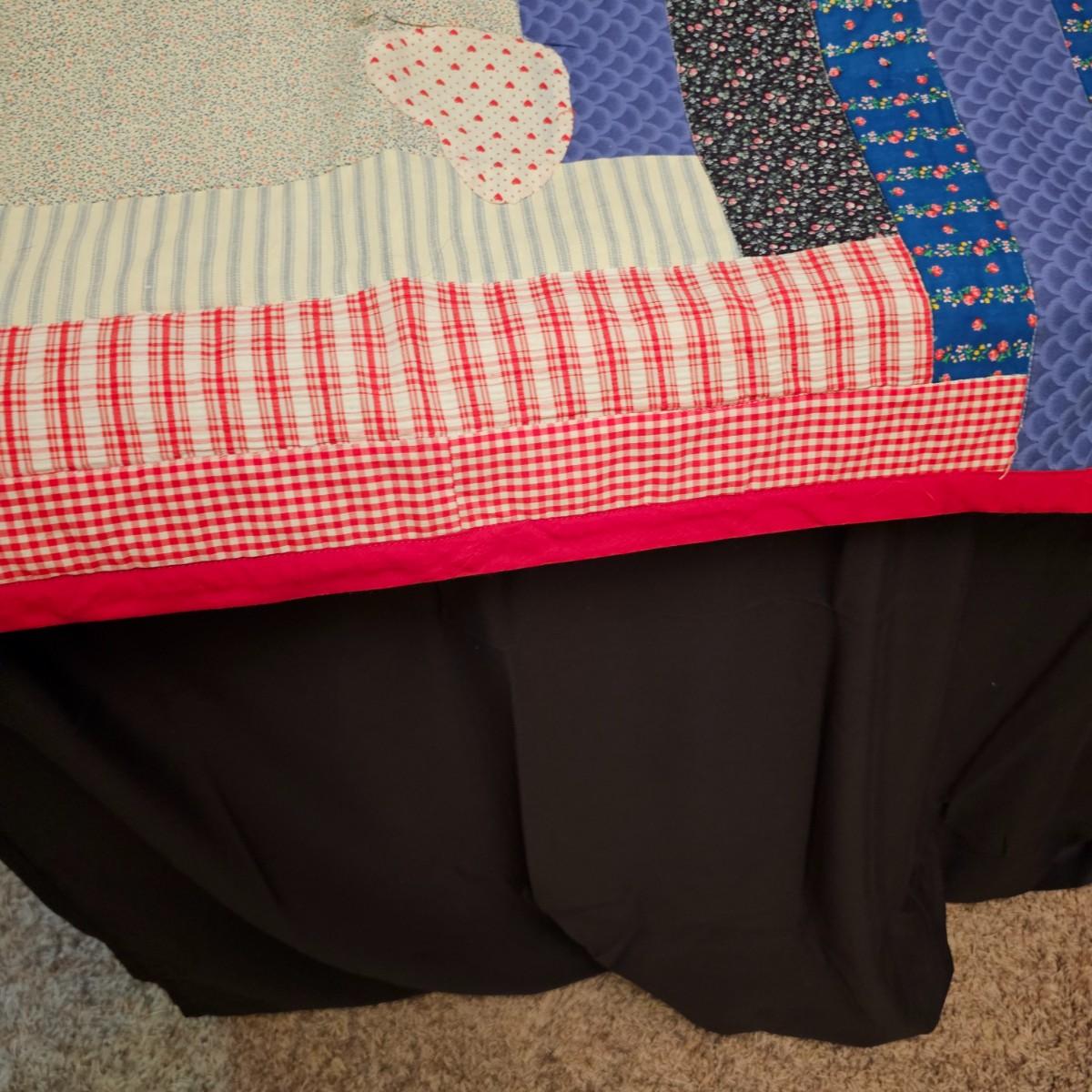 Small simple quilt in red and blue colors with a heart incorporated into each corner section. Blue/white ticking look backpack. Quilt is 56" square, has red binding trim. One back corner has some blemishes. See photos for details. Shipping available.
