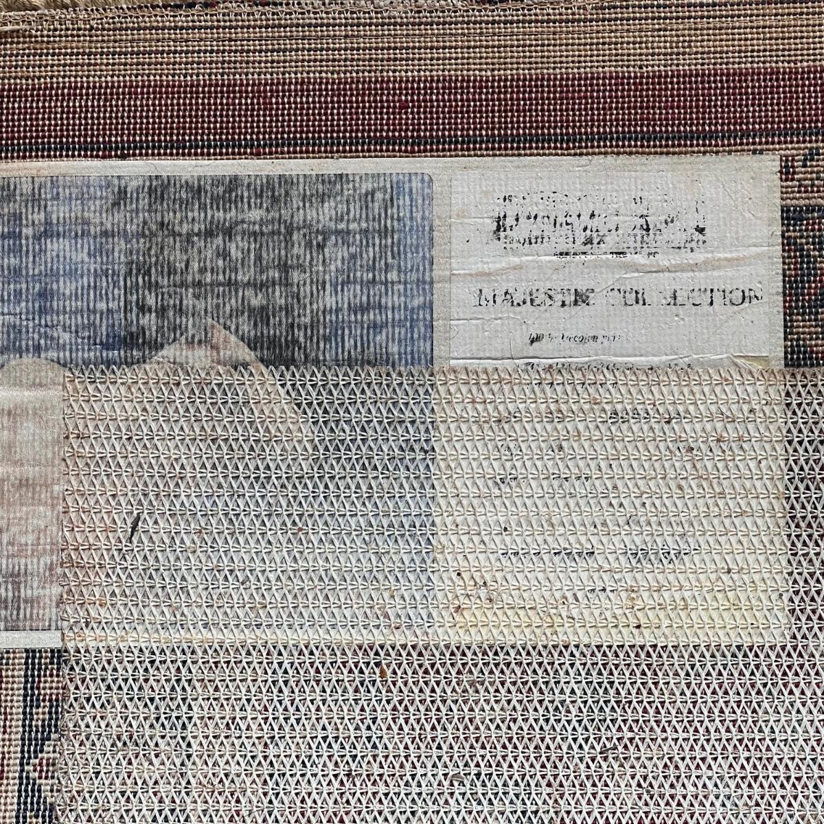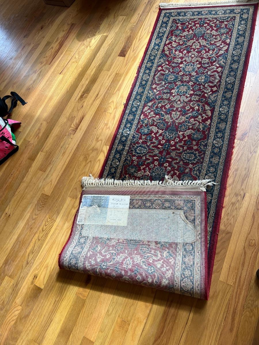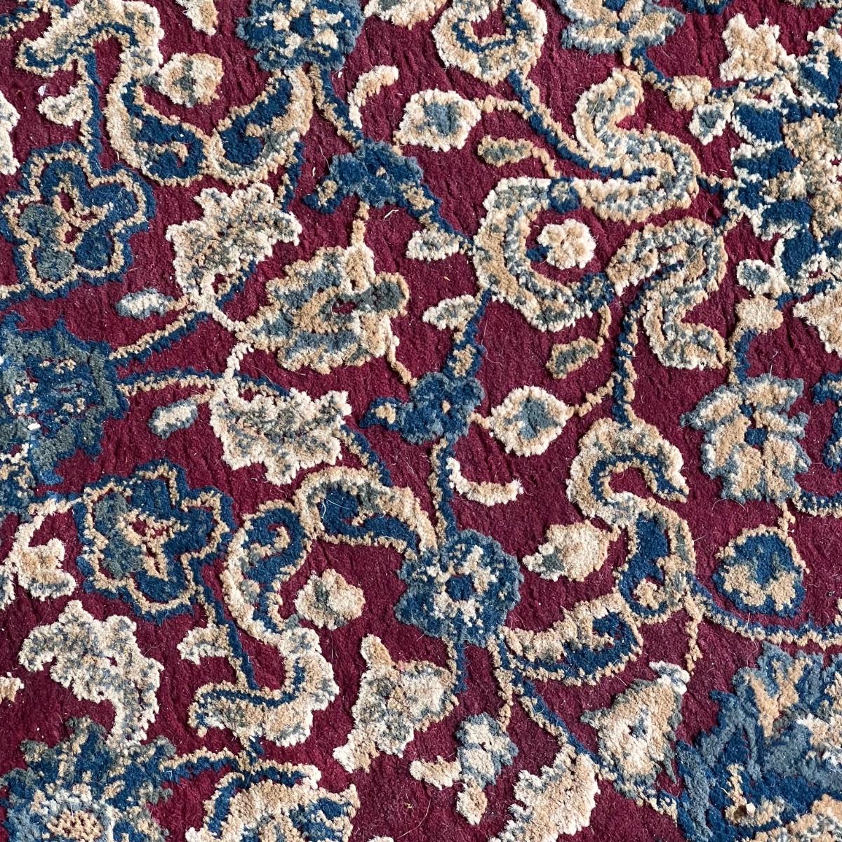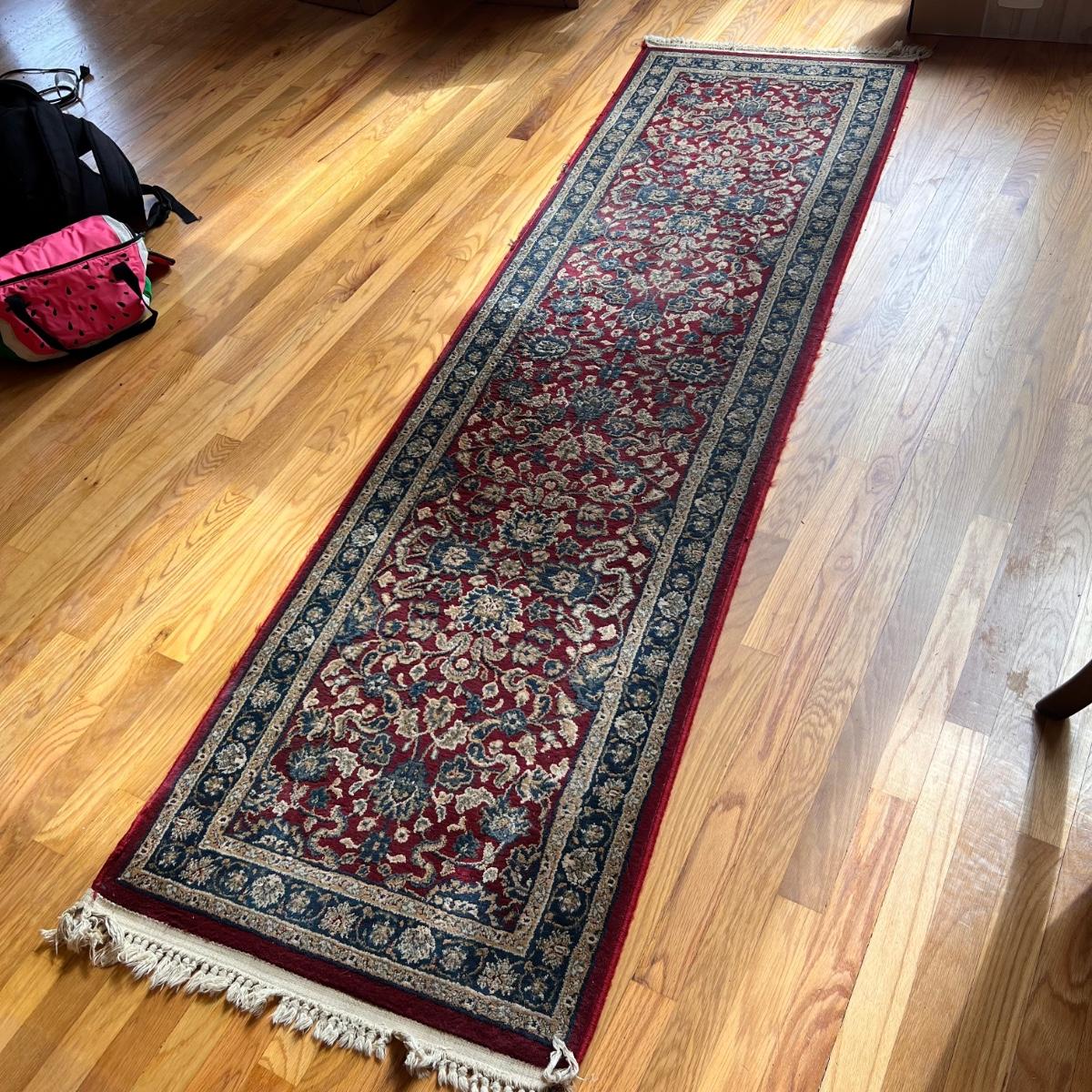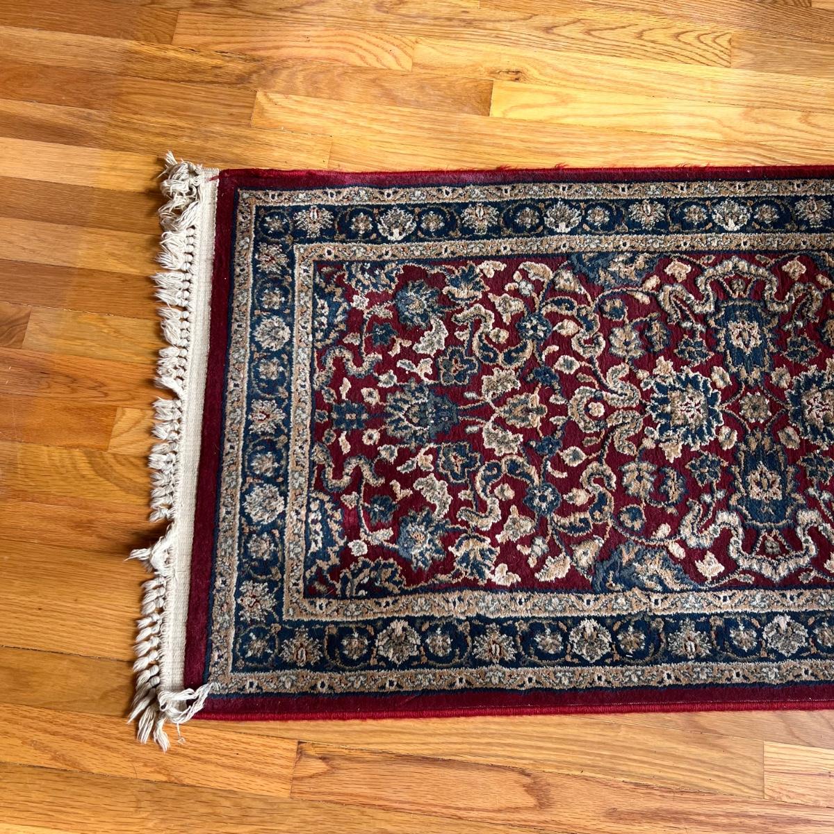 This runner rug has a dark red background with blues and brown floral design. Measures 2’2” x 7’9”.