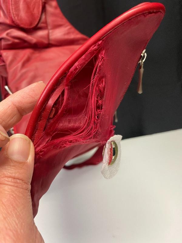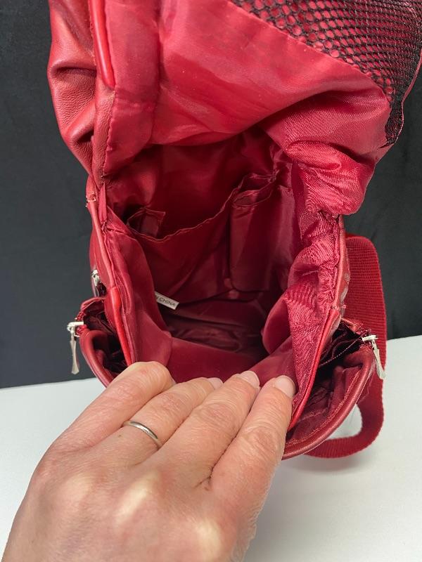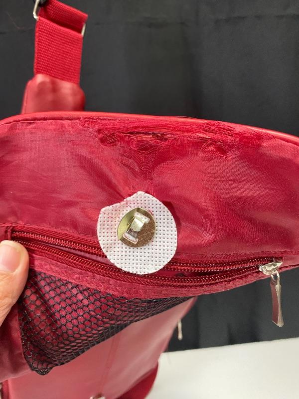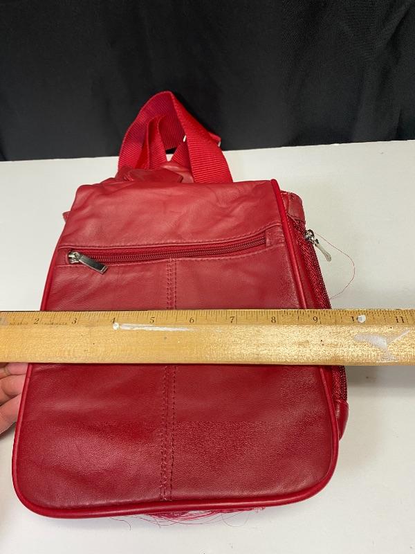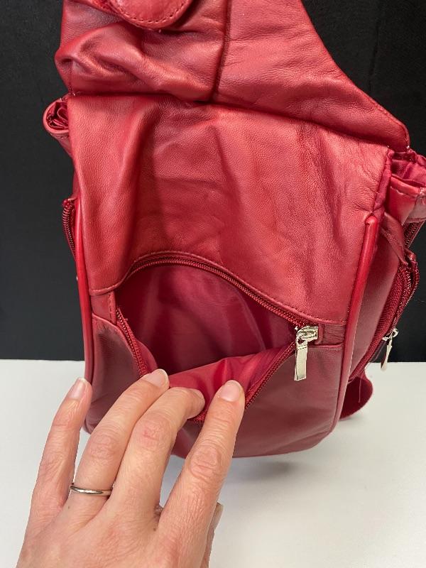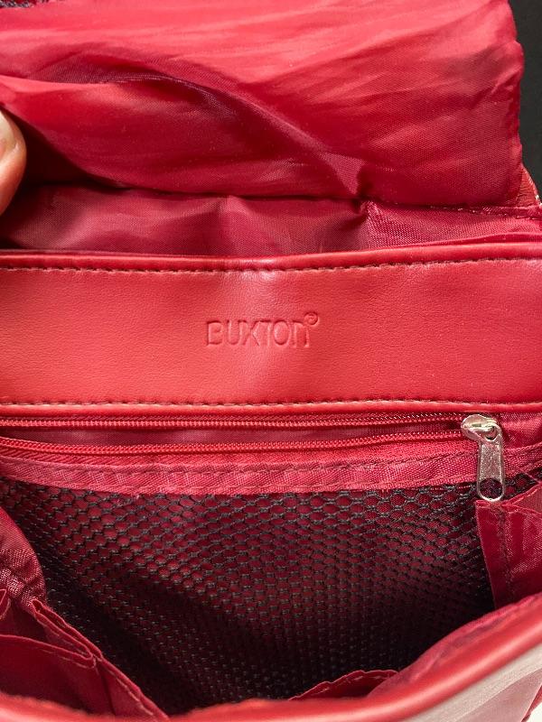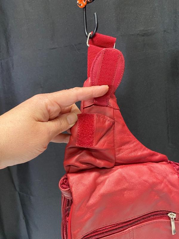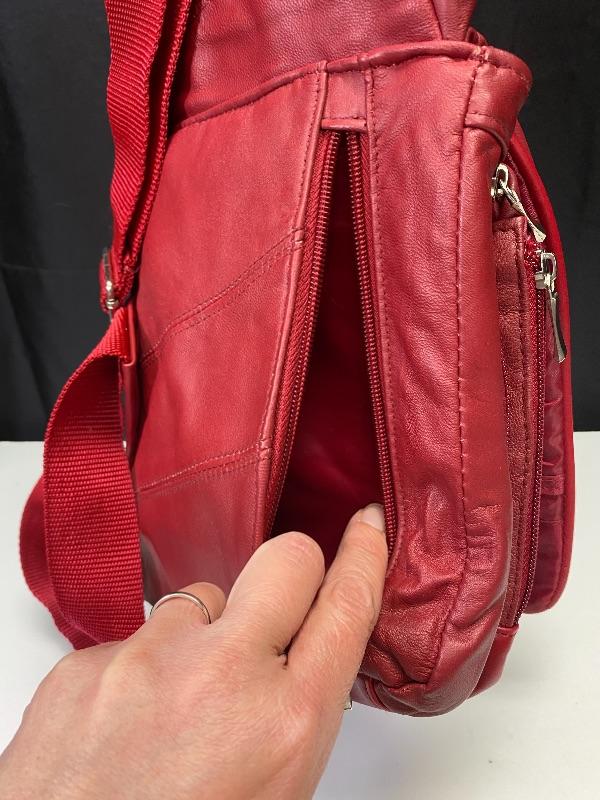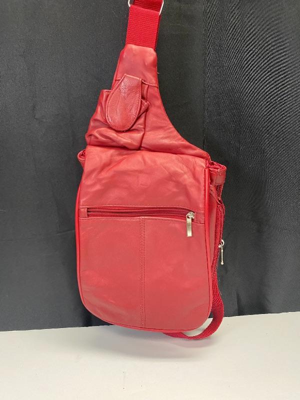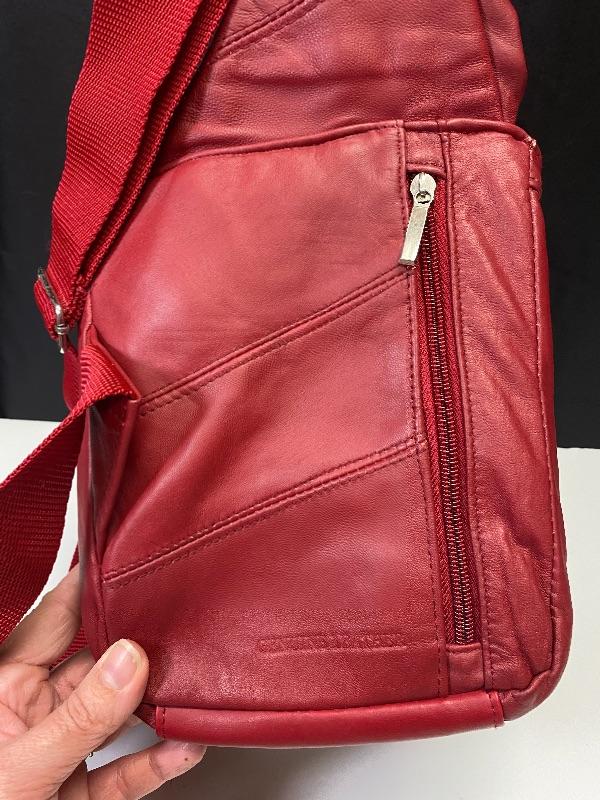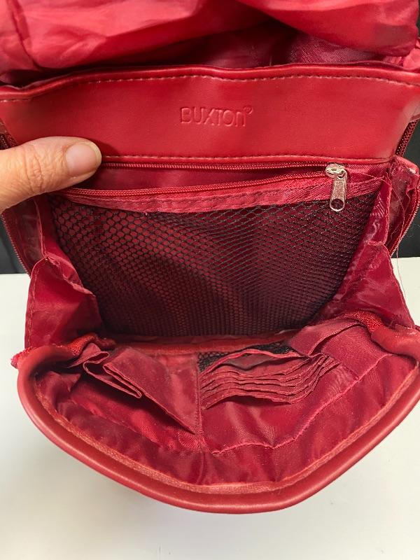 Red Buxton leather crossbody style bag. Adjustable strap, multiple pockets. Does have damage to the snap on the flap closure,