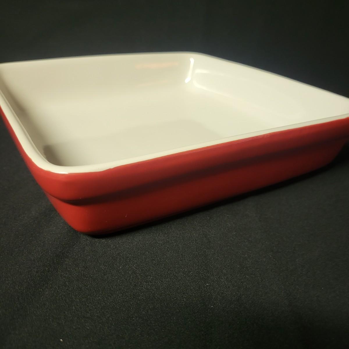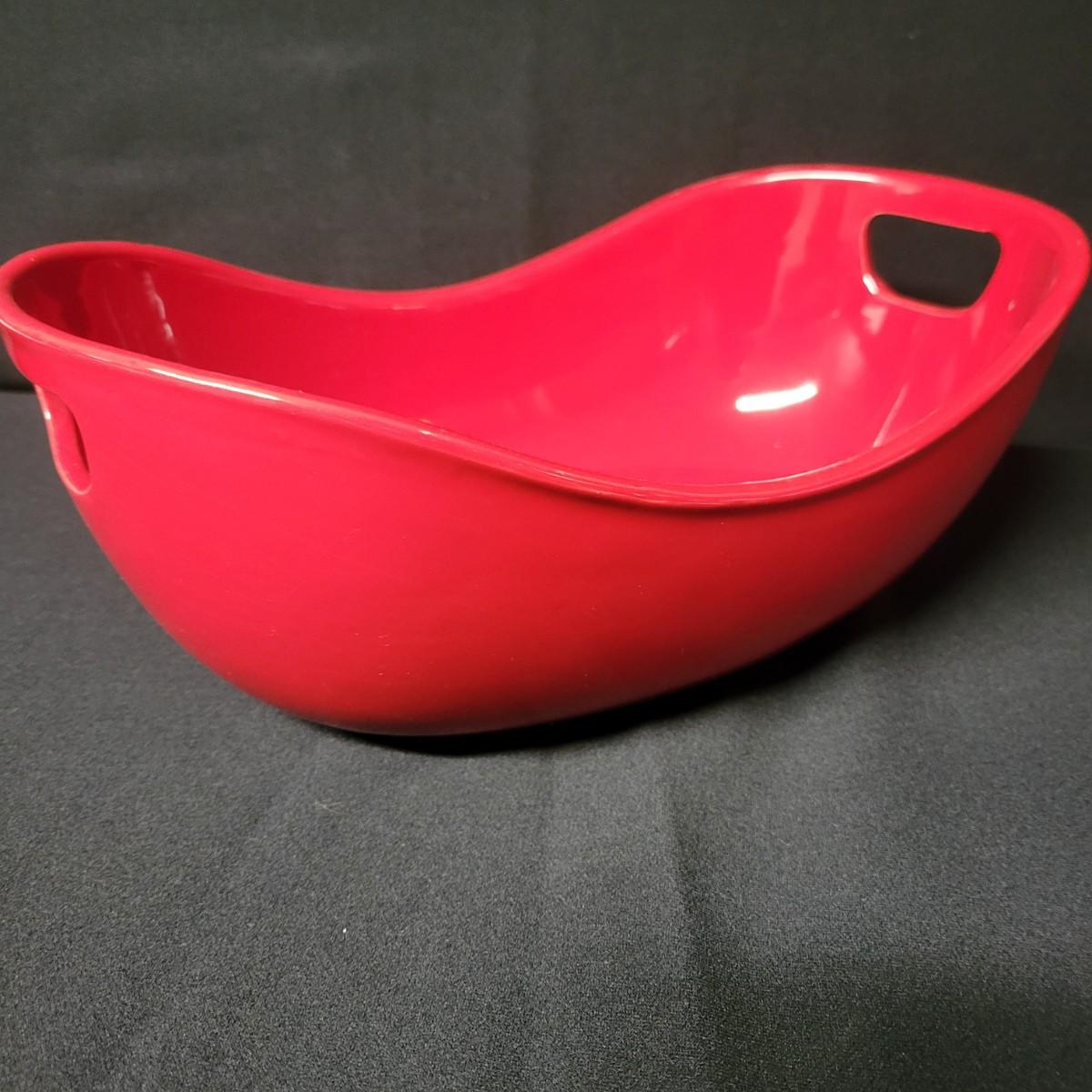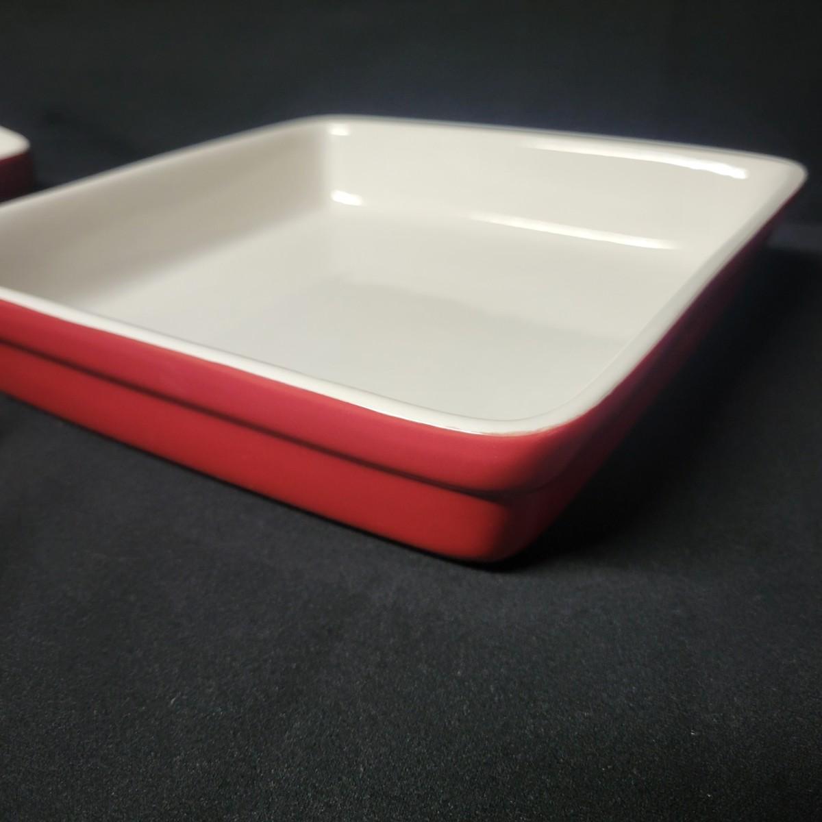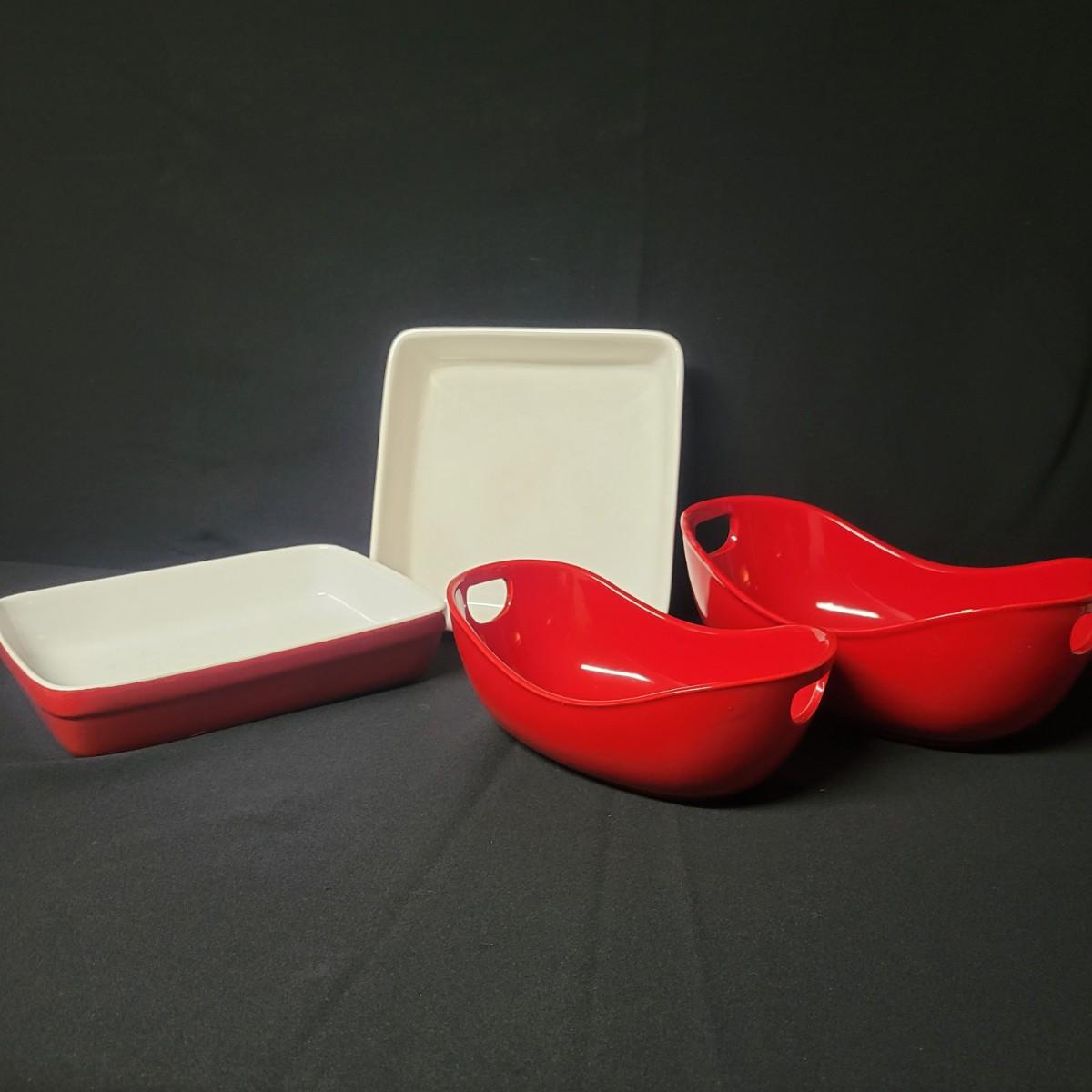 A set of 4 ceramic bowls in good condition. One piece does have a minor chip. See attached pictures for more detail. Two bowls are solid red with handles. The other two have a red exterior and a white interior. The largest square bowl measures approximately 10" x 2" Shipping available.