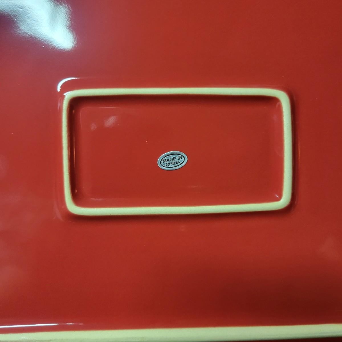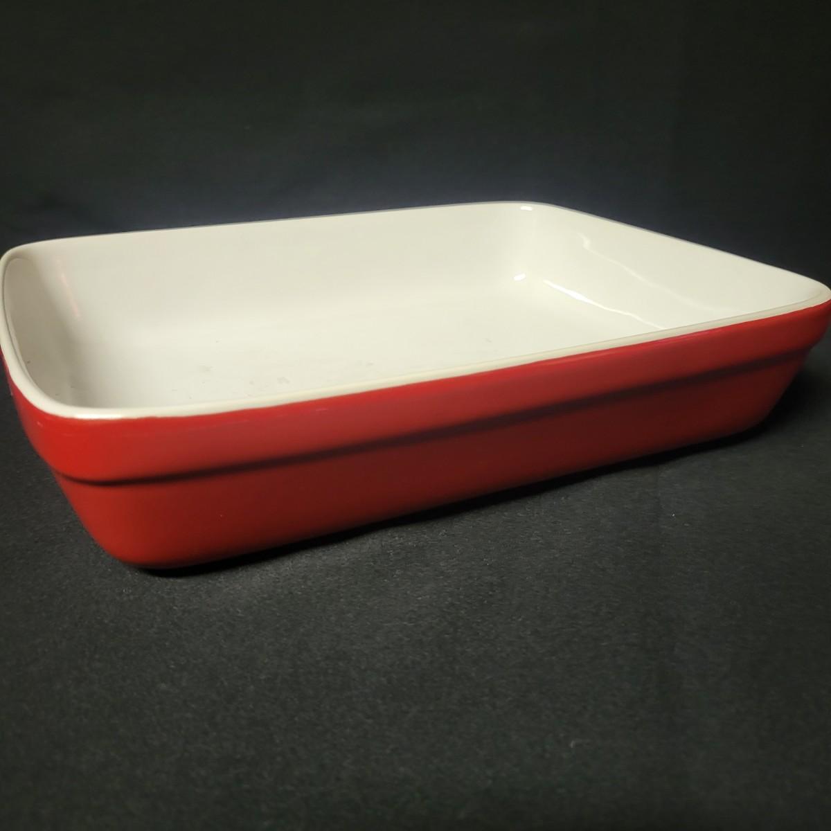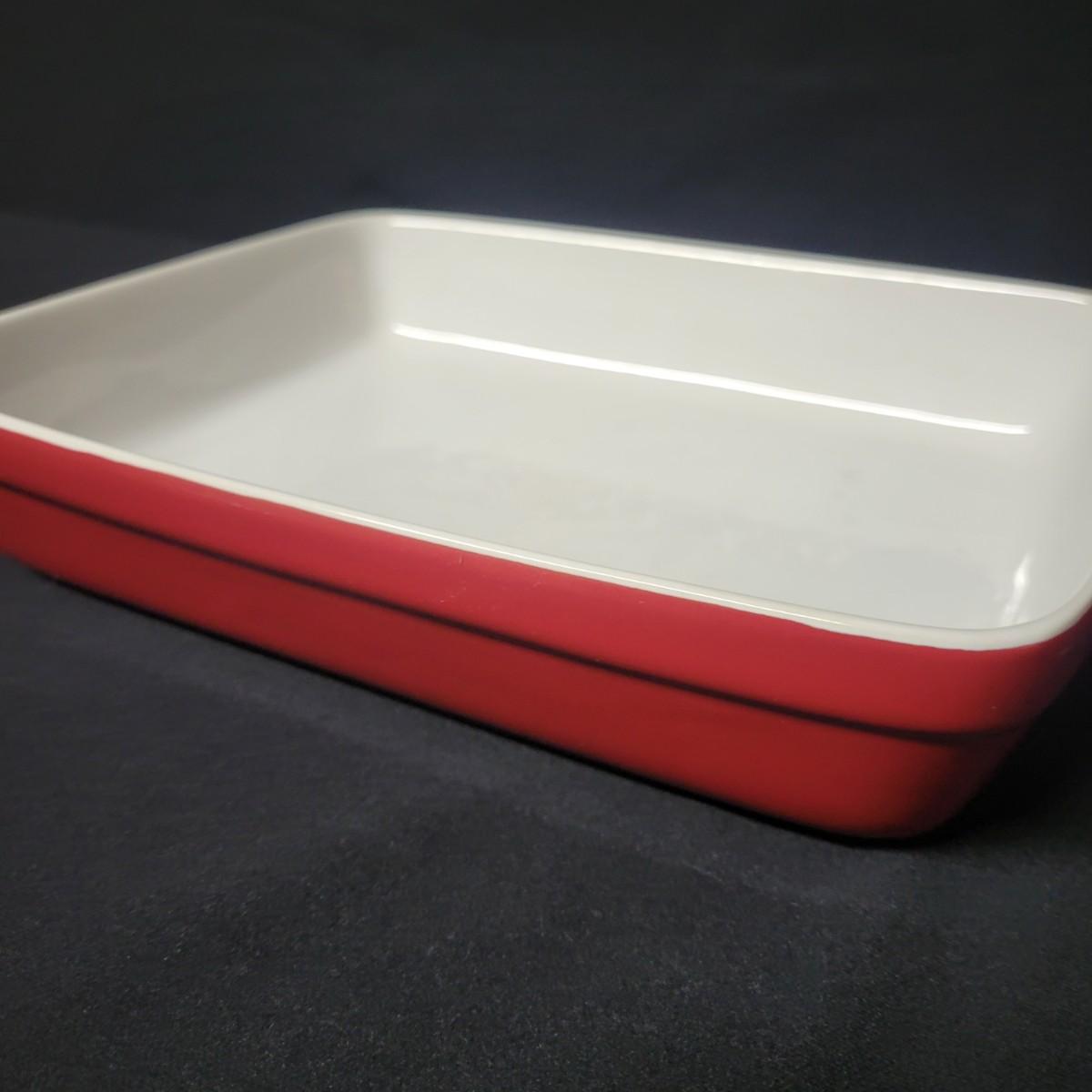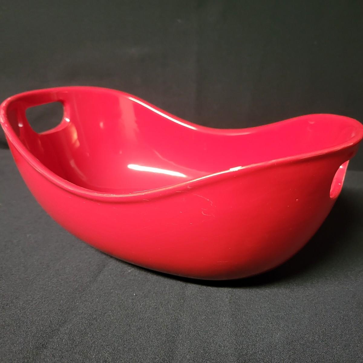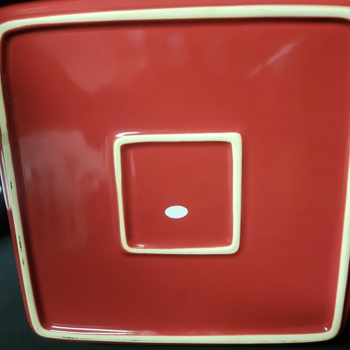 A set of 4 ceramic bowls in good condition. One piece does have a minor chip. See attached pictures for more detail. Two bowls are solid red with handles. The other two have a red exterior and a white interior. The largest square bowl measures approximately 10" x 2" Shipping available.