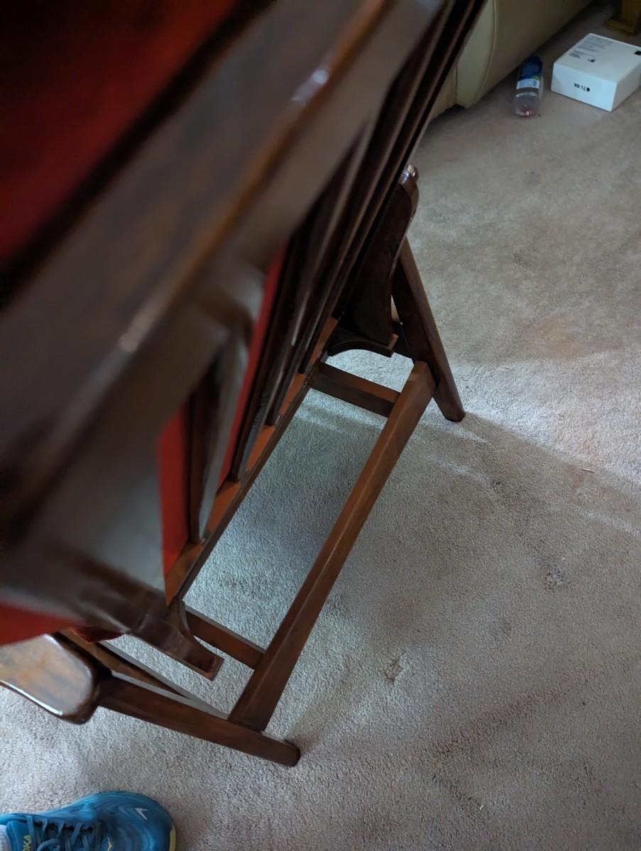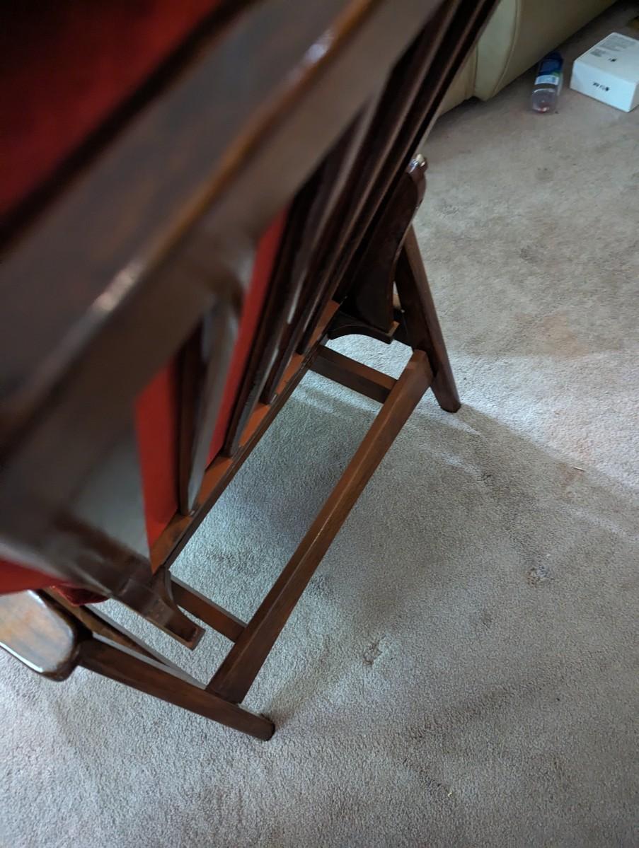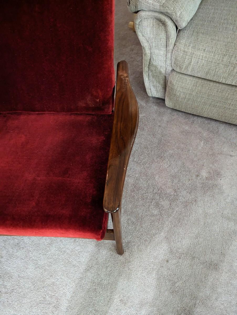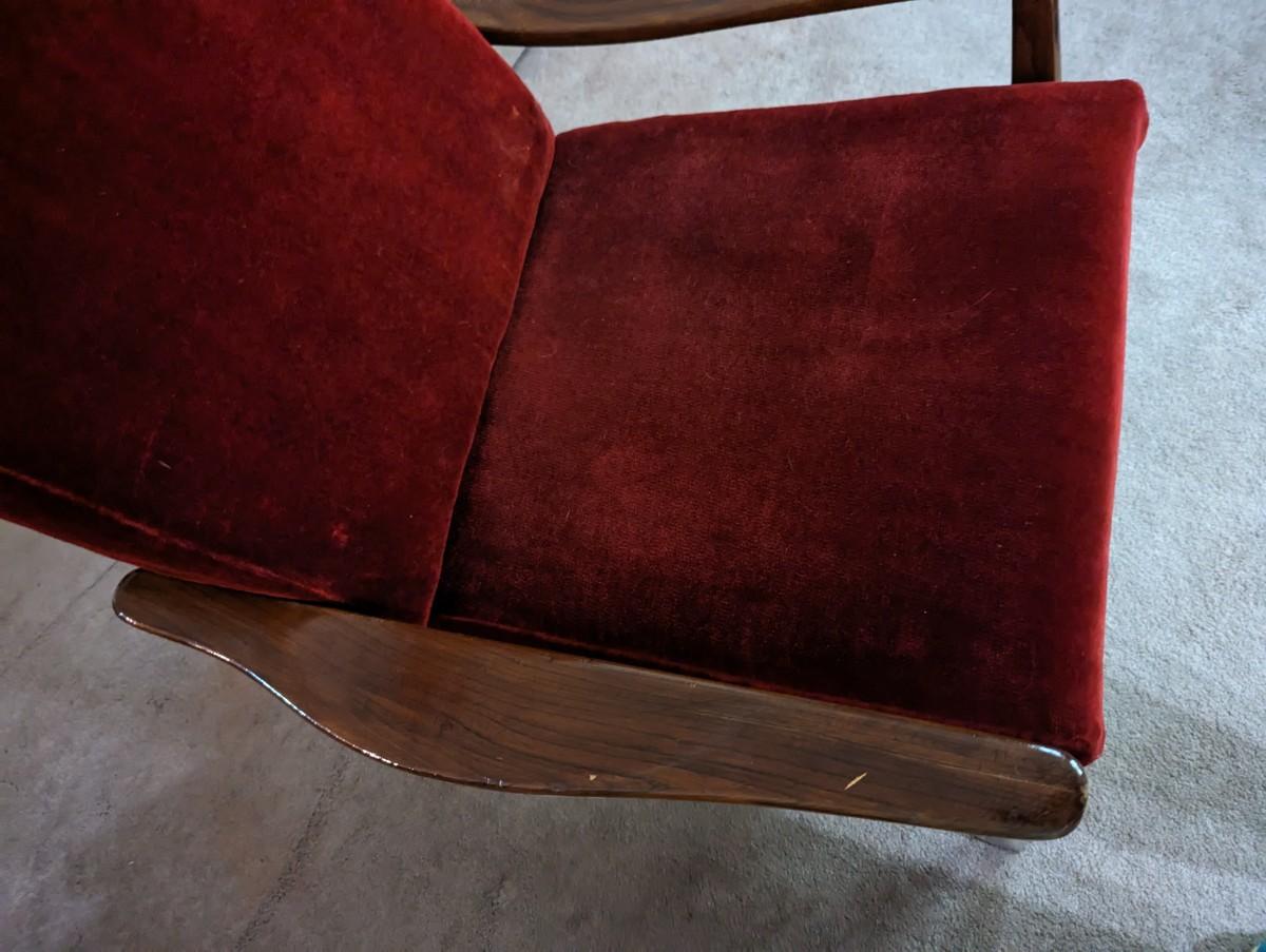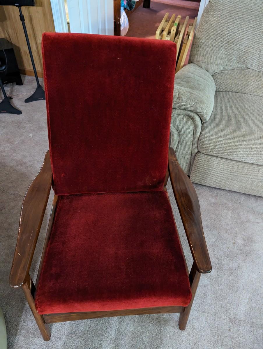 Red Chair Back Reclines/Rocks. Item is located in basement of home and will need to be carried up a flight of stairs.