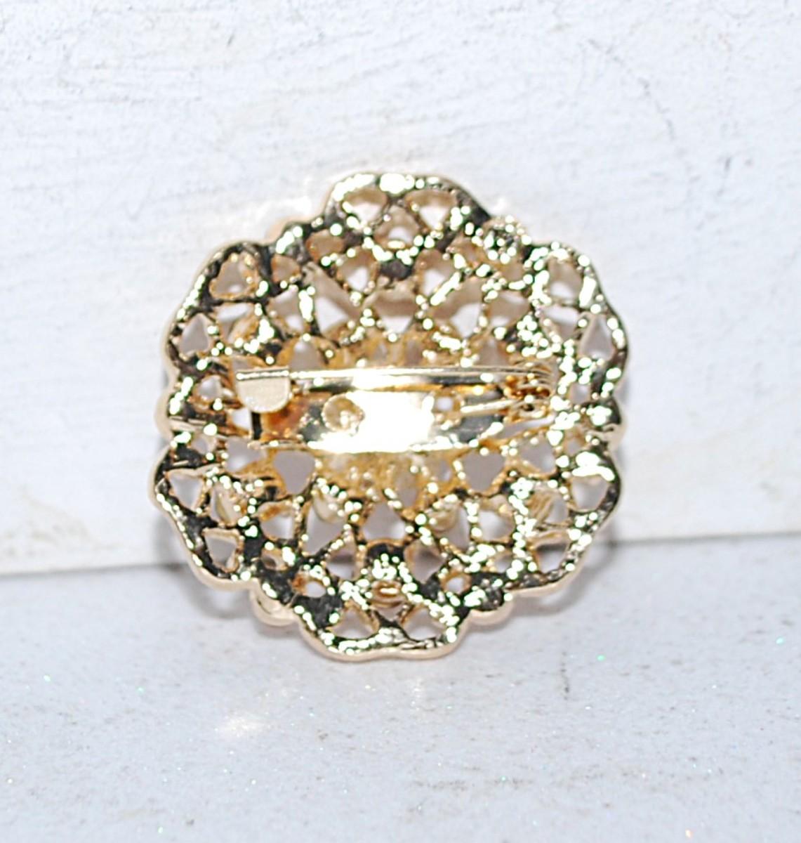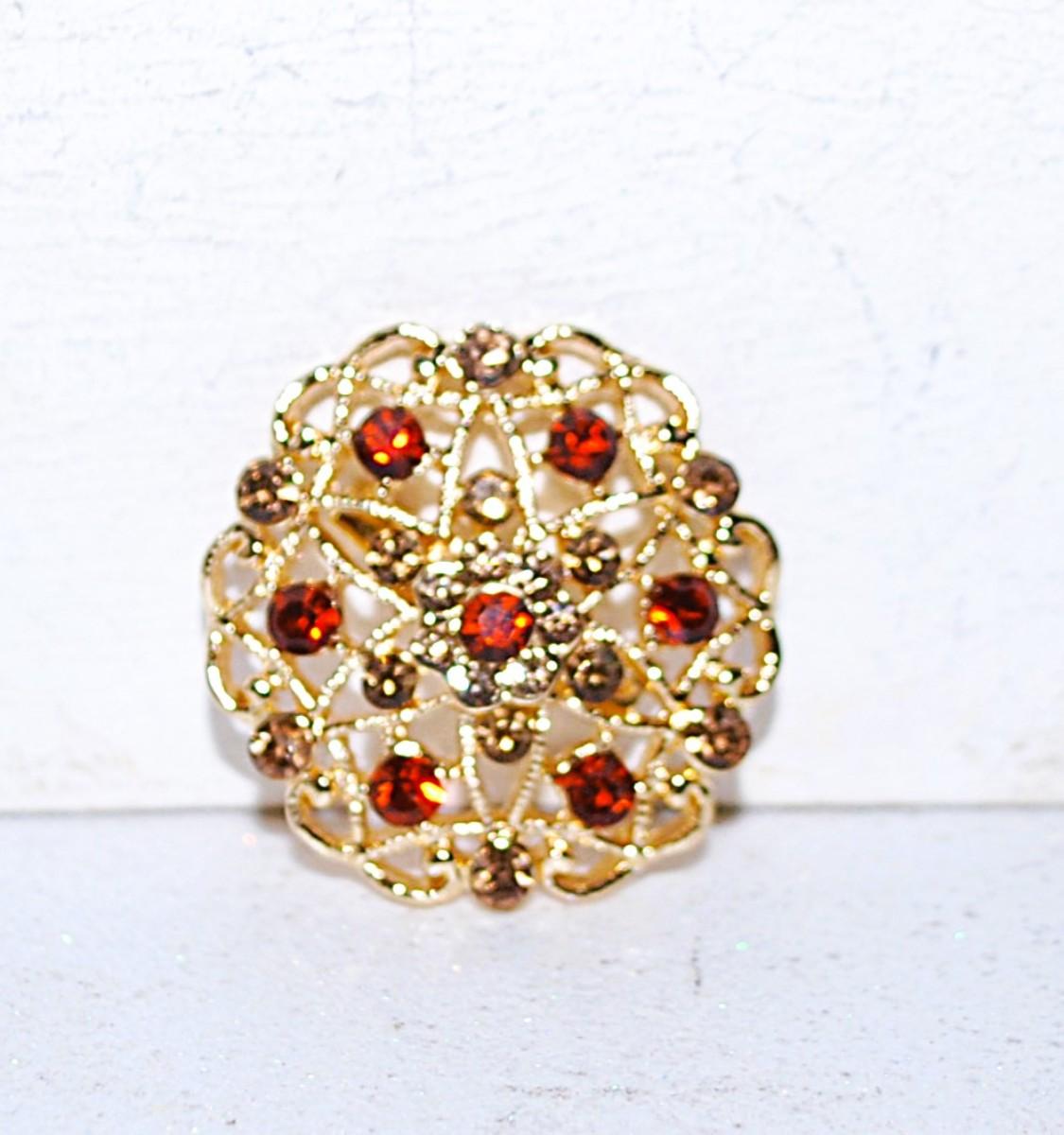 RED & CHAMPAGNE Colored Stones BROOCH (1¼" Diam.) with a Spider Web Grid on a Gold Tone Setting