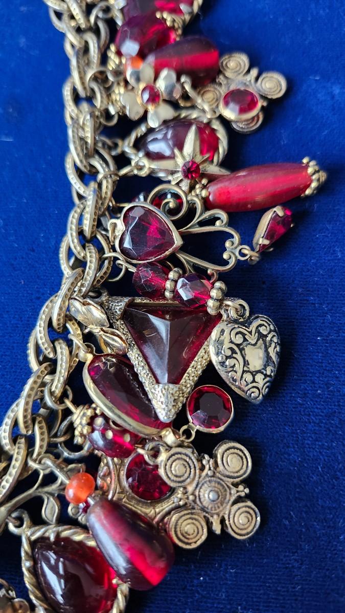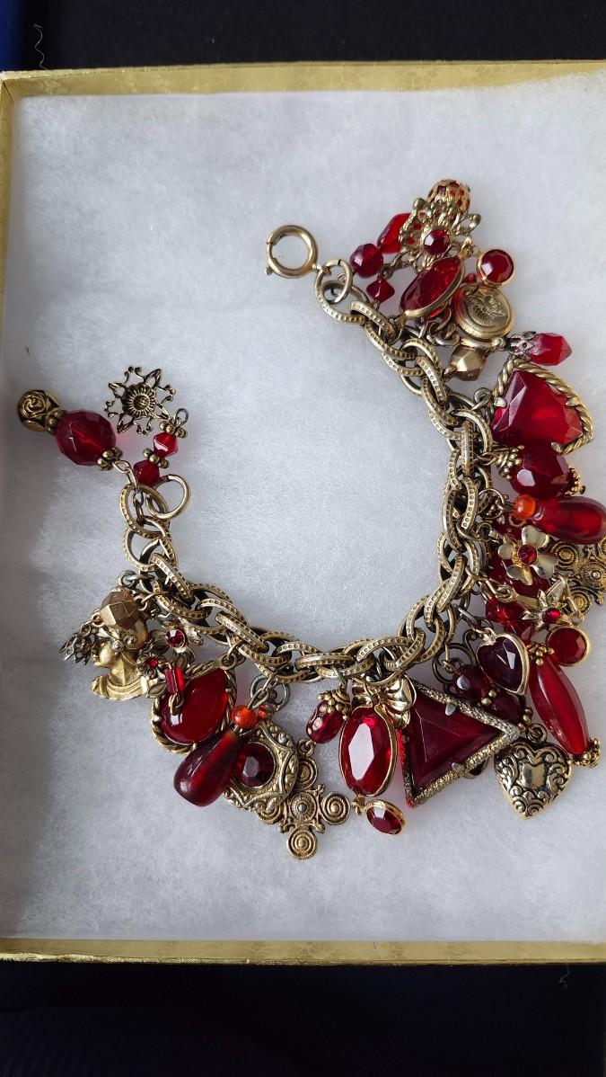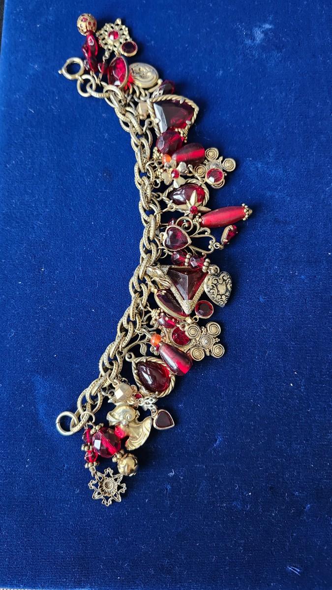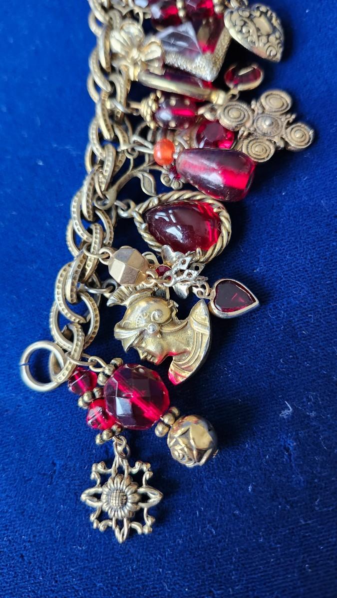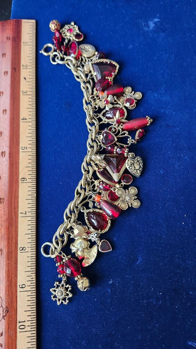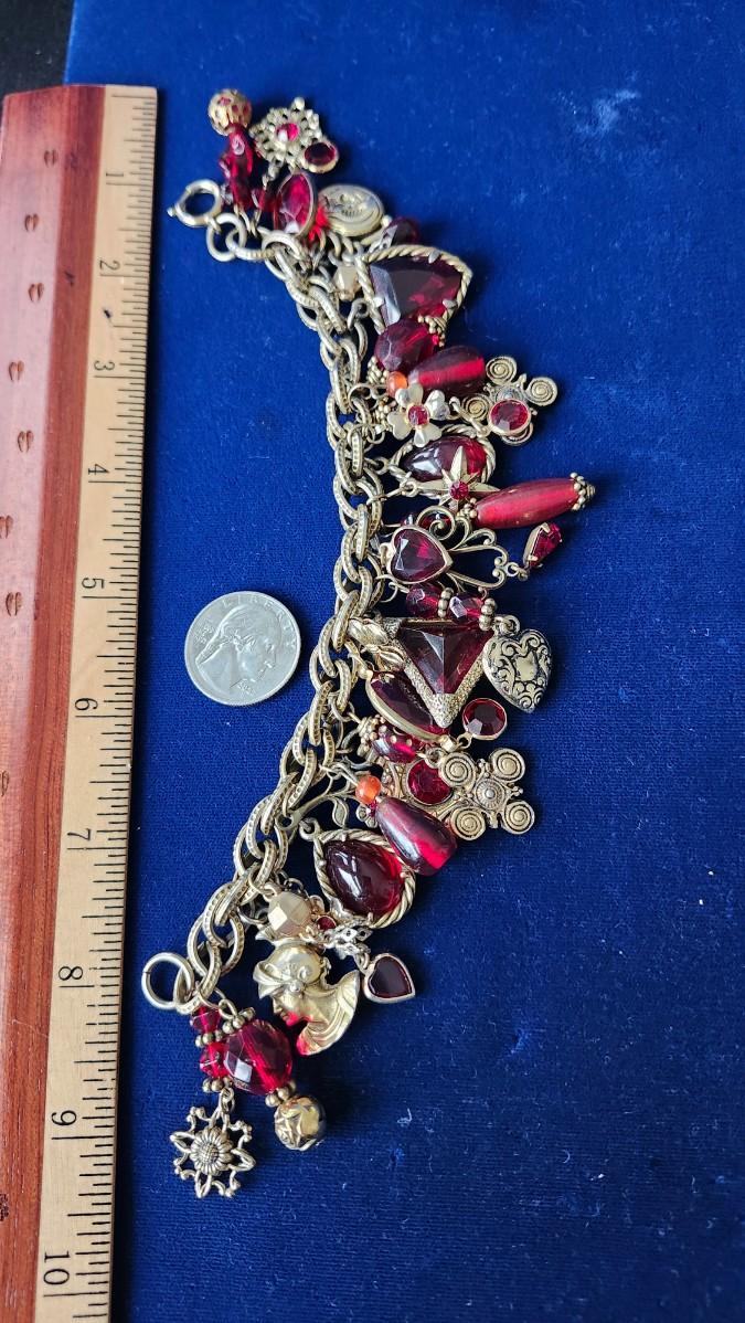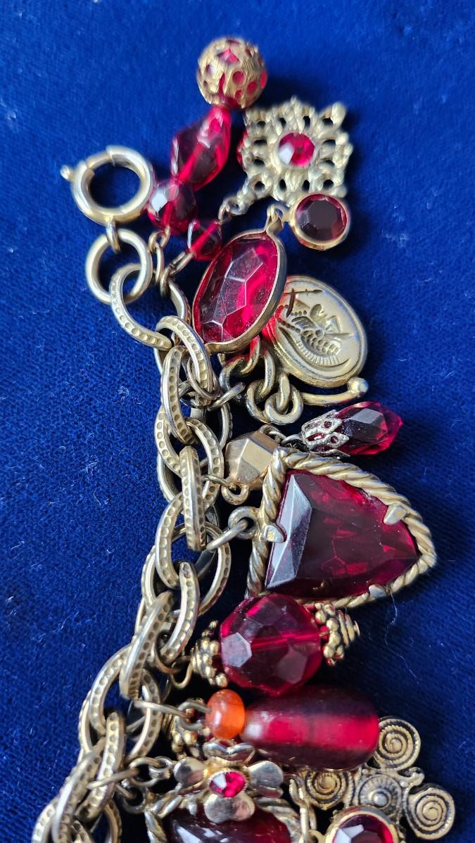 Red glass and brass tone charms with helmets, hearts, and flowers; 29 lovely charms on this bracelet.