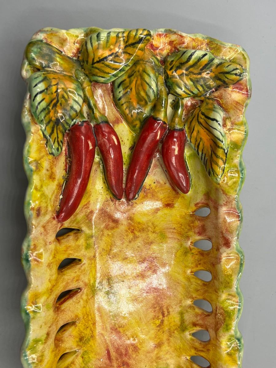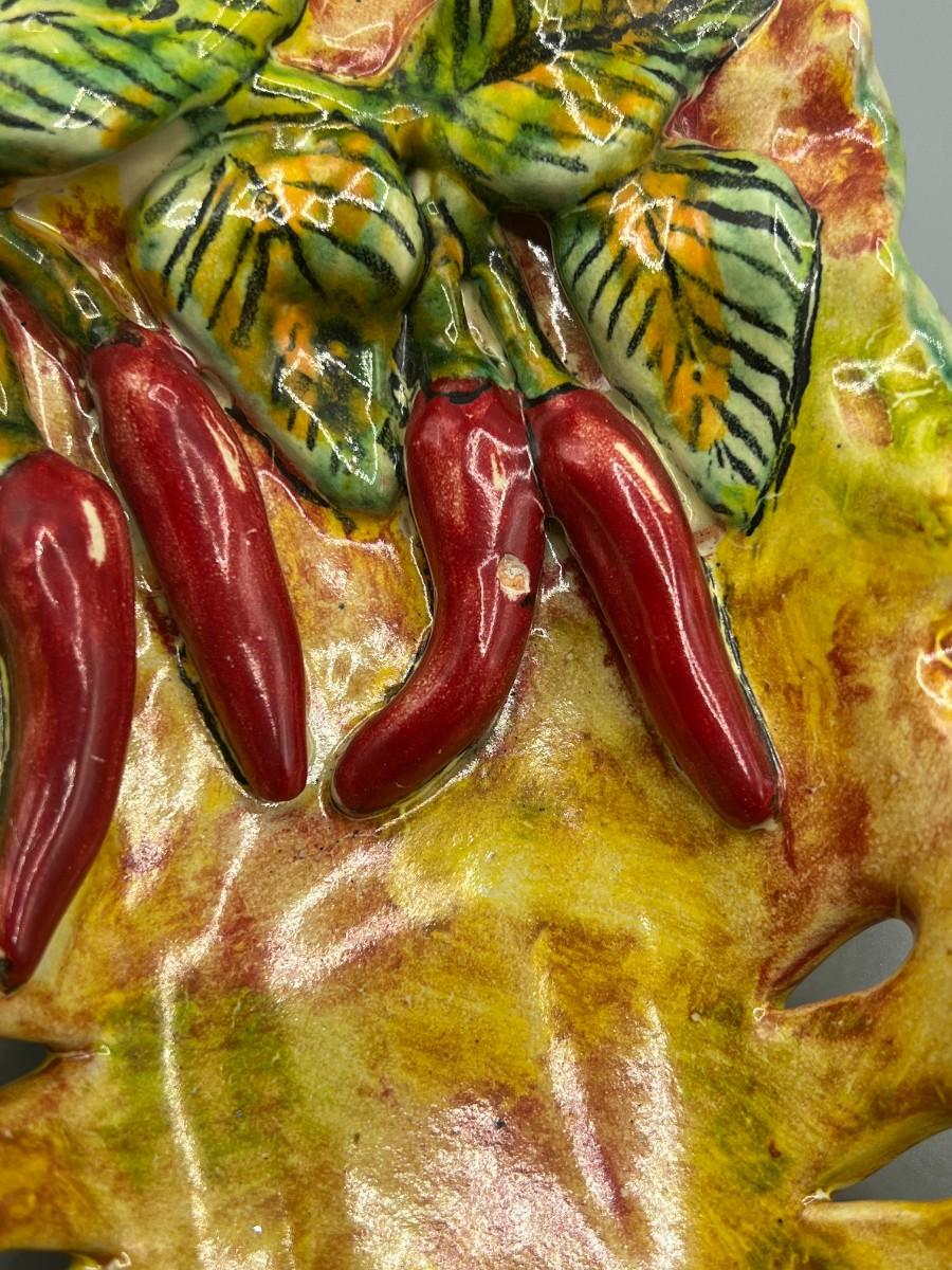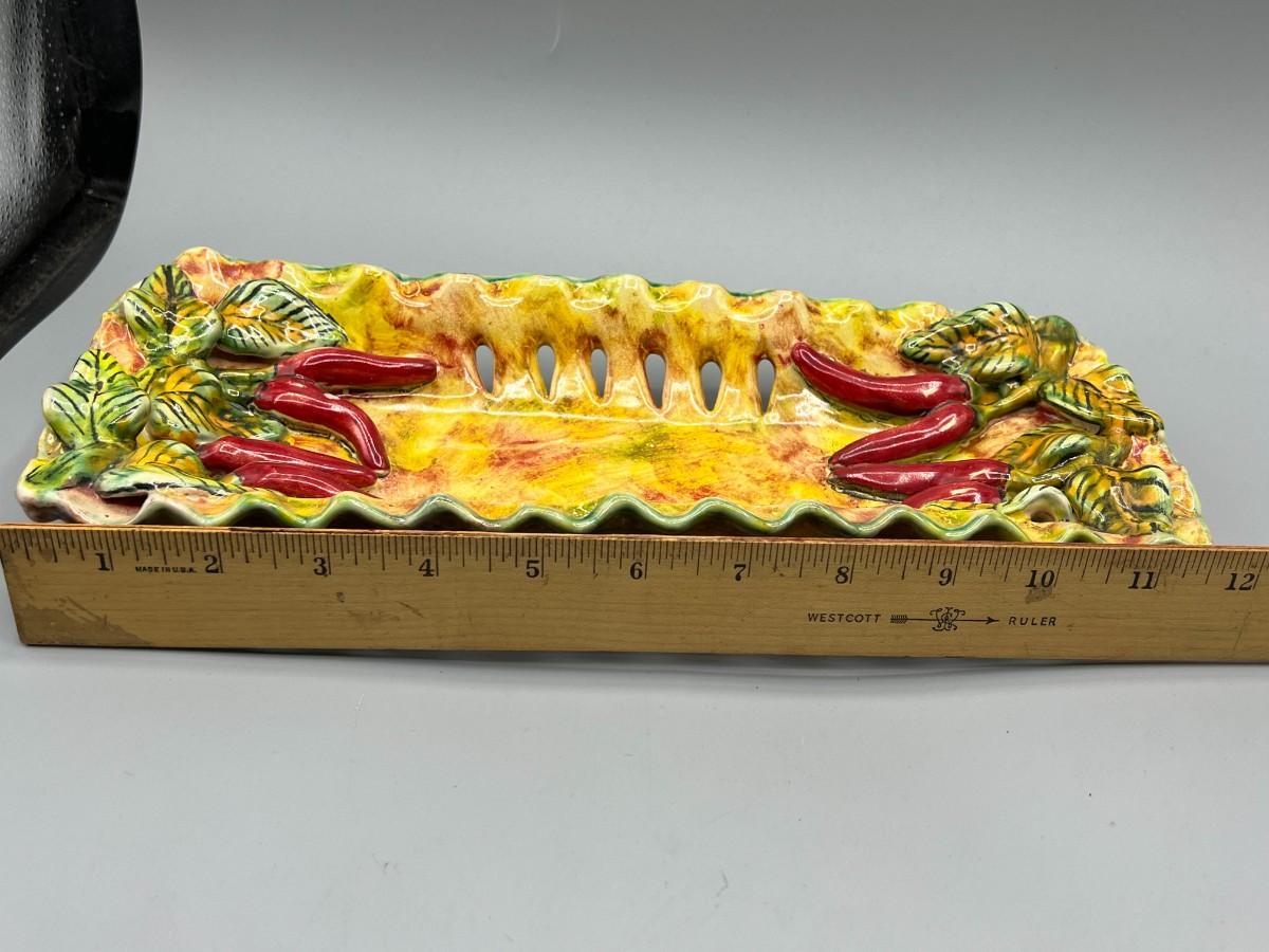 Vintage raised chili pepper design serving tray. Made in Mellado Mexico, hand painted majolica ceramic piece about 12" length. In good vintage condition.