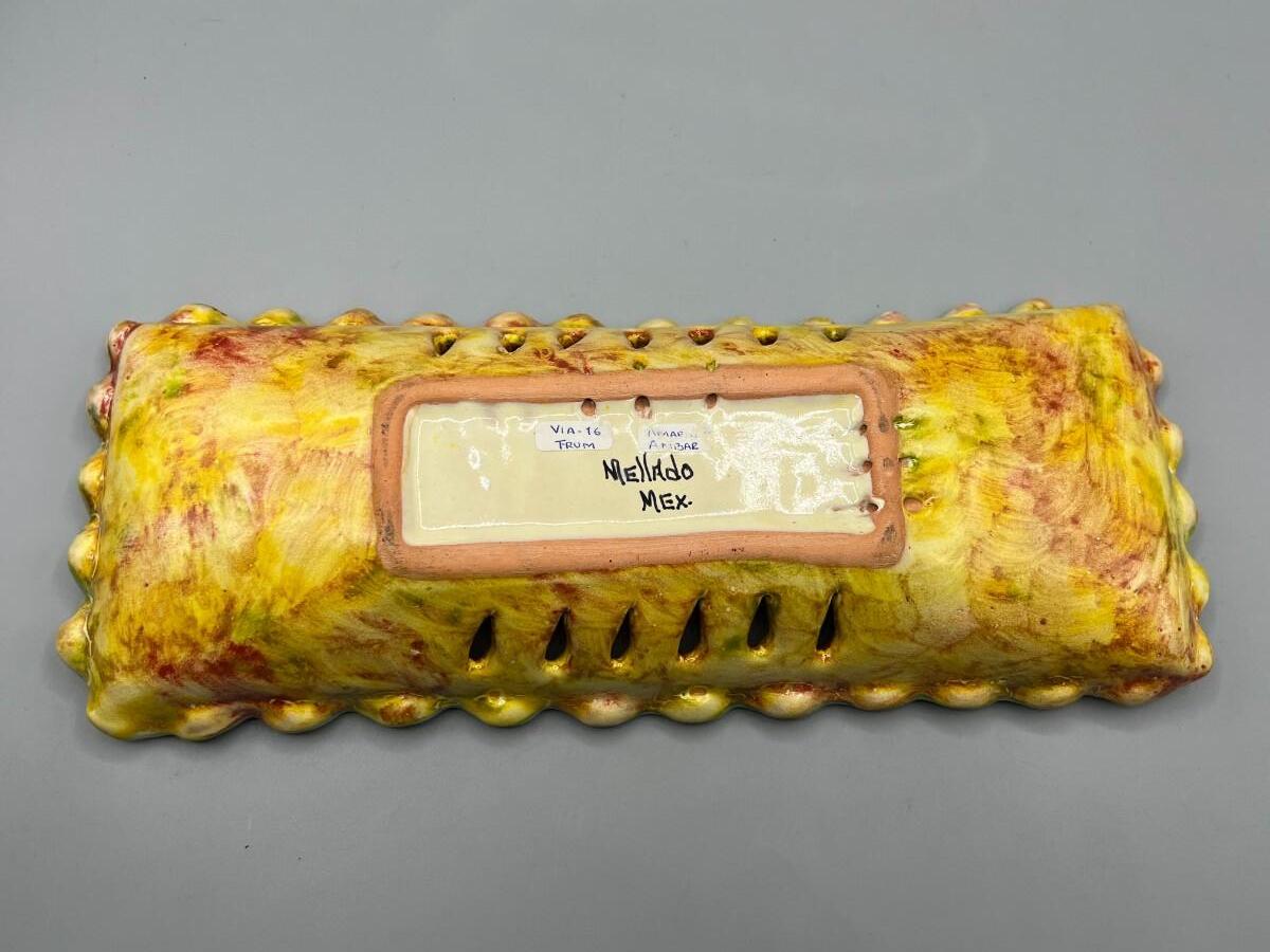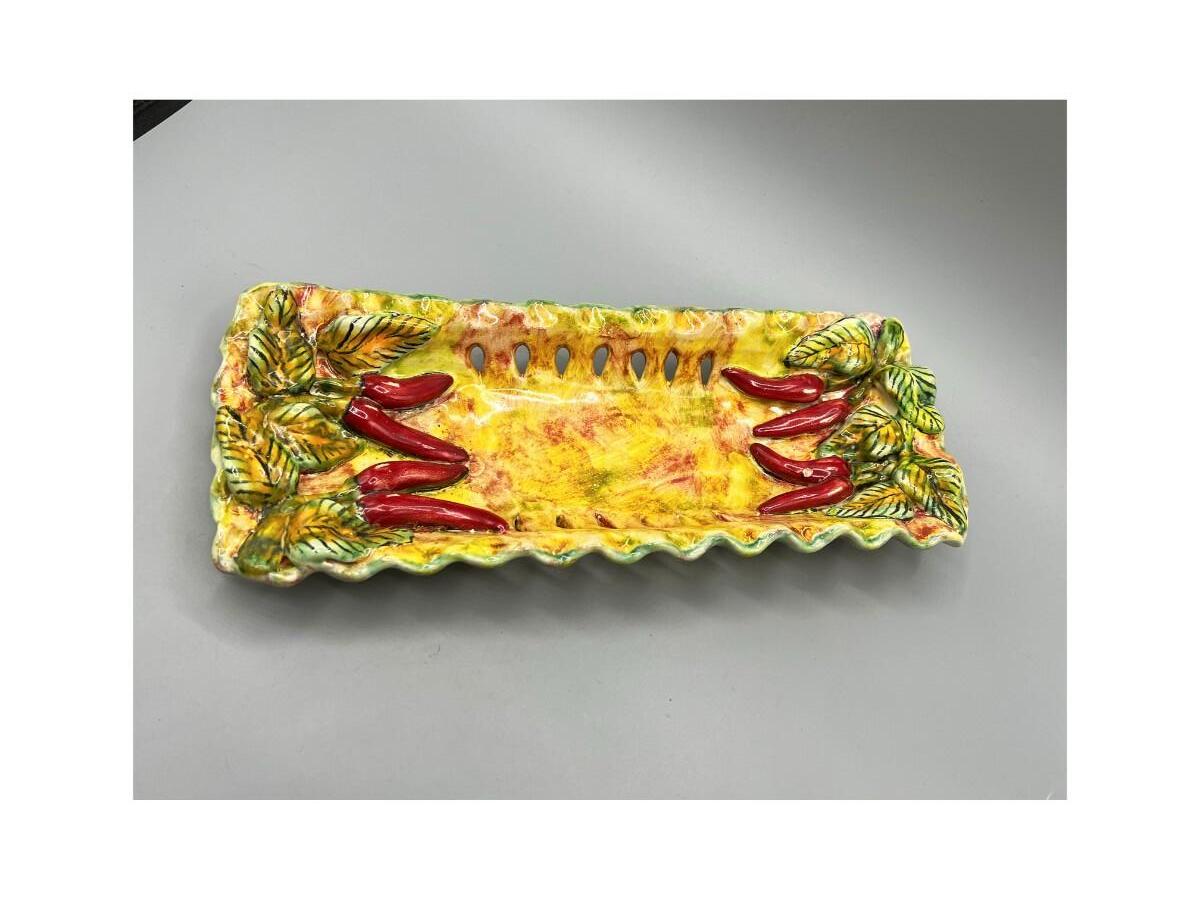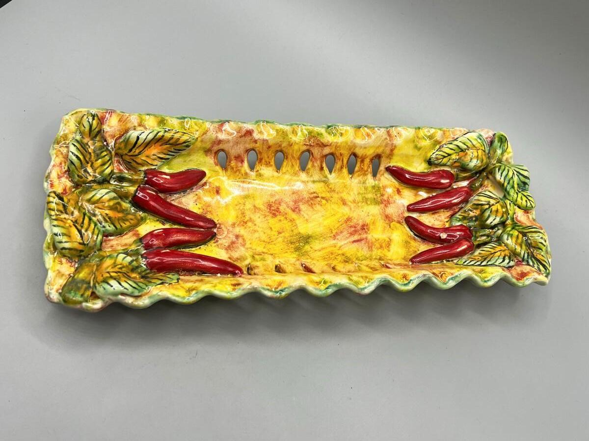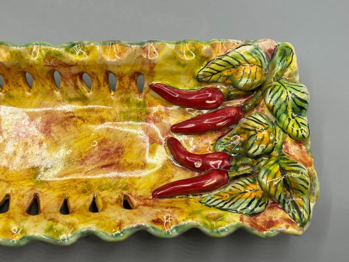 Vintage raised chili pepper design serving tray. Made in Mellado Mexico, hand painted majolica ceramic piece about 12" length. In good vintage condition.