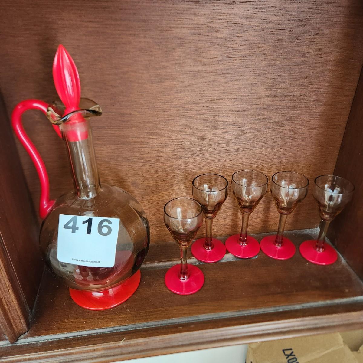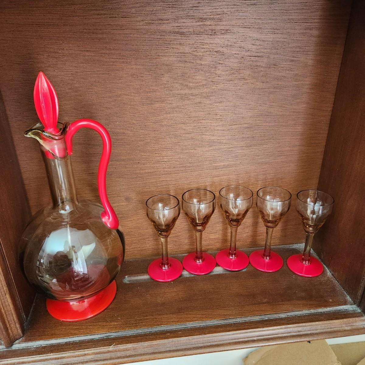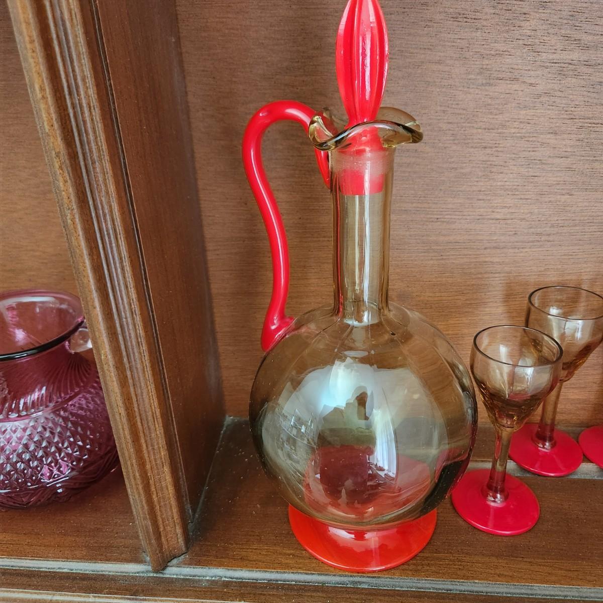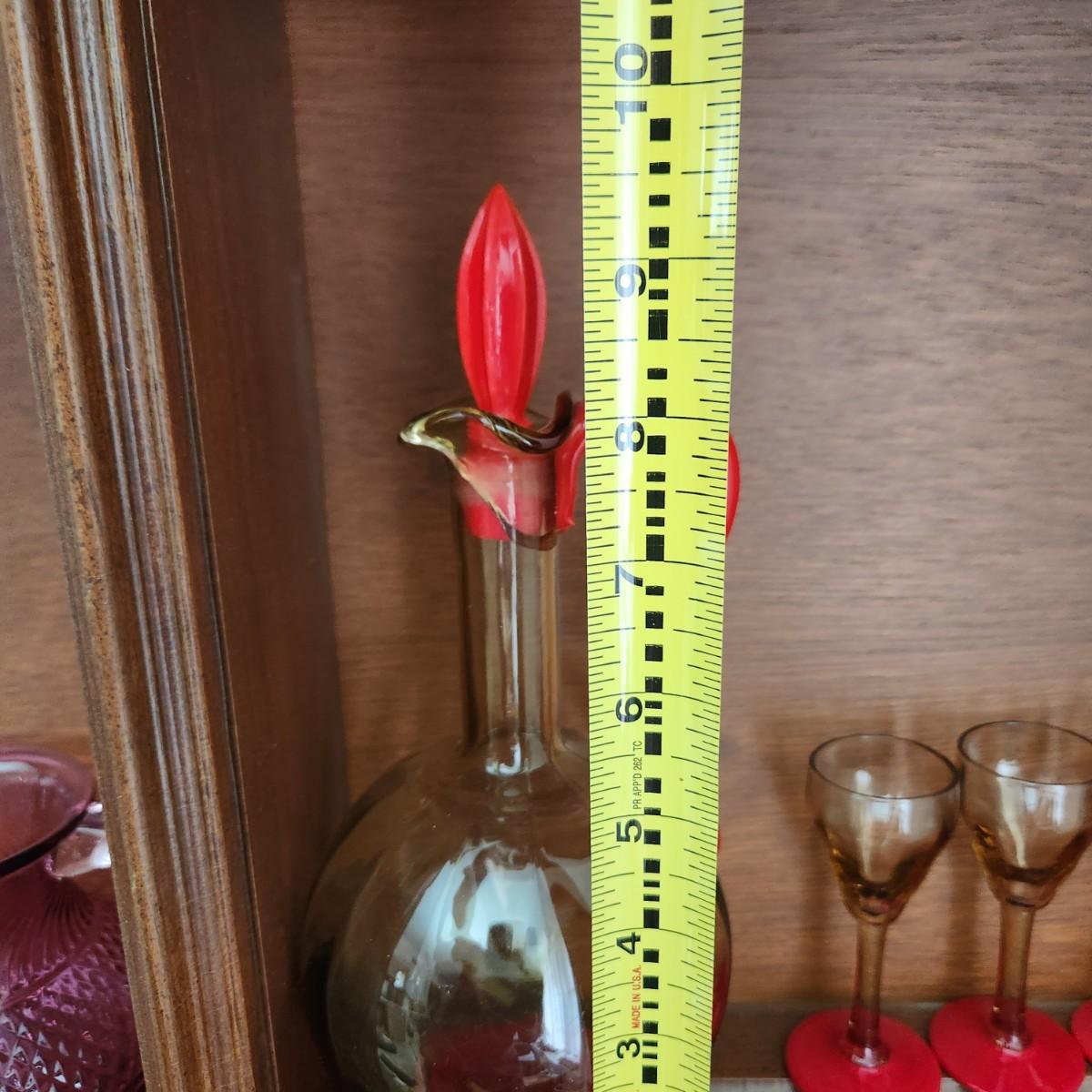 Red /Clear Glass Decanter w 5 Cordial Glasses