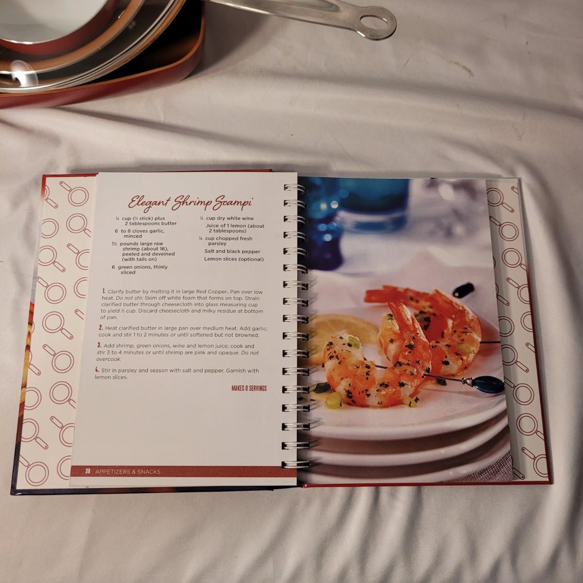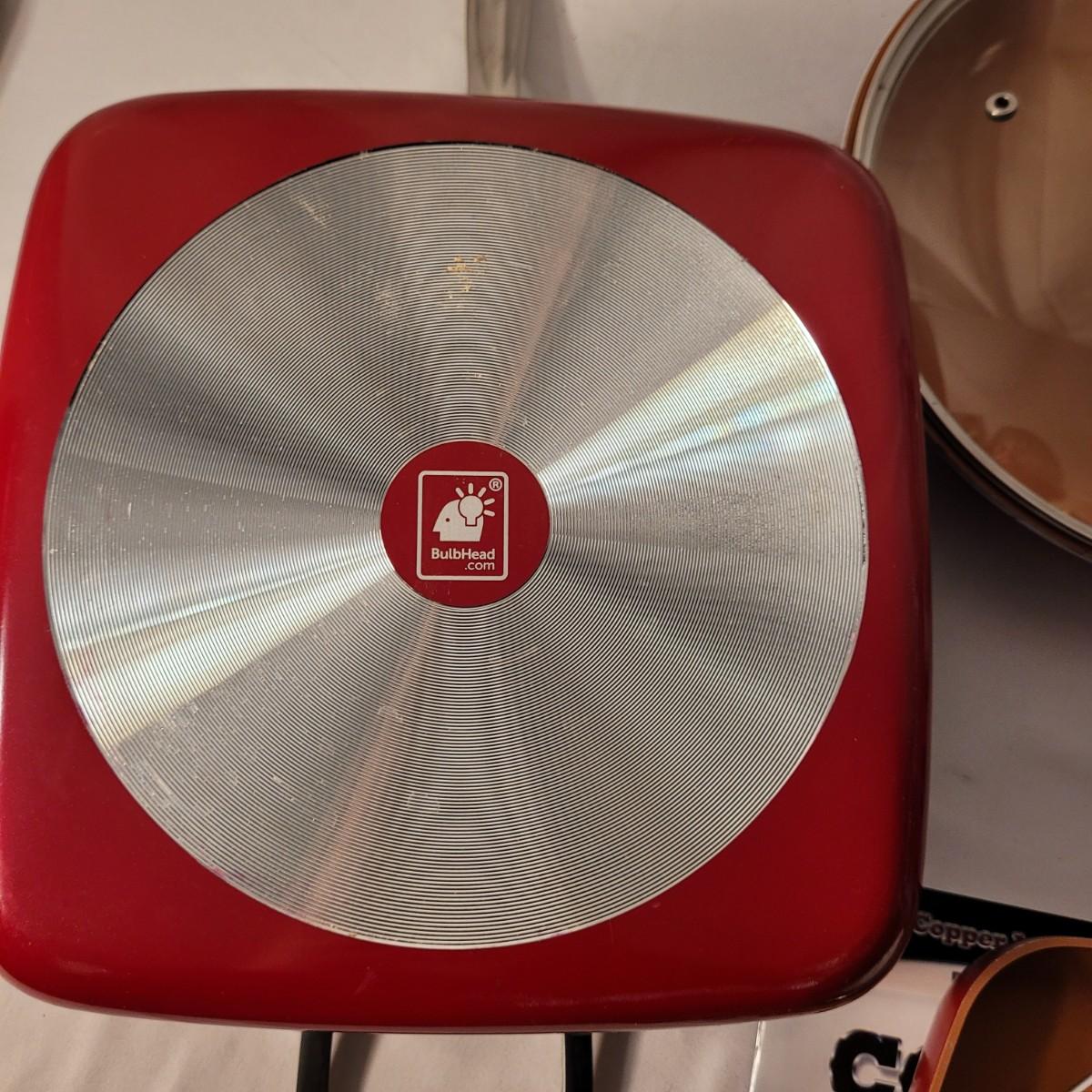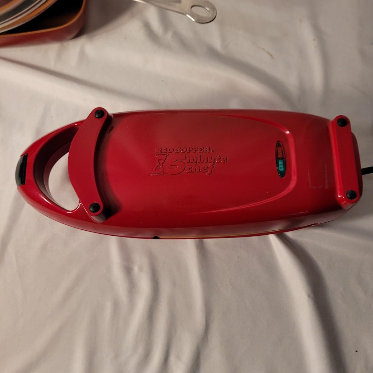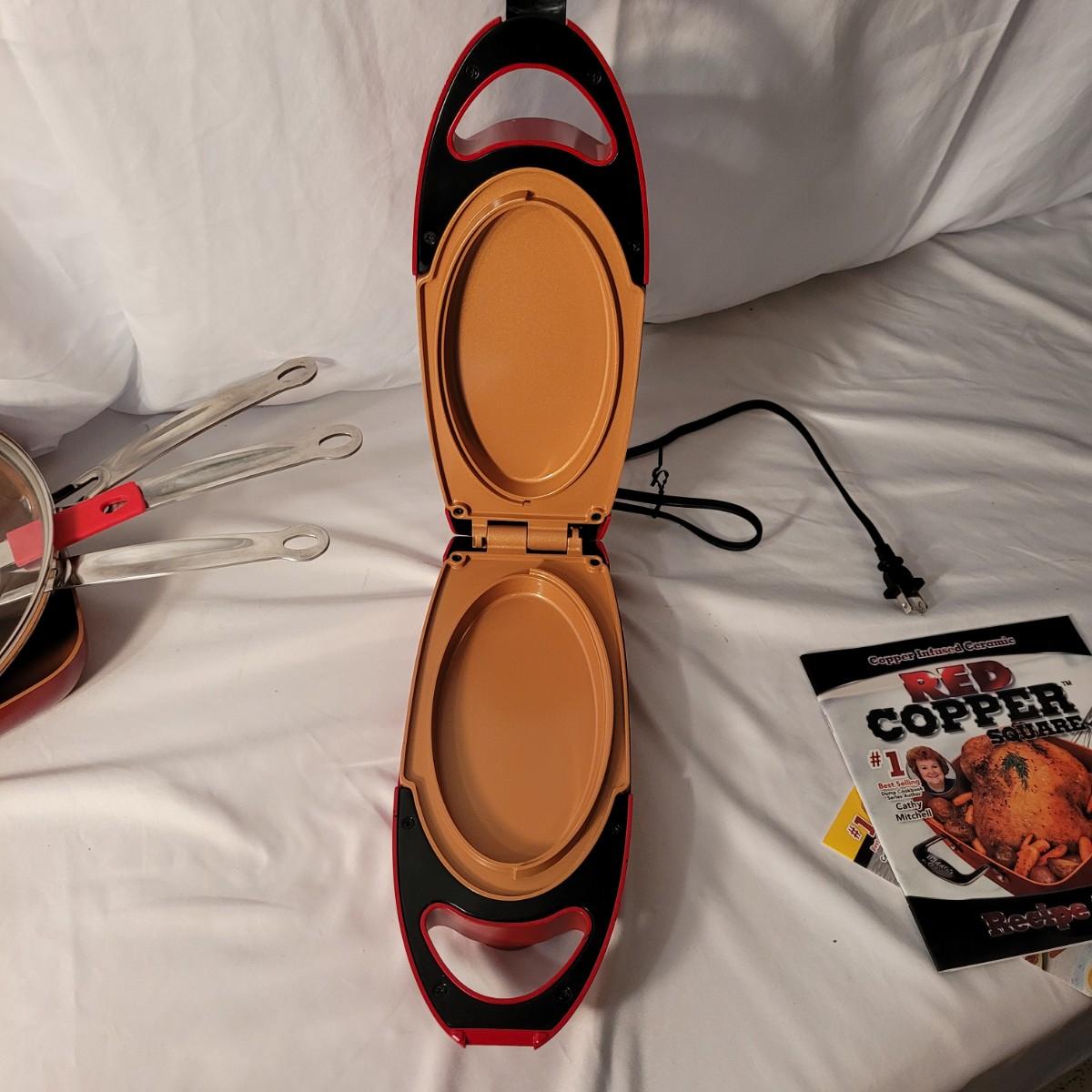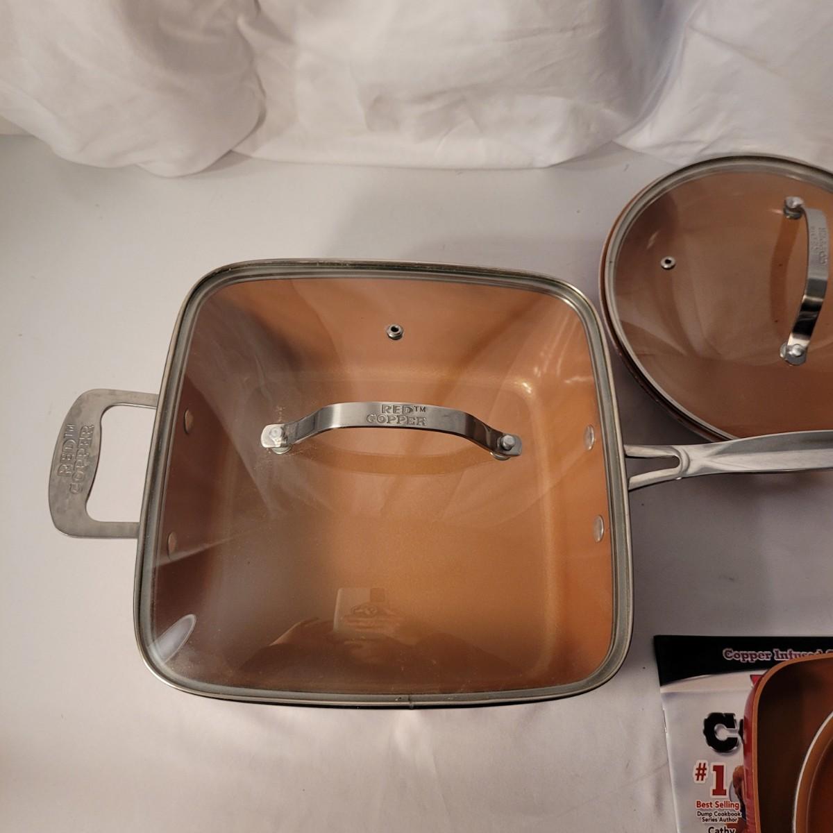 This Red Copper cookware collection includes a large square lidded pot and three pans (largest circular 10”D pan has lid). Also included is an electric 5 minute cooker. A variety of Red Copper cookbooks make this lot a great gift. Electric cooker powers on when plugged in. Shipping available.