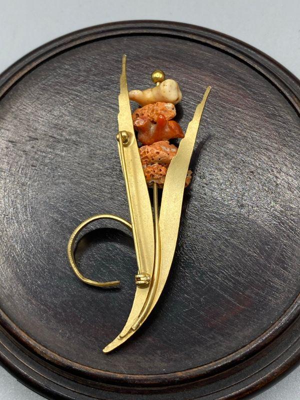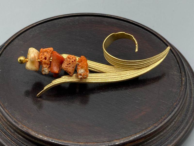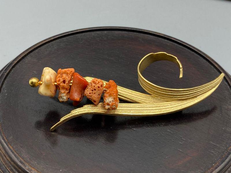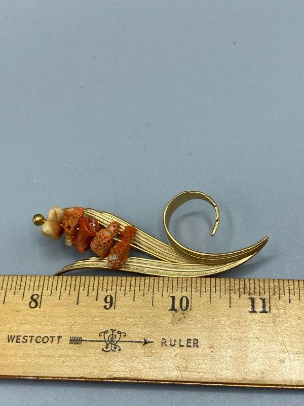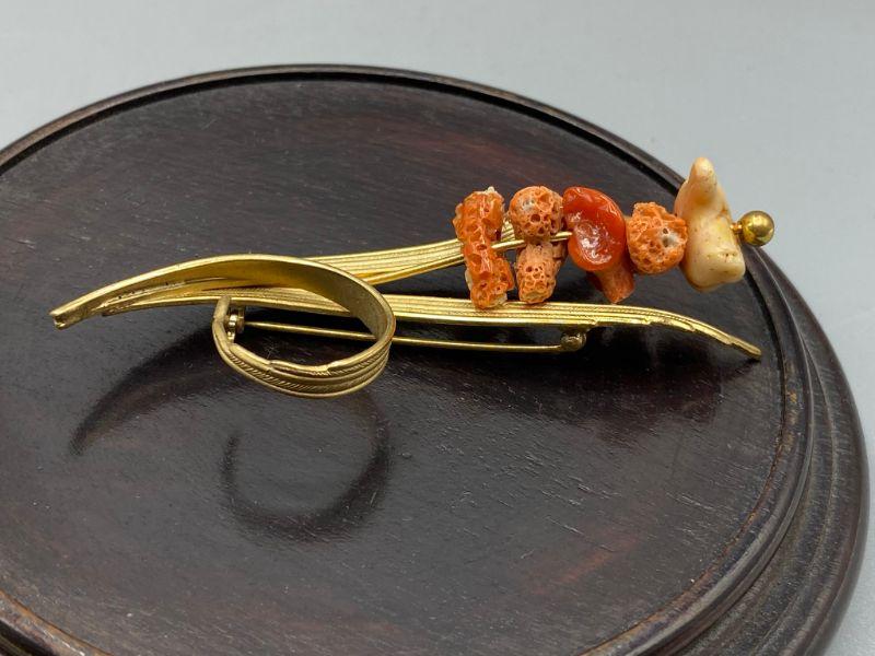 Red coral with a goldtone setting pin. Looks like a foxtail or reed. Rough stones. 3" size.
